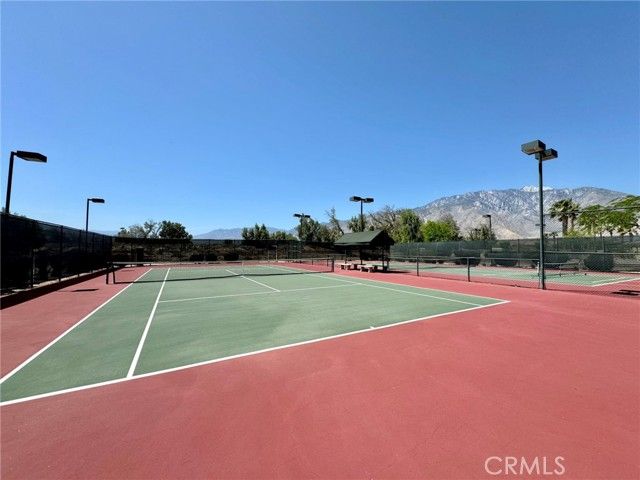 Welcome to the prestigious Four Seasons 55+ Community in Palm Springs! This beautiful, turnkey corner lot home offers 2,288 square feet of living space, featuring 2 bedrooms, 2 bathrooms, and a den that can be used as an office or easily converted into a 3rd bedroom. The property also includes an attached 2 car garage, perfect for parking and additional storage. Enjoy the resort-style amenities that come with living in the gated Four Seasons, including a lodge with activities, fitness center, sports courts, bocce ball, community pools and spas, barbecue areas and much more. This single-level home boasts white shutters throughout, a new air conditioner, water softener and a double front door that opens into a grand entrance. The kitchen is spacious and modern, featuring caesarstone countertops, breakfast bar, built-in refrigerator and upgraded appliances. The primary suite offers a walk-in closet, en suite bathroom with dual sinks and a separate shower and tub. It also features a custom built-in bookcase with cabinets right outside the doors of the primary suite. Both bathrooms feature multiple upgrades as well. Relax and unwind in the backyard with a covered patio and a flagstone seating area while looking at the stunning mountain views. Enjoy the low maintenance landscaping in b