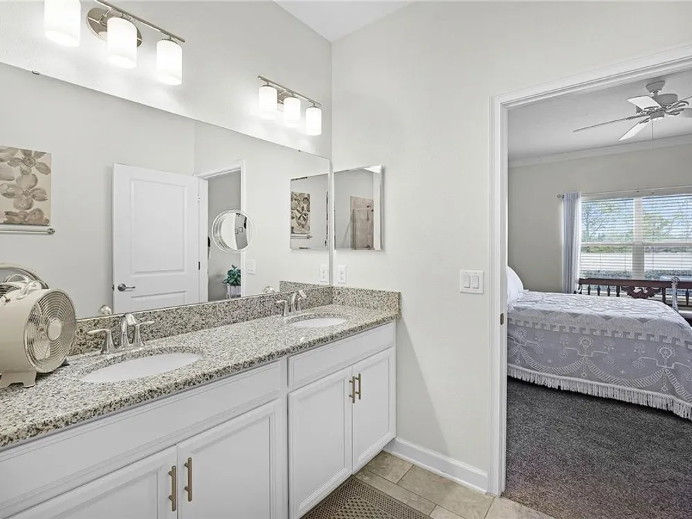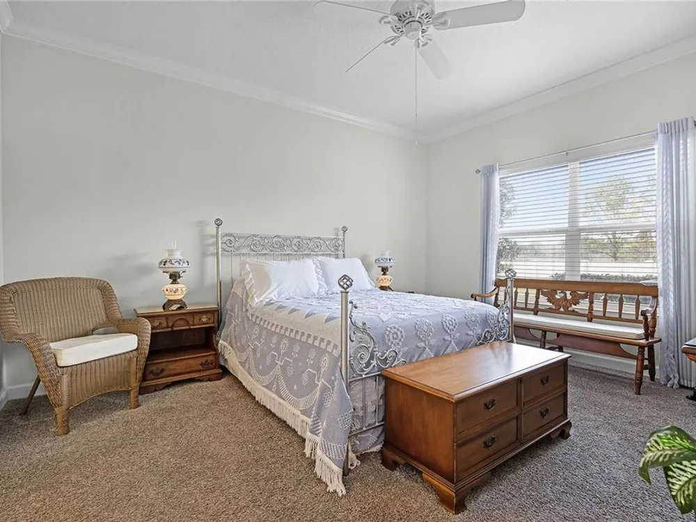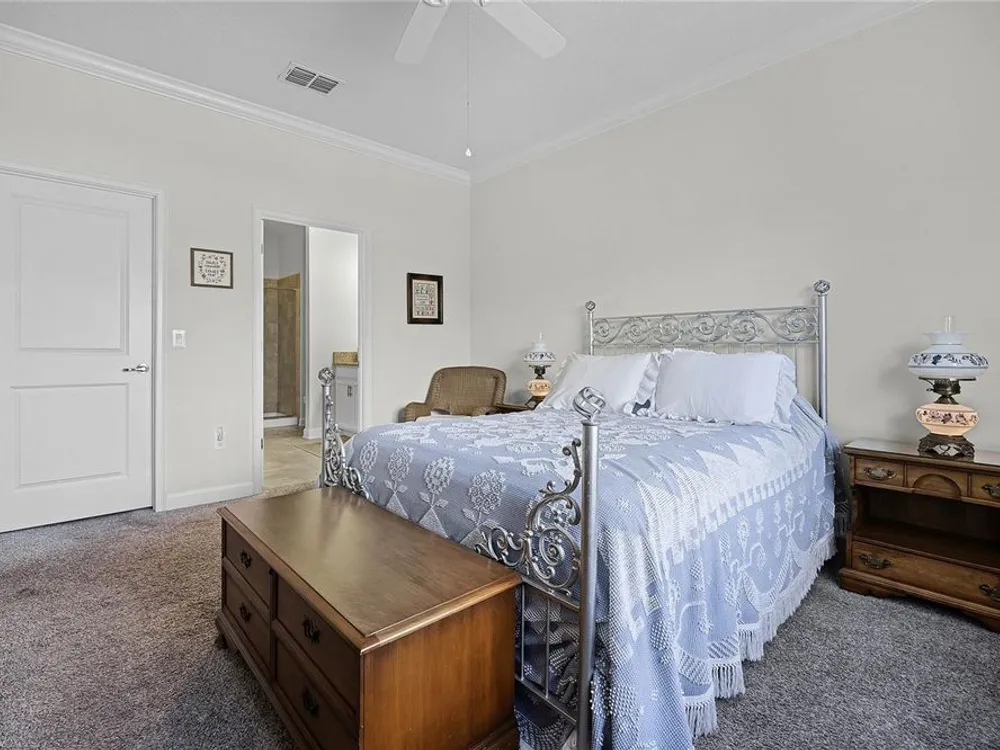 - Ceiling Fan(s), Crown Molding, Open Floorplan, Main Level Primary, Split Bedrooms, Stone Counters, Thermostat
