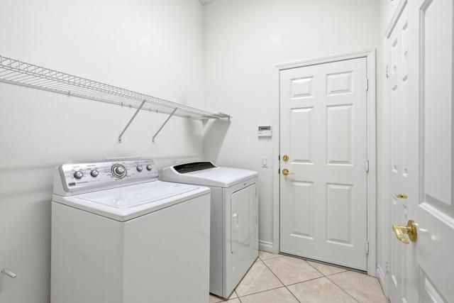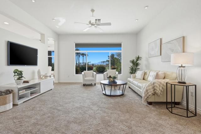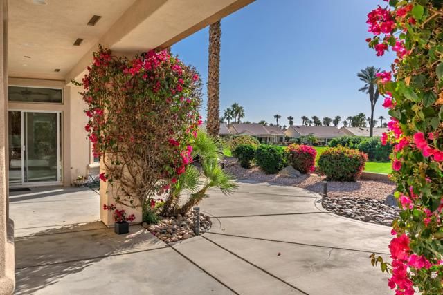 Sun City Palm Desert - Tangier. Located a short distance to the Lakeview Recreation Center, , this extended Tangier floorplan offers one of those views that stops you in your tracks. Positioned to capture spectacular southeast-facing vistas down the long par-5 7th fairway, the setting delivers sweeping panoramas of the golf course, surrounding mountains, and over 100 palm trees. The rear yard is designed for relaxed desert living, featuring a spacious patio with multiple seating areas--perfect for entertaining or simply soaking in the scenery. Out front, a gated courtyard with patio adds both curb appeal and function, surrounded by lush desert landscaping accented with mature palms. Inside, 10-foot ceilings and transom windows create a light, open feel throughout. Diagonal-laid tile flooring is used extensively, enhancing the home's clean, cohesive design. The kitchen is well appointed with extensive raised-panel cabinetry, inset glass accents, pull-out shelves, corian countertops, a breakfast bar, and charming recipe windows. A large eating area with sliding glass doors connects seamlessly to the rear patio. The spacious living room enjoys uninterrupted fairway views, while double doors off the main hallway lead to a flexible den or office. The primary suite features a bay window, generous walk-in closet, and ensuite bath with dual sinks, cultured marble surfaces, and a stall shower. An extended guest bedroom offers French doors to the front courtyard and a nearby bath with tub/shower. Shutters accent the guest bedroom and den for added style and comfort. Additional highlights include indoor laundry with extra storage, a two-car garage with golf cart parking nook, new A/C (2019), and new water heater (2022). A rare combination of floorplan, upgrades, and unforgettable views--this is Sun City living at its finest.