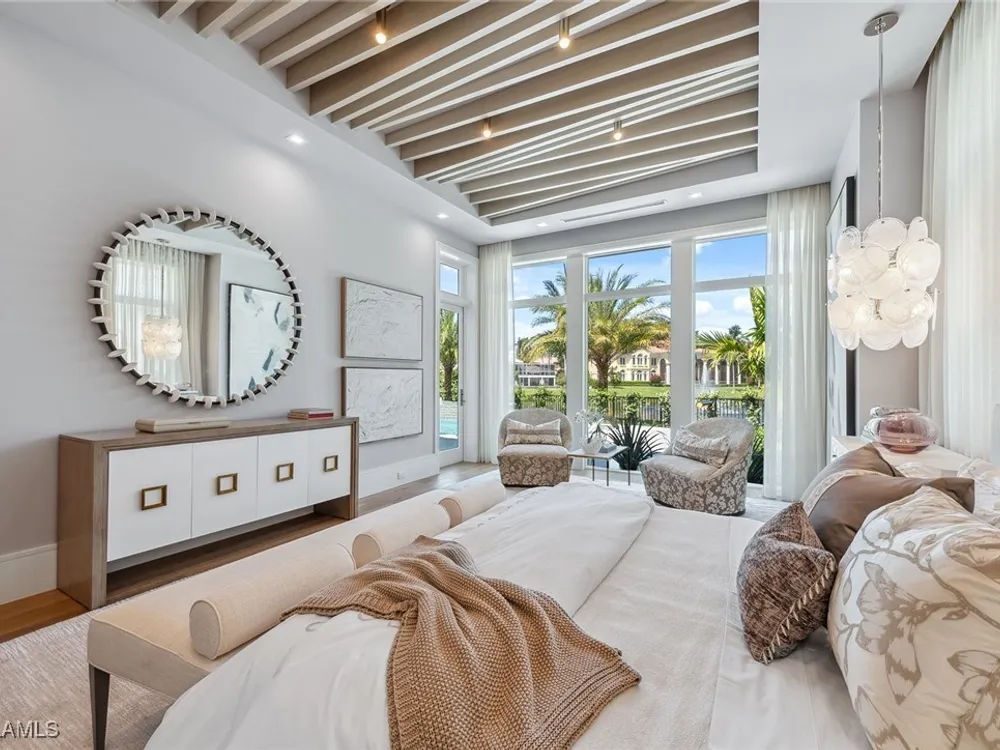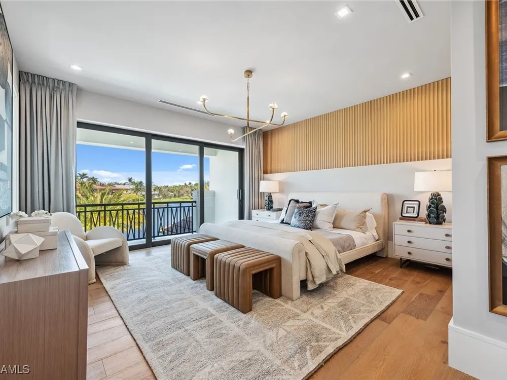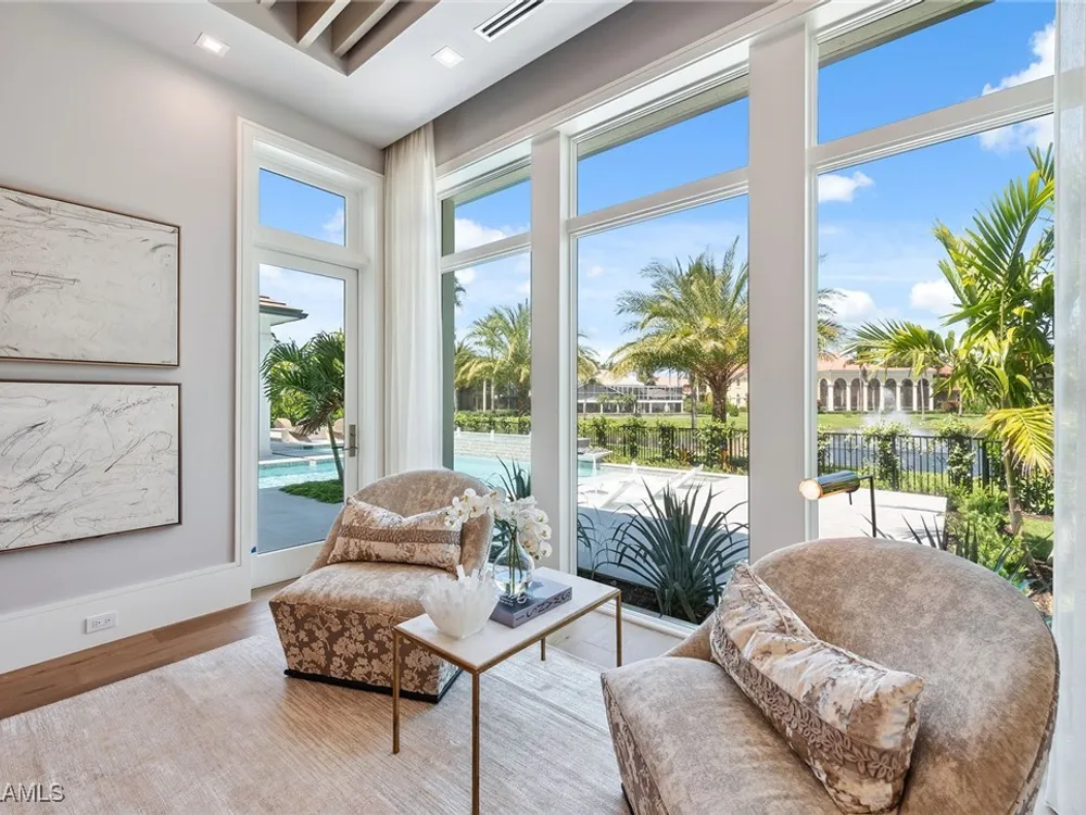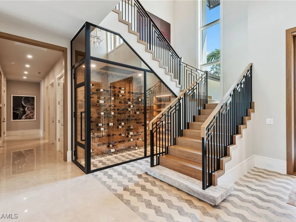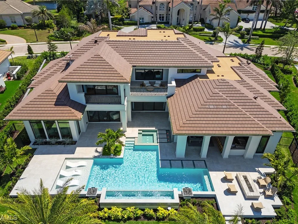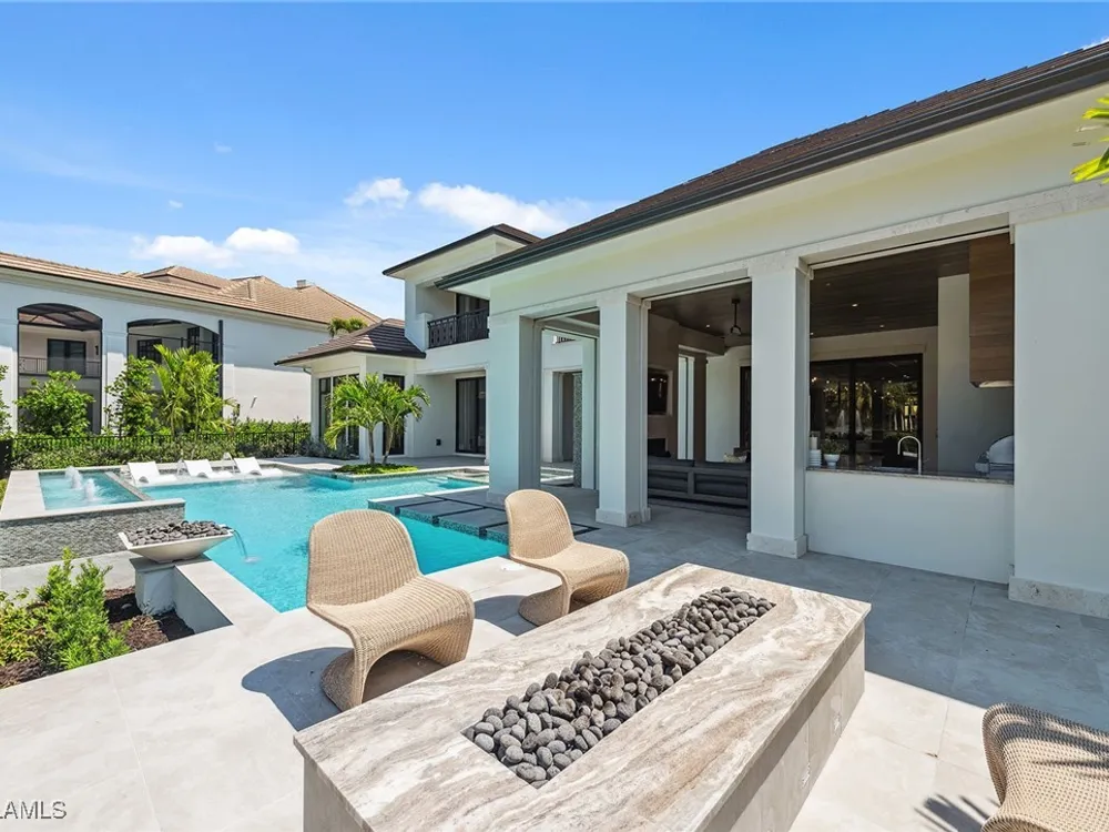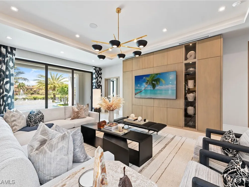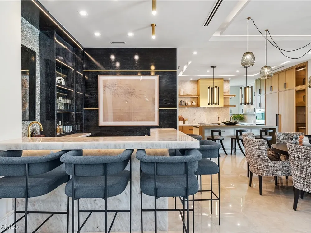 Lakefront Estate home in Bay Colony Shores! Introducing an expertly designed and masterfully constructed estate by Stock Custom Homes situated on one of the most prime west-facing lakefront lots in Bay Colony. Comprising over 6,300 square feet of designer interior living space with five bedrooms, five full baths and two half baths impressively transformed by renowned design firm Marc-Michaels Interior Design. Upgraded features include large format tile and wide plank wood flooring, wine room, designer Sub-Zero refrigeration, Wolf 48-inch sealed six-burner range top, Wolf double wall oven, convection oven, warming drawer, home automation and lighting control. The owner’s bedroom suite offers wood detail in coffer, walk-in shower with Brizo showerhead, rain head, body sprays and freestanding tub. Saltwater pool with spa, sun shelf, fire and water bowls and linear fire pit, an outdoor kitchen with NatureKast cabinets and a built-in grill. Four-car garage with epoxy flooring. Enjoy the ultimate Naples lifestyle in Bay Colony.
