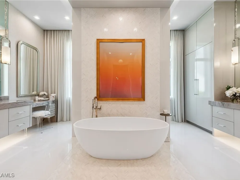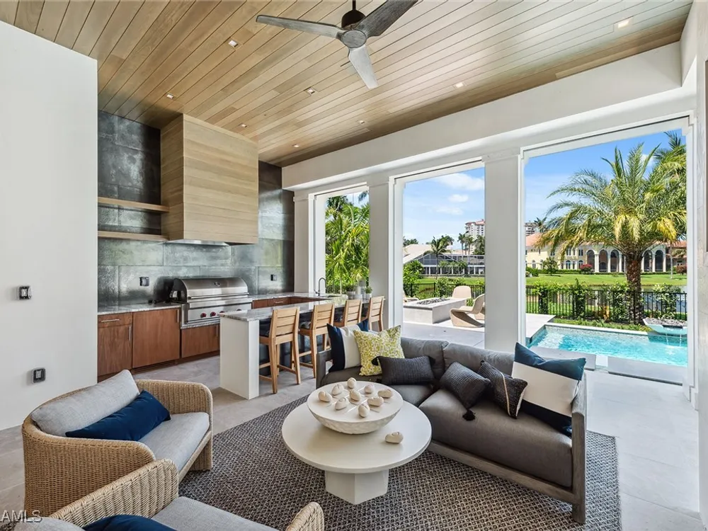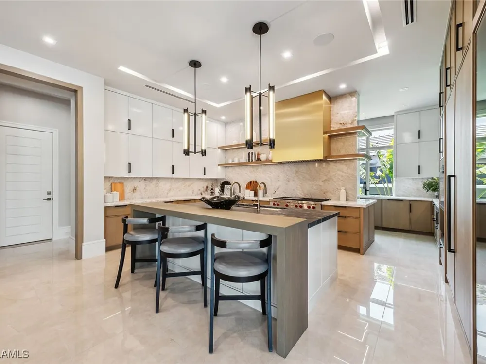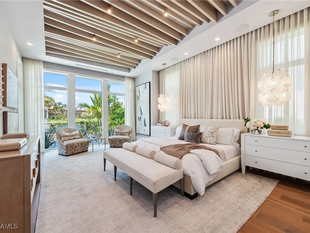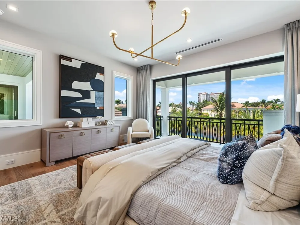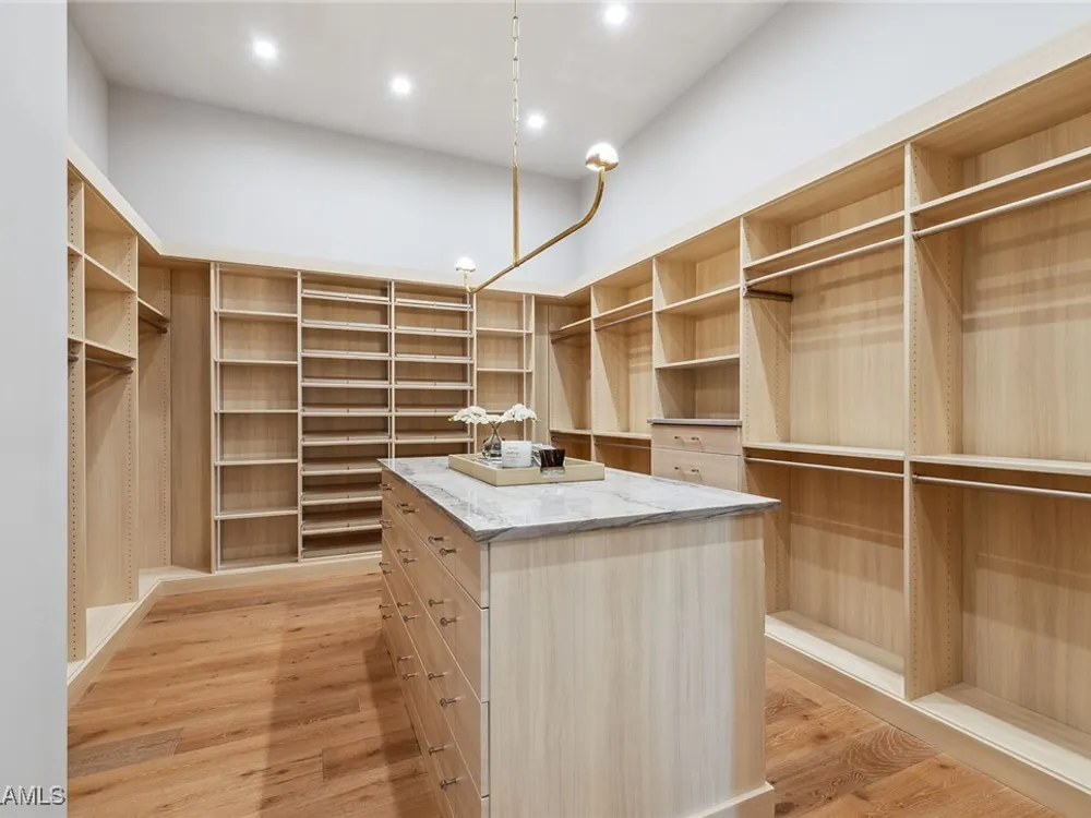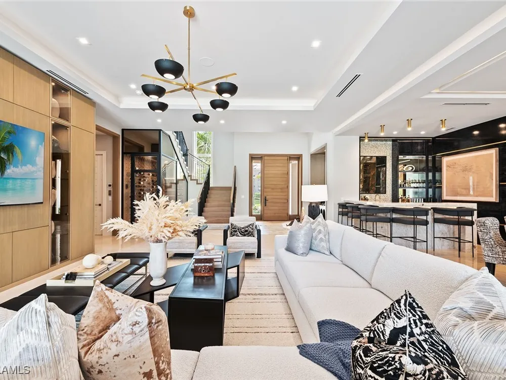Lakefront Estate home in Bay Colony Shores! Introducing an expertly designed and masterfully constructed estate by Stock Custom Homes situated on one of the most prime west-facing lakefront lots in Bay Colony. Comprising over 6,300 square feet of designer interior living space with five bedrooms, five full baths and two half baths impressively transformed by renowned design firm Marc-Michaels Interior Design. Upgraded features include large format tile and wide plank wood flooring, wine room, designer Sub-Zero refrigeration, Wolf 48-inch sealed six-burner range top, Wolf double wall oven, convection oven, warming drawer, home automation and lighting control. The owner’s bedroom suite offers wood detail in coffer, walk-in shower with Brizo showerhead, rain head, body sprays and freestanding tub. Saltwater pool with spa, sun shelf, fire and water bowls and linear fire pit, an outdoor kitchen with NatureKast cabinets and a built-in grill. Four-car garage with epoxy flooring. Enjoy the ultimate Naples lifestyle in Bay Colony.