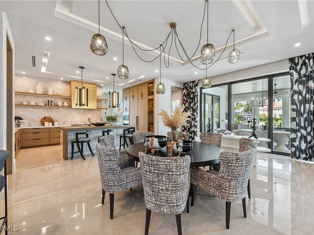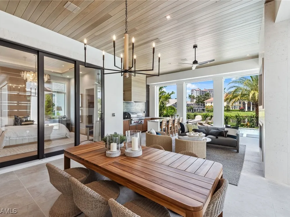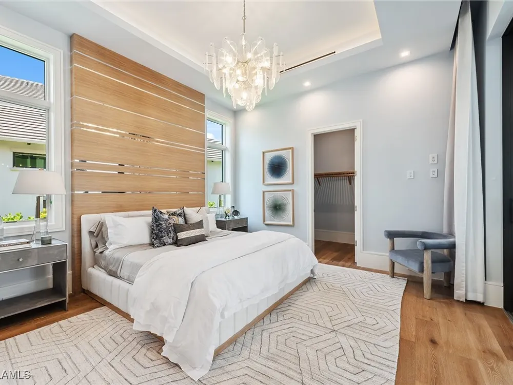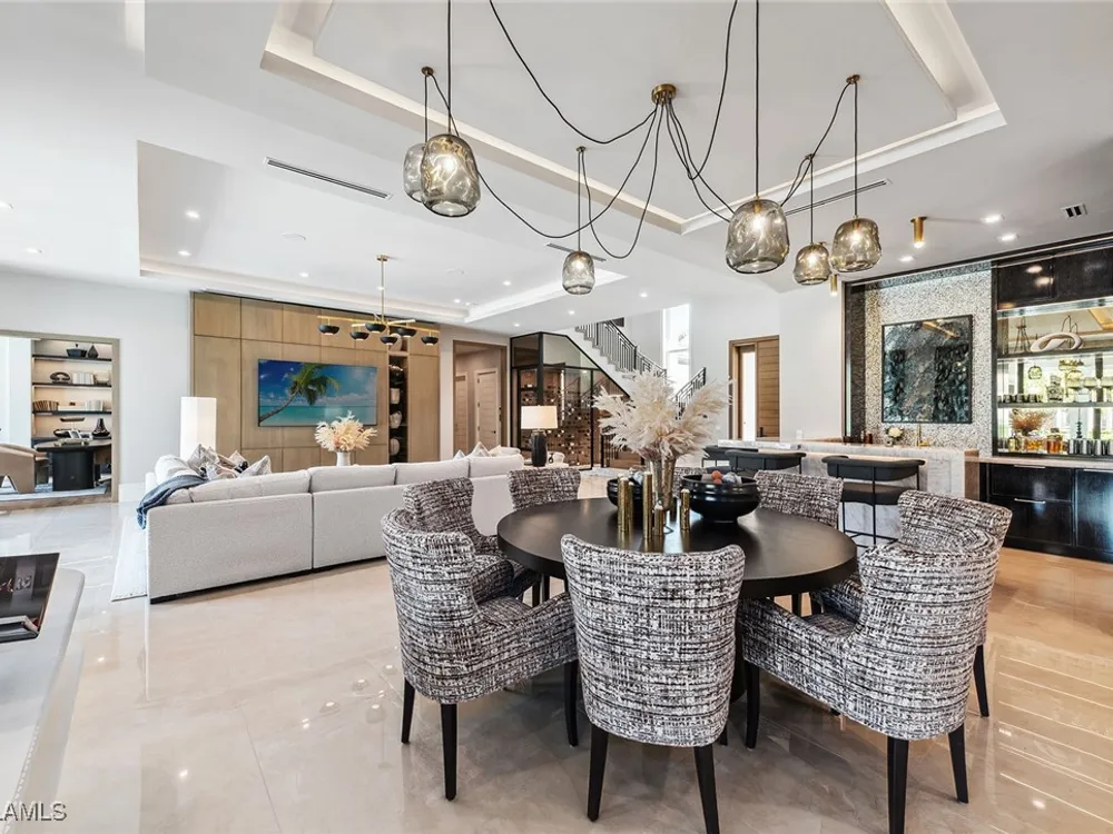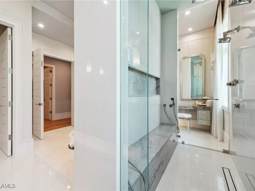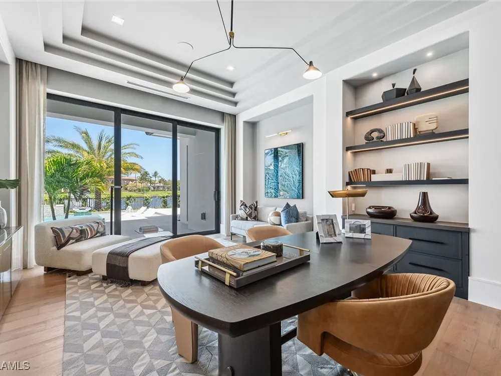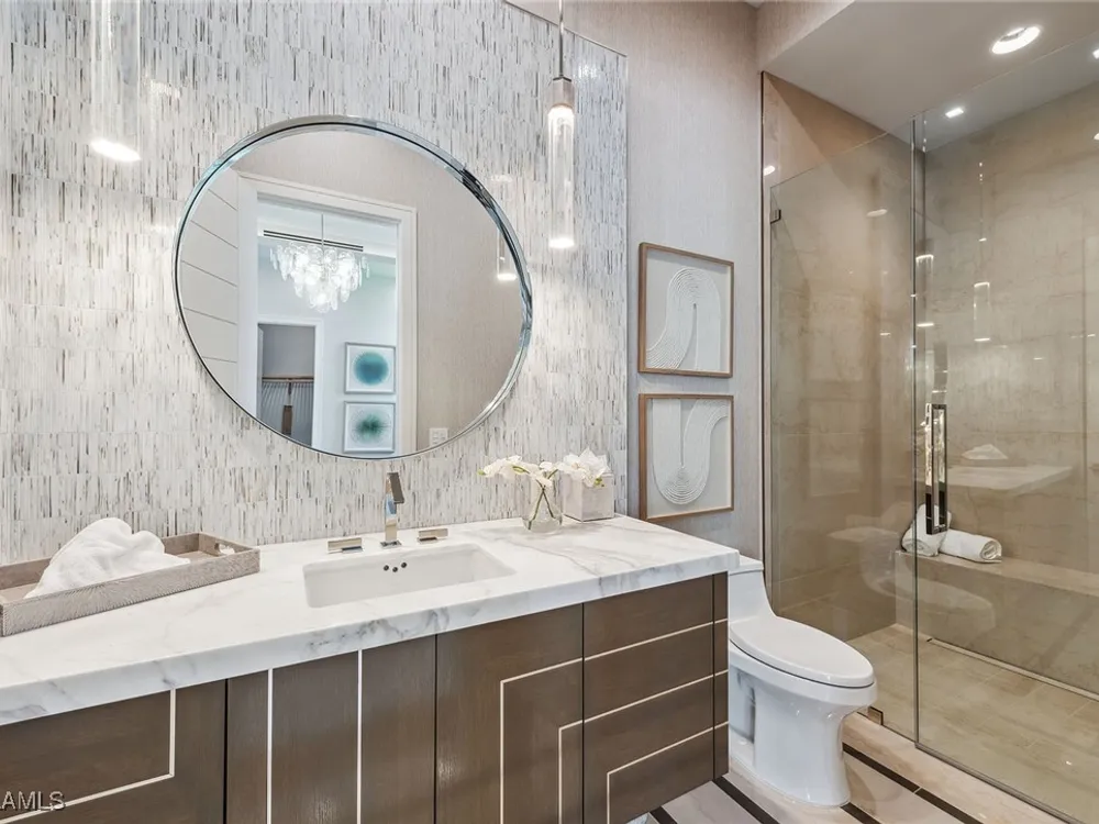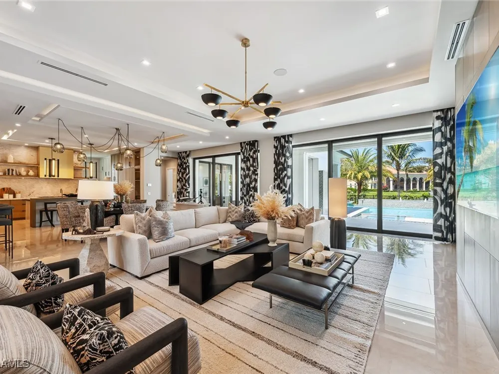 Lakefront Estate home in Bay Colony Shores! Introducing an expertly designed and masterfully constructed estate by Stock Custom Homes situated on one of the most prime west-facing lakefront lots in Bay Colony. Comprising over 6,300 square feet of designer interior living space with five bedrooms, five full baths and two half baths impressively transformed by renowned design firm Marc-Michaels Interior Design. Upgraded features include large format tile and wide plank wood flooring, wine room, designer Sub-Zero refrigeration, Wolf 48-inch sealed six-burner range top, Wolf double wall oven, convection oven, warming drawer, home automation and lighting control. The owner’s bedroom suite offers wood detail in coffer, walk-in shower with Brizo showerhead, rain head, body sprays and freestanding tub. Saltwater pool with spa, sun shelf, fire and water bowls and linear fire pit, an outdoor kitchen with NatureKast cabinets and a built-in grill. Four-car garage with epoxy flooring. Enjoy the ultimate Naples lifestyle in Bay Colony.