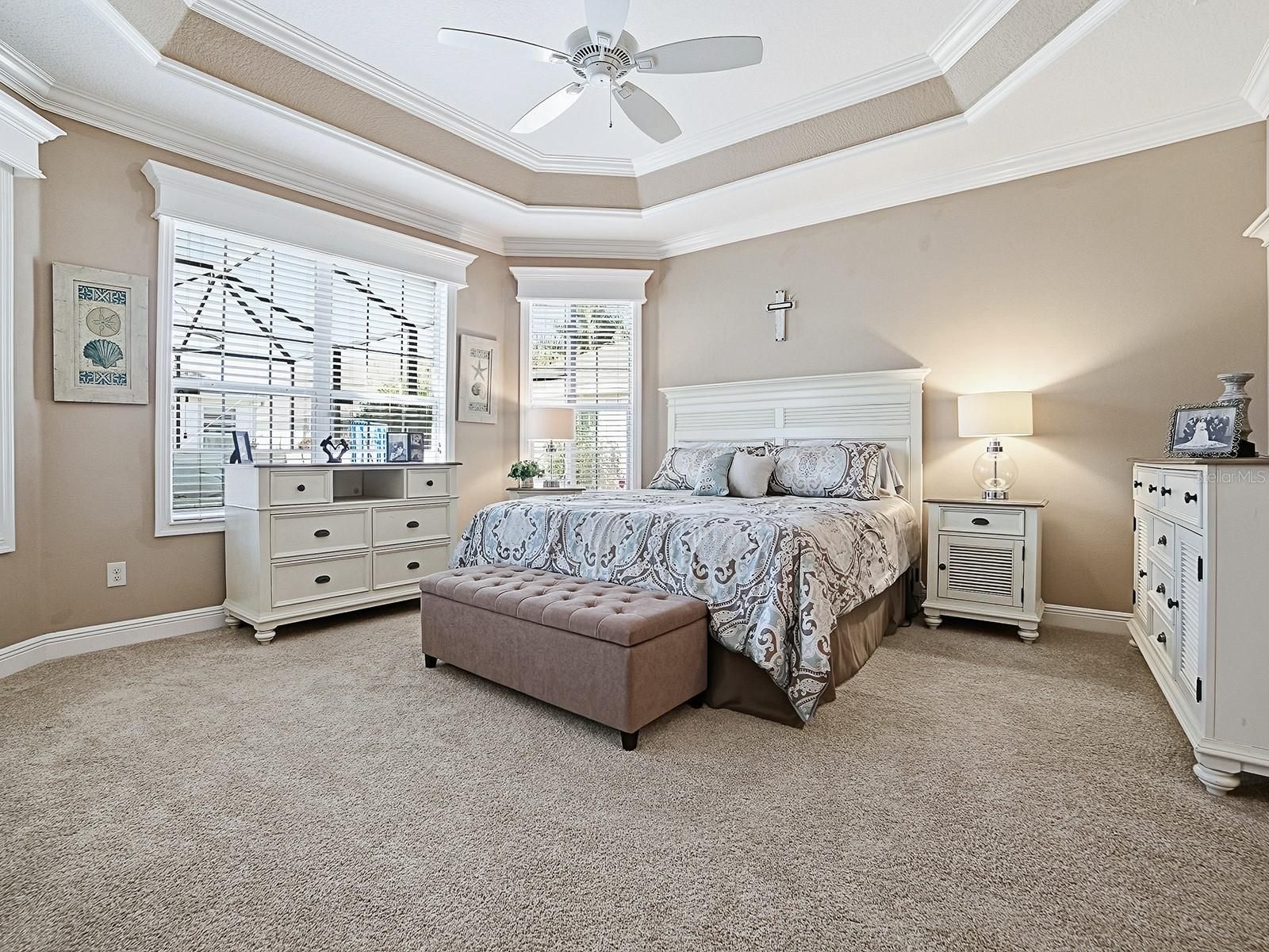 - Ceiling Fan(s), Central Vacuum, Crown Molding, Eat-in Kitchen, High Ceilings, Open Floorplan, Main Level Primary, Split Bedrooms, Tray Ceiling(s), Walk-In Closet(s)