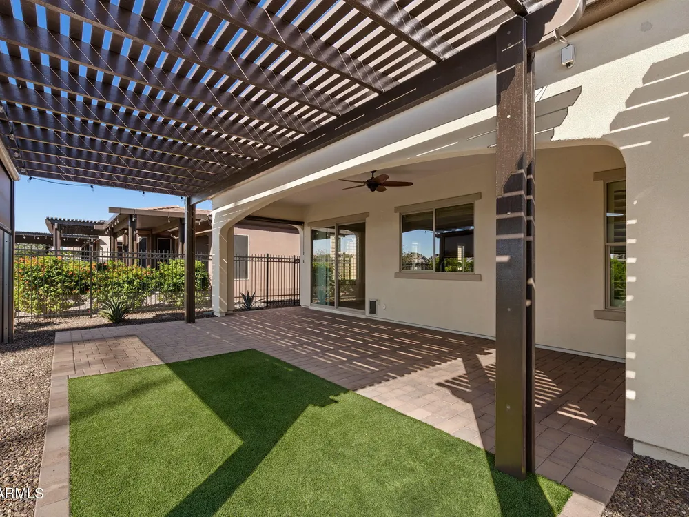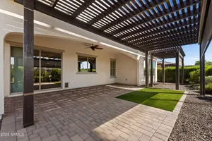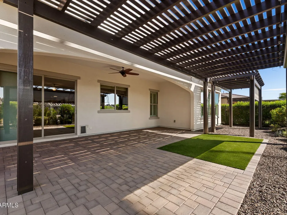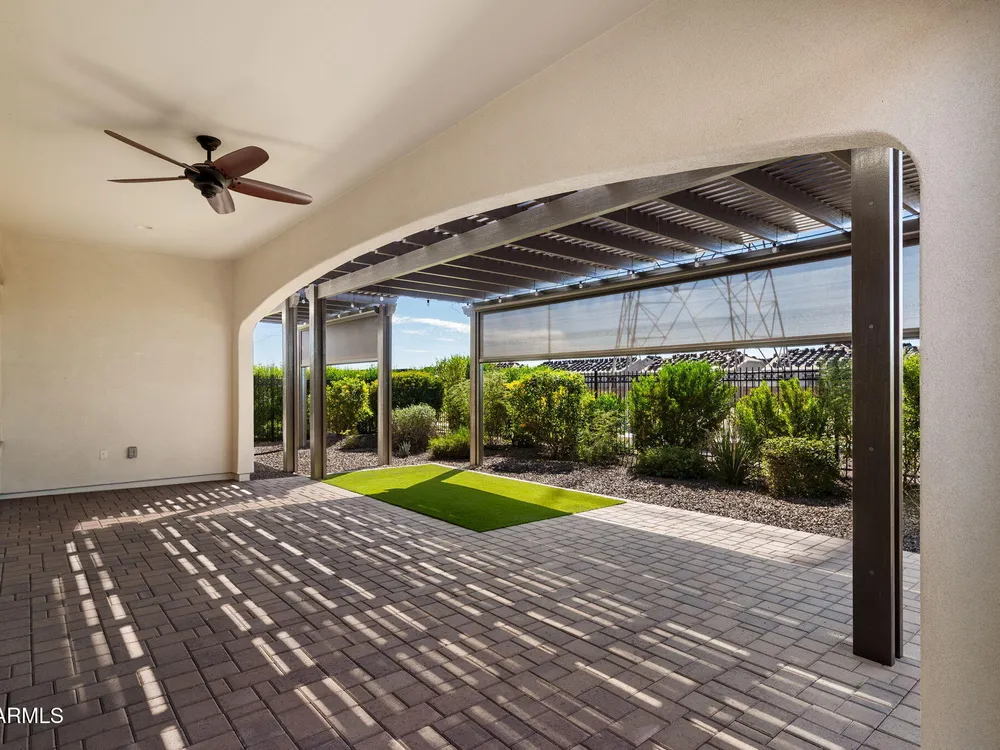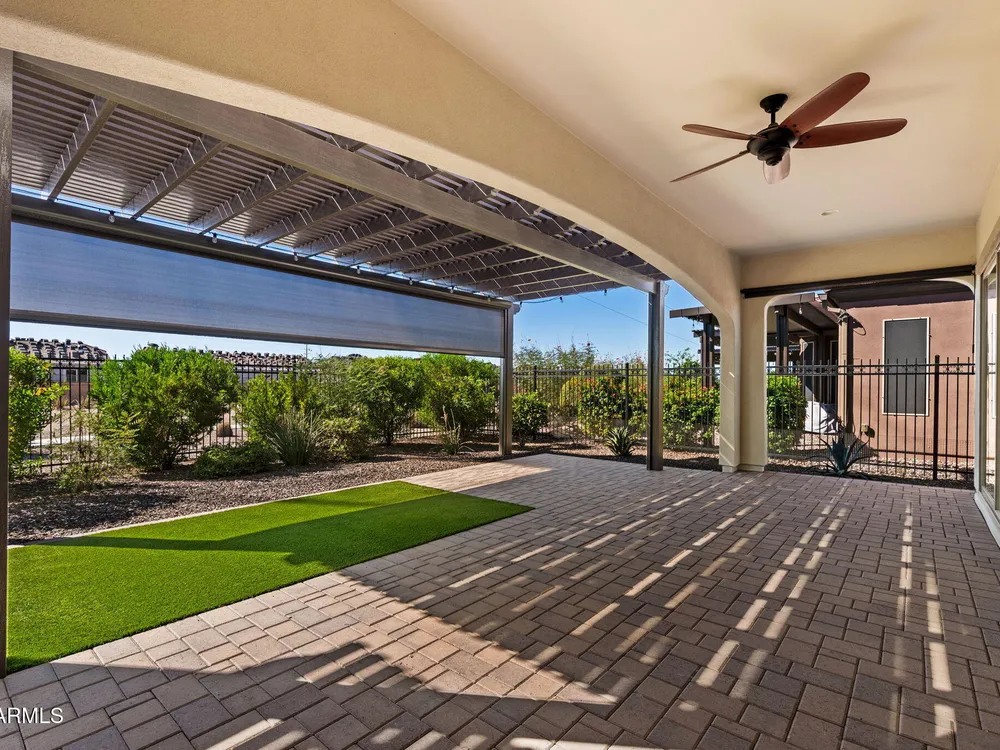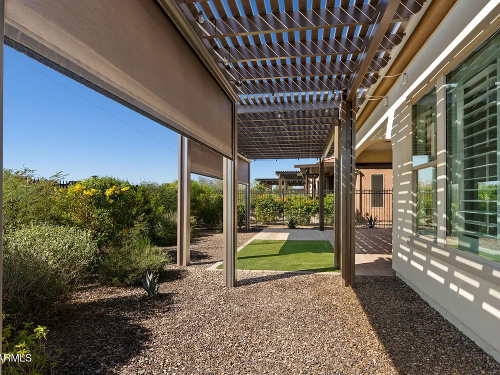 The Ultimate in Resort-Style Living offers a wide variety of social activities, including golf, tennis, pickleball, concerts, pools, spa, salon, restaurants, fitness club, and more. Beautiful Home in Encanterra, this spacious home features a split floor plan with 2 bedrooms, 2 bathrooms, and a den, along with an open concept living area that's perfect for entertaining. The elegant design includes stunning custom tile upgrades throughout, plantation shutters, upgraded lighting, and fresh paint. The backyard boasts turf grass, lush mature plants, and pergolas, making it the perfect spot to enjoy private sunsets at night, while custom mechanical sunshades create a relaxing retreat during the day. The 3-car tandem garage offers extra cabinet space and houses the tankless H20 heater & softner!