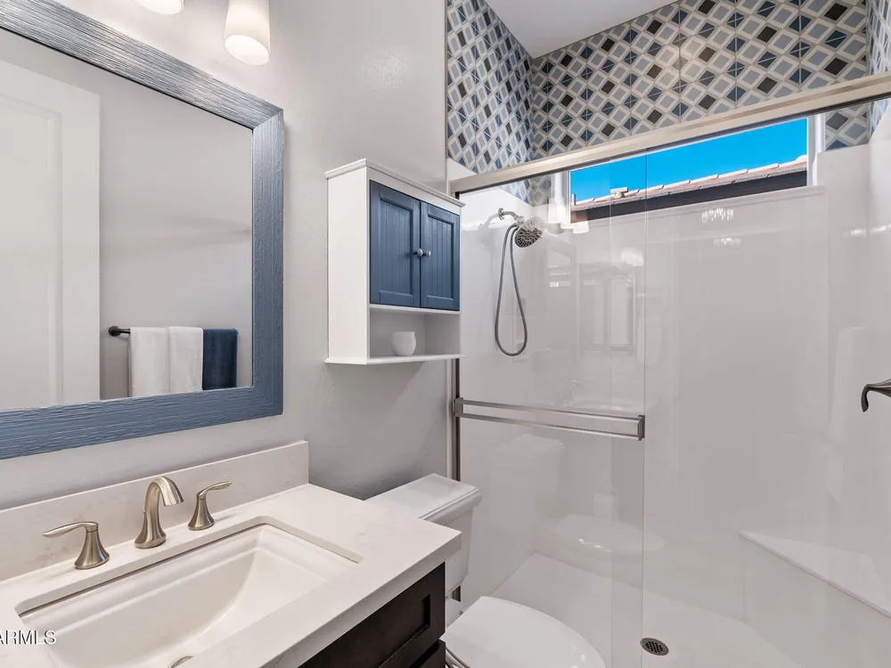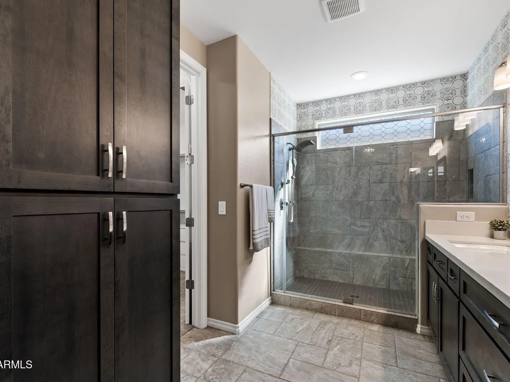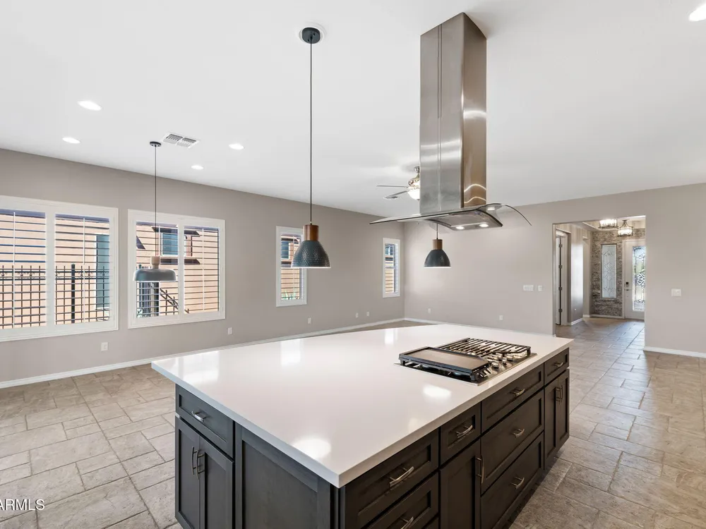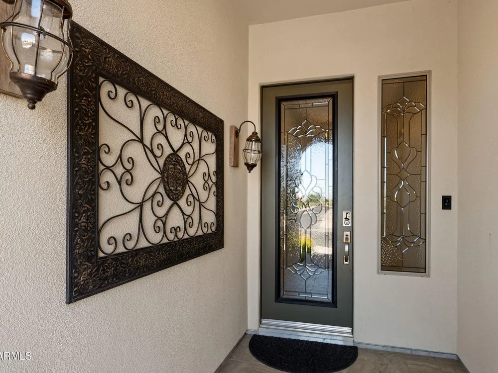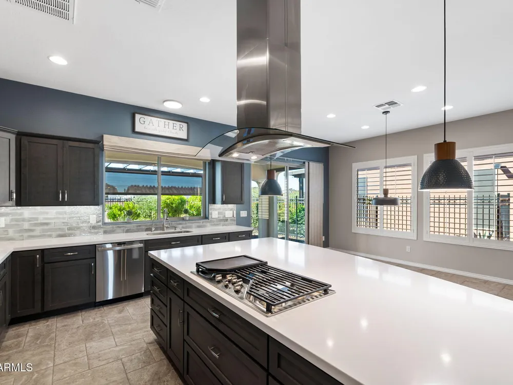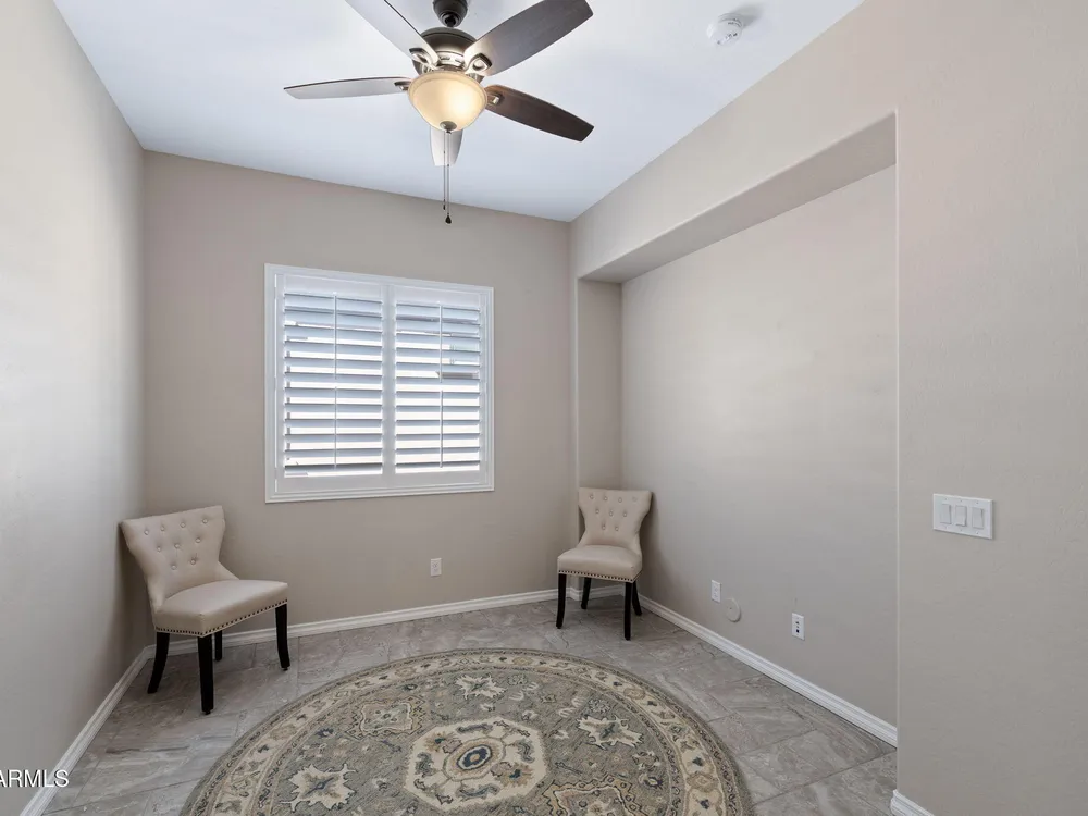 The Ultimate in Resort-Style Living offers a wide variety of social activities, including golf, tennis, pickleball, concerts, pools, spa, salon, restaurants, fitness club, and more. Beautiful Home in Encanterra, this spacious home features a split floor plan with 2 bedrooms, 2 bathrooms, and a den, along with an open concept living area that's perfect for entertaining. The elegant design includes stunning custom tile upgrades throughout, plantation shutters, upgraded lighting, and fresh paint. The backyard boasts turf grass, lush mature plants, and pergolas, making it the perfect spot to enjoy private sunsets at night, while custom mechanical sunshades create a relaxing retreat during the day. The 3-car tandem garage offers extra cabinet space and houses the tankless H20 heater & softner!