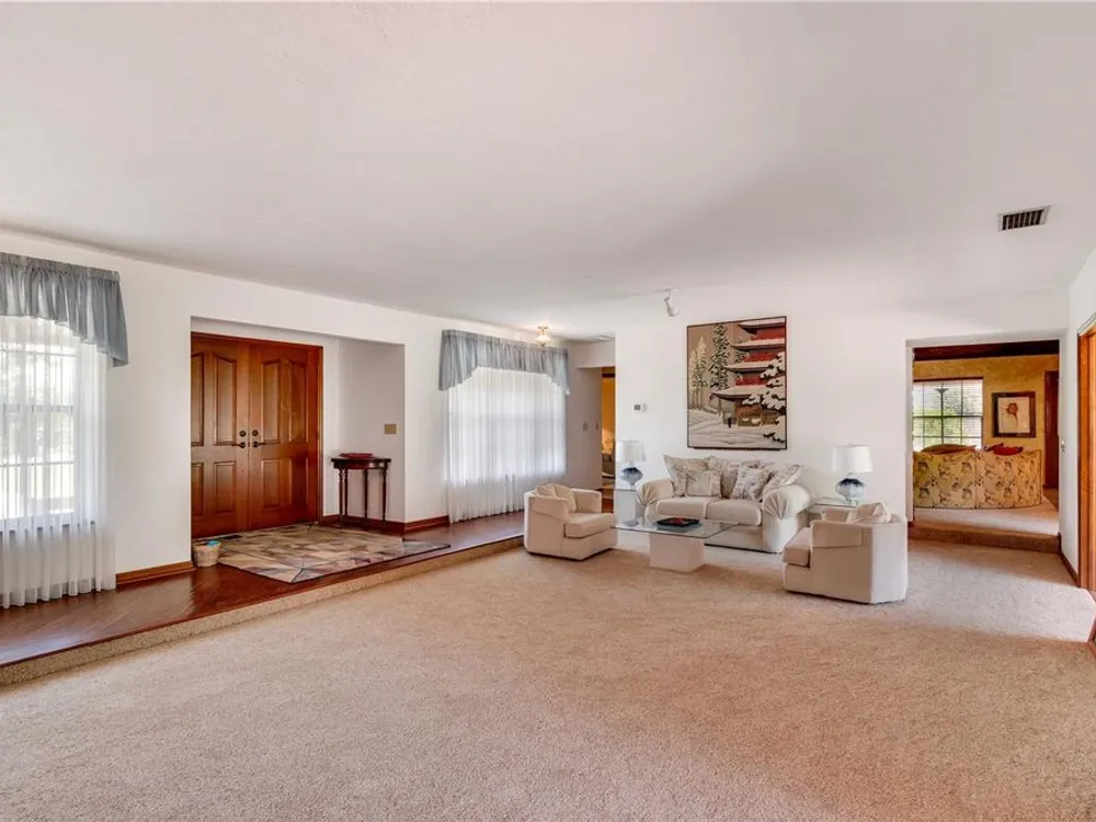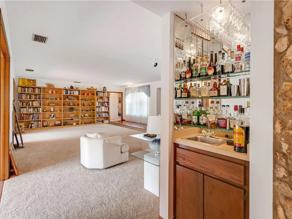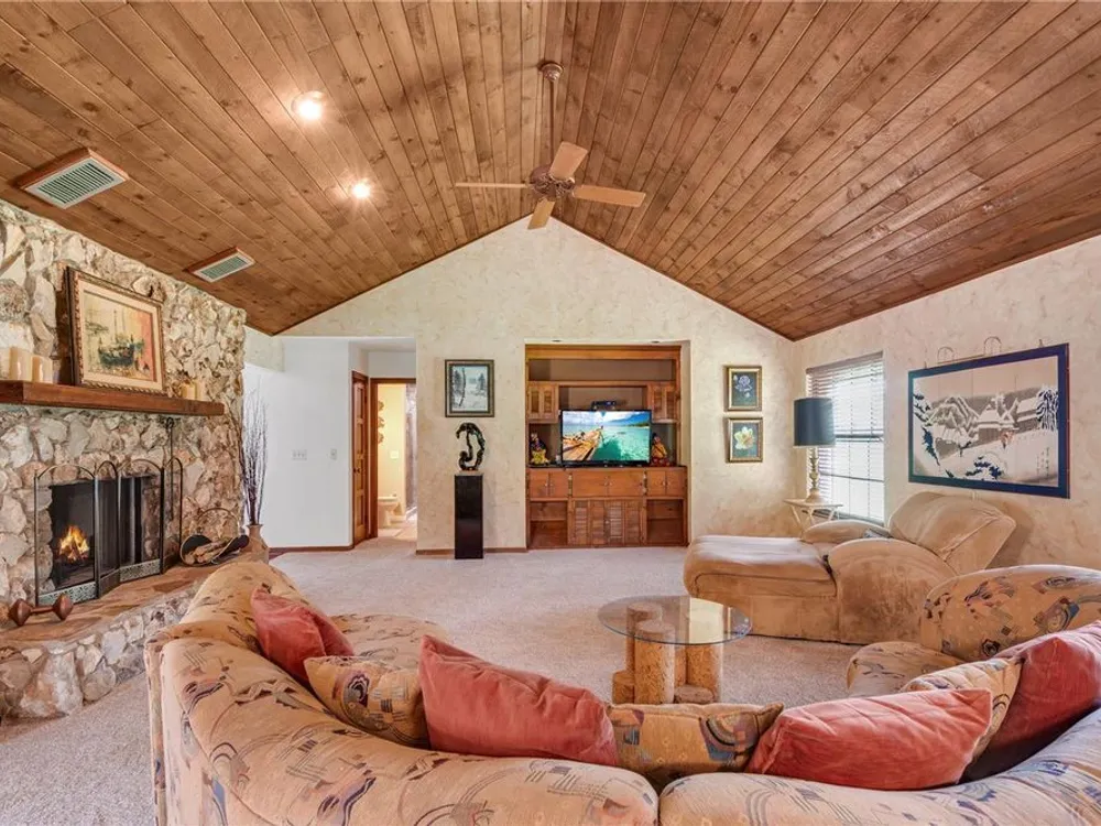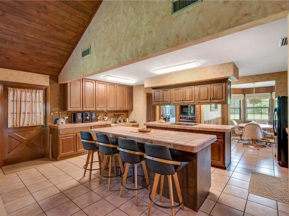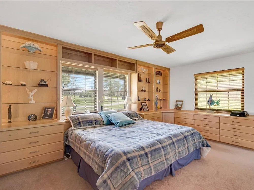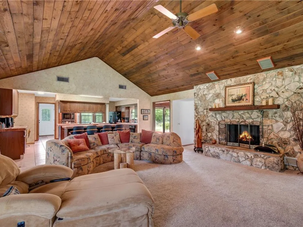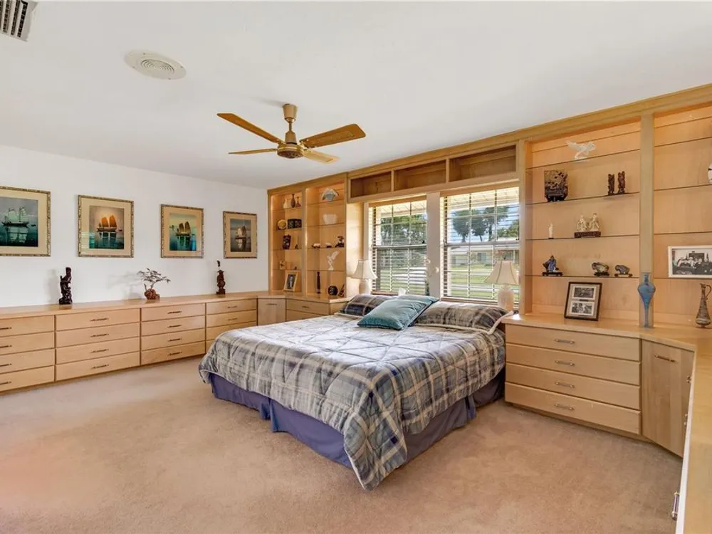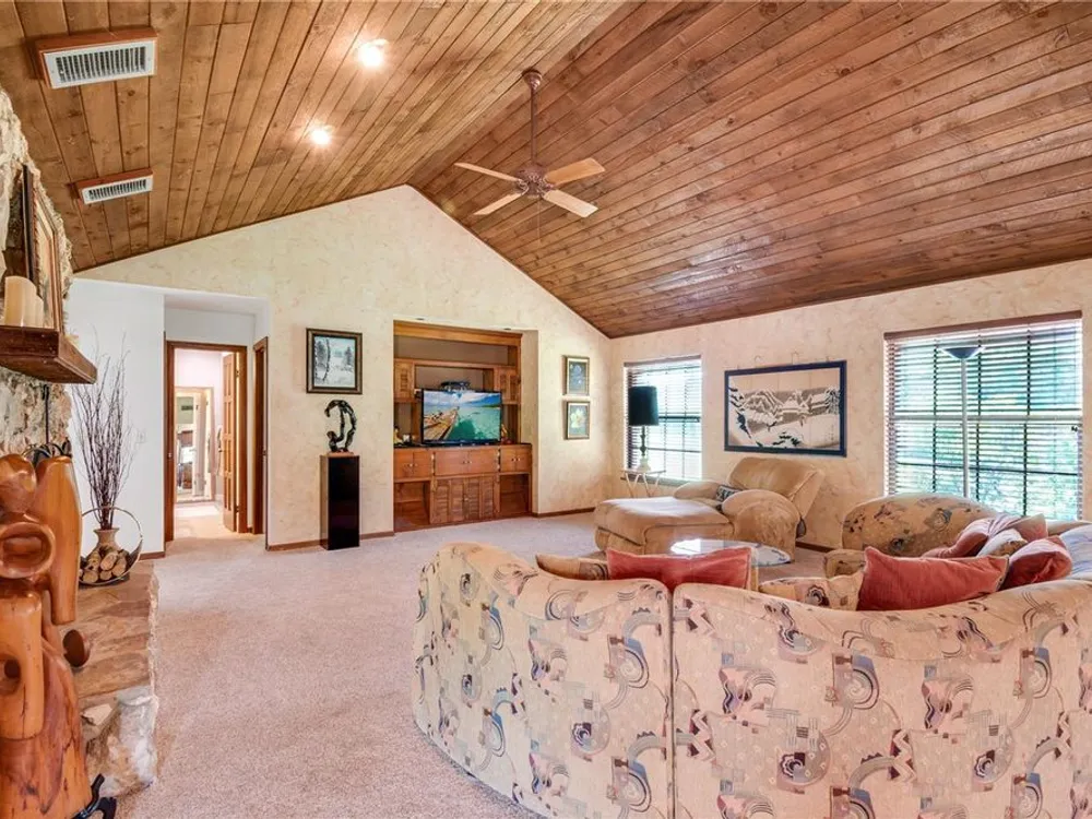 - Built-in Features, Cathedral Ceiling(s), Ceiling Fan(s), Eat-in Kitchen, High Ceilings, Kitchen/Family Room Combo, Living/Dining Room, Open Floorplan, Main Level Primary, Solid-Wood Cabinets, Split Bedrooms, Walk-In Closet(s), Window Treatments