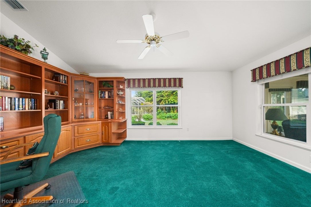 EXECUTIVE GOLF COURSE HOME located in the sought-after 55+ community of Highlands Ridge. Residents enjoy a vibrant community lifestyle with access to various amenities. As you step into this partially furnished home, you will enter the living room with a gas fireplace which can also be wood burning (with some adjustments), dining room and appreciate the well-equipped kitchen with quartz counters providing plenty of work area, stainless steel appliances, and many drawers and cupboards. In addition, there is a pantry closet, additional storage area with shelving for larger items, and the washer and dryer conveniently located in the kitchen behind closed double doors. To the left of the living room is a large den with built-in desk area and shelves for your own personal library. Off the living room, is the best room in the home. The family room, which backs up to the golf course cart path and beyond that a wooded area and views of the tee boxes and fairway. It is a very peaceful/relaxing room. The owners suite is a spacious room with a sleigh bed, double walk-in closets, and a nice view of the back yard. The on-suite bathroom has double vanities, a step in shower, large jetted tub and private toilet room. The guest bedroom and guest bath has a pocket door to separate it from the living room. Large 2 car garage with a separate air conditioned work room area. Pavered driveway and side walk to front door. Don't forget there is an installed Generac, irrigation well for watering the large yard, thermal pane windows that you can not see inside, gas grill and golf cart included. You are just a 10 minute drive to all the new restaurants on the newly updated circle in downtown Sebring thanks to HGTV HomeTown Take Over. If you are not a golfer, keep busy with pickle ball, tennis, bocci ball, shuffleboard, swimming(2 pools) and many other activities in the community club house.