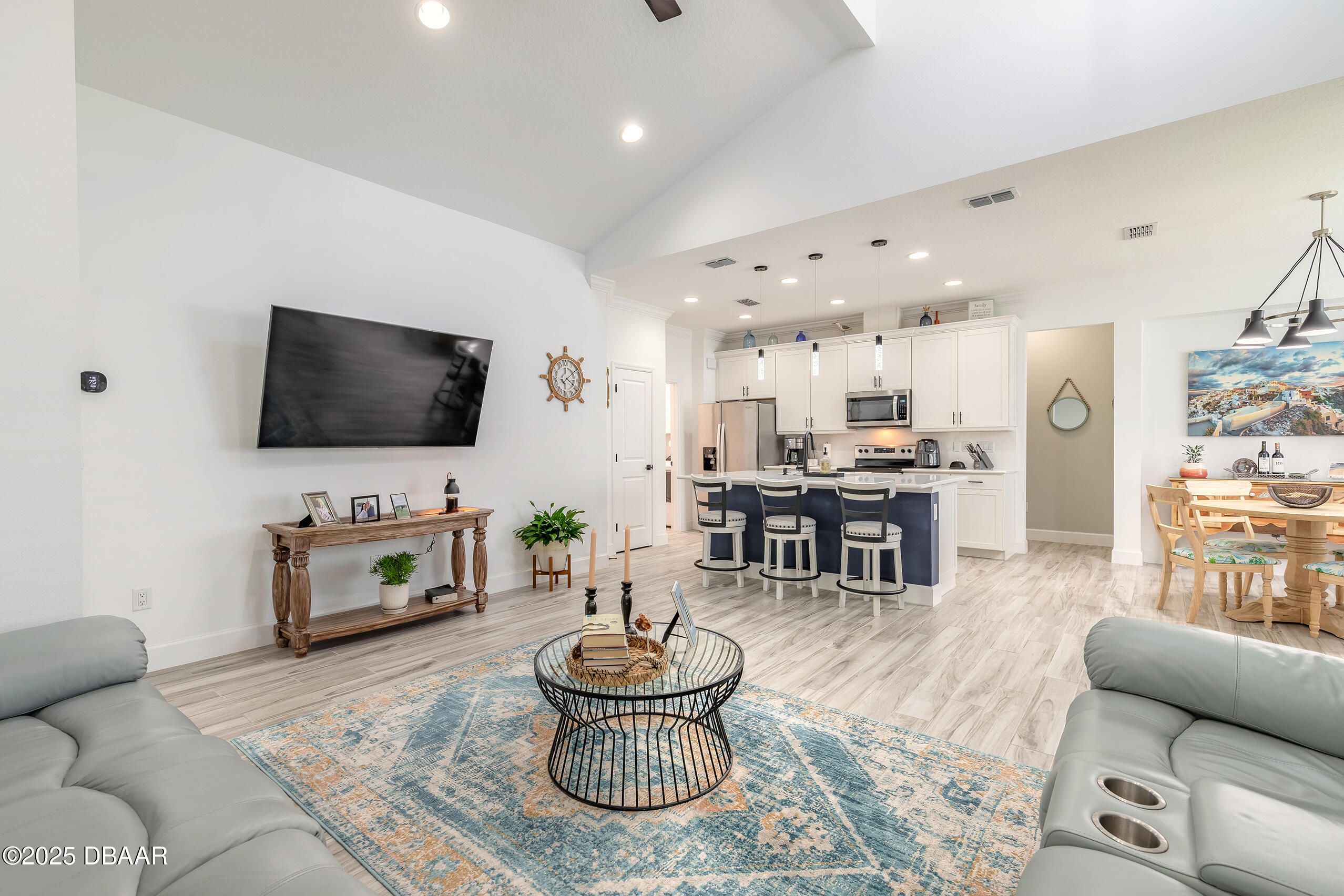 BRING ALL OFFERS! Welcome to your DREAMSICLE cottage in Latitude Margaritaville, Daytona Beach's premier 55+ community. Step inside to a bright, open-concept living room that flows seamlessly into the spacious kitchen — ideal for both everyday living and entertaining. The kitchen features 42'' cabinets, quartz countertops, tile backsplash, soft-close drawers, stainless steel appliances, upgraded light fixtures, a double trash pull-out, and an oversized island with plenty of seating space. All seamlessly connected to the light and bright dining area. Just off the living area, the primary bedroom offers a private retreat with an en-suite bathroom featuring granite countertops, double sinks, and a sleek, fully tiled walk-in shower with glass doors. The generous walk-in closet with custom built-ins offers tons of storage. The split layout ensures comfort, privacy, and convenience. Host guests and family alike in a second well-appointed bedroom and a full bathroom with granite countertops and fully tilE shower/tub combo. Set up your home office or gym in the versatile flex room. An easy access laundry room give the home flow and functionality. The tile floors run throughout the home giving it a seamless look while remaining easy to maintain. Step outside to the screened-in patio the perfect spot to enjoy your morning coffee or relax in the evening, surrounded by low-maintenance landscaping. The two car garage has upgraded EPOXY floors and laundry sink. Home features Rain Soft Water Softener system, Termite Bond and TONS of upgrades. Located in Latitude Margaritaville, this community offers unmatched resort-style amenities: Live music 7 days a week, Private Bar & Chill Restaurant, Fins Up! Fitness Center, Paradise Pool and cabanas, Pet spa, woodworking shop, pickleball, tennis, bocce, Private beach club with shuttle service, Golf cart access to Publix, restaurants, and daily conveniences, On-site theater with special events and shows! Whether you're looking for a full-time residence or a vacation escape, this move-in-ready, low maintenance home is a true opportunity to live the Latitude lifestyle. All information is deemed reliable but not guaranteed. Buyer to verify.