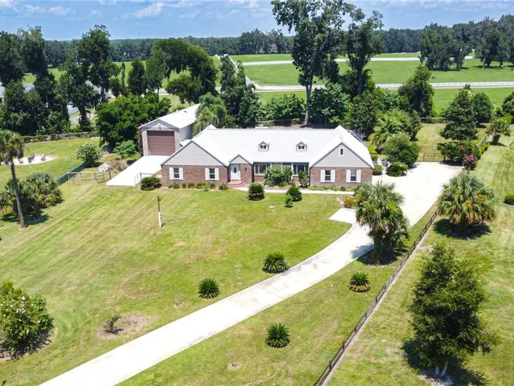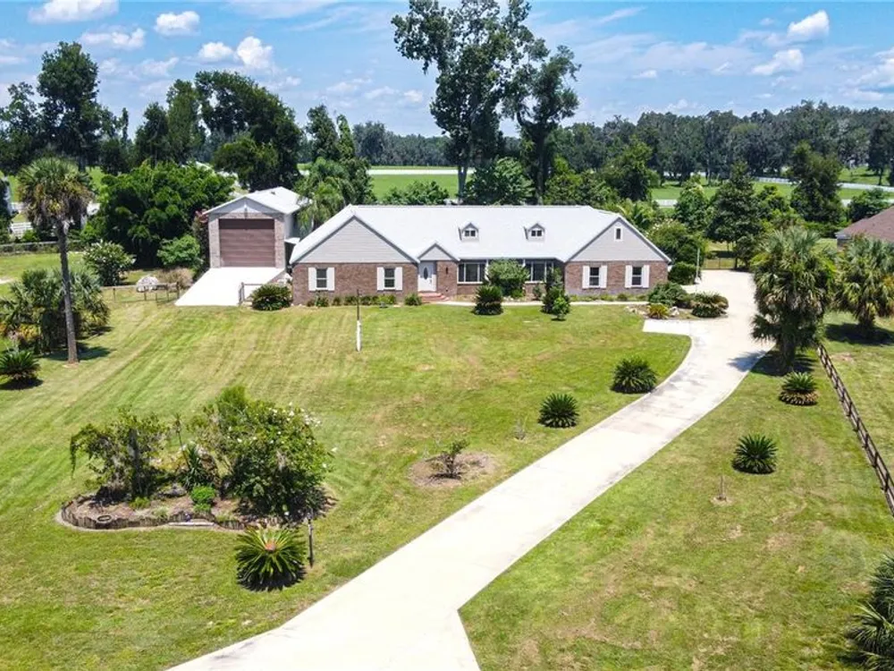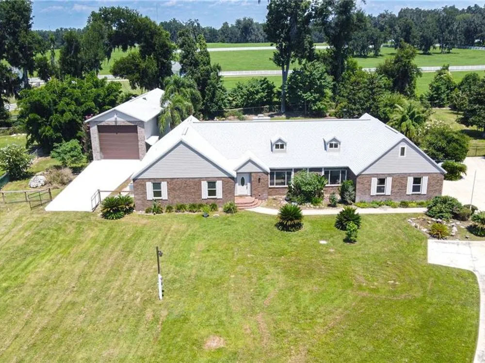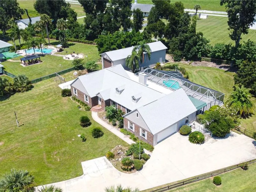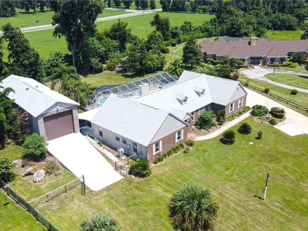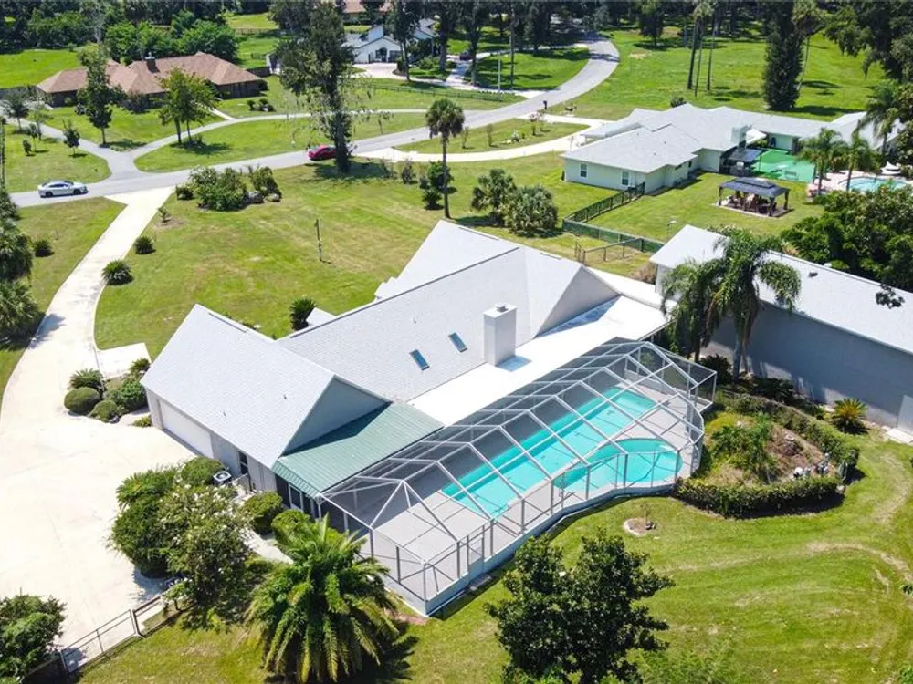 Beautiful large home on 1.26 acres which backs up to a horse farm. Subdivision - El Dorado - five minutes from Publix, Aldi and Walmart and 10 minutes away from 15 restaurants with close access to I-75 - 1.5 hours from both Tampa and Orlando Airports and 45 minutes from The Villages. GREAT LOCATION! Spacious 4 bedroom, 2.5 bath, 2 car garage home with large living room, freshly painted inside with new flooring and new countertops in kitchen and baths. Ready to be decorated by new owners. Very large covered and screened in Patio with two pools. Pool size 20x27 and lap pool 67x15. Huge RV Garage - 64x21. There are 3 hospitals withing 15 minutes of El Dorado. Community tennis court. Very peaceful, quiet, and safe community with 24/7 guards. New roof in 2024, new HVAC units in 2020.
