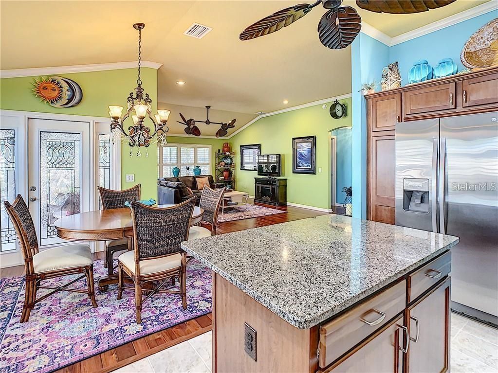 - Attic Ventilator, Ceiling Fan(s), Crown Molding, High Ceilings, Kitchen/Family Room Combo, Open Floorplan, Main Level Primary, Solid Surface Counters, Split Bedrooms, Thermostat, Walk-In Closet(s), Window Treatments