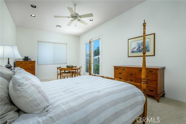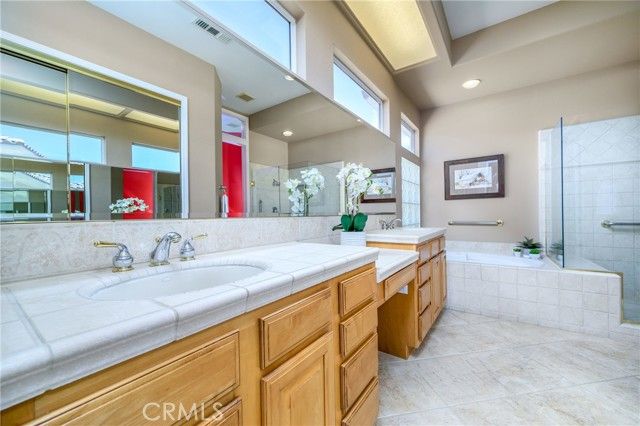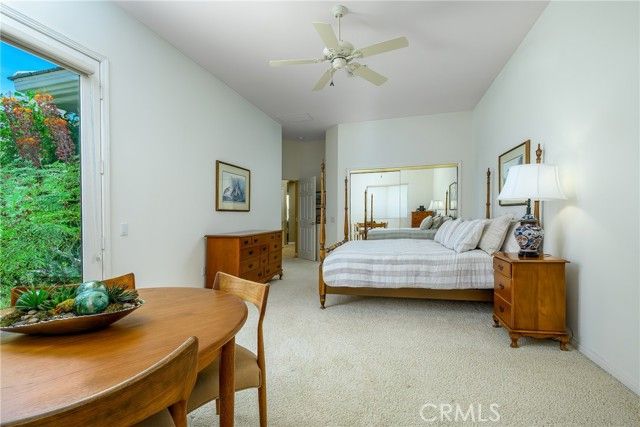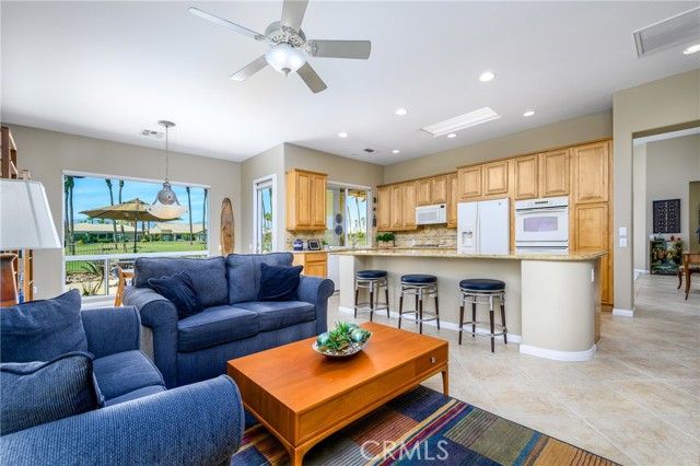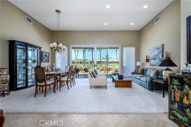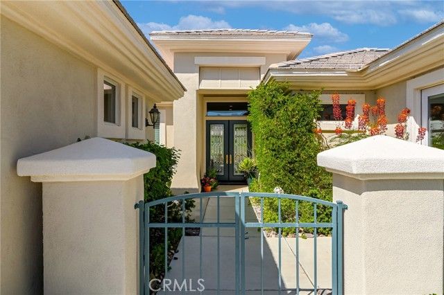 Sun City Palm Desert. Monaco Estate Model with Extended Rooms. If you are looking for AMAZING VIEWS and a GREAT LOCATION, this home is for you! This beautiful home sits on the 7th fairway of the San Gorgonio Golf course with South/South West views of the San Jacinto Mountains. When entering the large, leaded glass, double front doors, the Monaco floor plan opens up to 12 ft ceilings. Be prepared to stop in your tracks looking out through the large windows and glass sliding doors to AMAZING summer sunsets and white snow capped mountains in the winters. The water feature centered in the back patio is also a beautiful focal point that adds soothing sounds and another visual element to the outdoor space. The Primary bedroom was built with the extended package which provides a larger bedroom. The Primary bathroom has double sinks with a built in vanity, soaking tub, walk in shower, and a large walk in closet with mirrored doors. The second bedroom is also extended in size, has mirrored closet doors, french doors that open to the front court yard and fountain. The en-suite bathroom features a shower and bathtub. The third bedroom, which can also be used as an office, is attached to a guest bathroom with walk in shower. The kitchen has granite countertops, up-graded wood cabinets with pullout shelving for easy access, pantry, a large island and ample storage . There is a skylight that provides natural lighting. The open floor plan in the kitchen area has a cozy family room with a fireplace and breakfast nook that looks out to the beautiful views. The large laundry room comes with washer/dryer and has several cabinets, great for storage. The 2 car garage has walls with storage racks and is also extended in size. There is a 3rd attached garage for golf cart parking. New air conditioning units were installed in 2020. Enjoy all that Sun City has to offer: Two 18 Hole Championship Golf Courses, 18 hole Putting Course, three Club Houses, Tennis, Indoor and Outdoor pools, Bocce Ball, Pickelball, Softball field, two Restaurants, Fitness Center, Billards, over 80 social clubs and much more. Enjoy the nearby PNB Paribas Open Tennis Tournament, the new Acrisure Arena, great shopping and dining. Sun City is truly a great location and has much to offer!