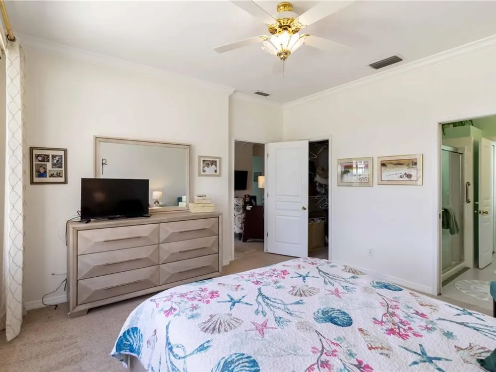 - Ceiling Fan(s), Crown Molding, Eat-in Kitchen, High Ceilings, Open Floorplan, Main Level Primary, Solid Surface Counters, Solid-Wood Cabinets, Split Bedrooms, Walk-In Closet(s), Window Treatments