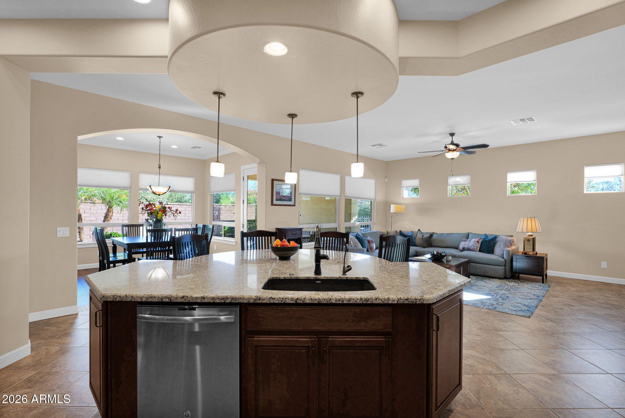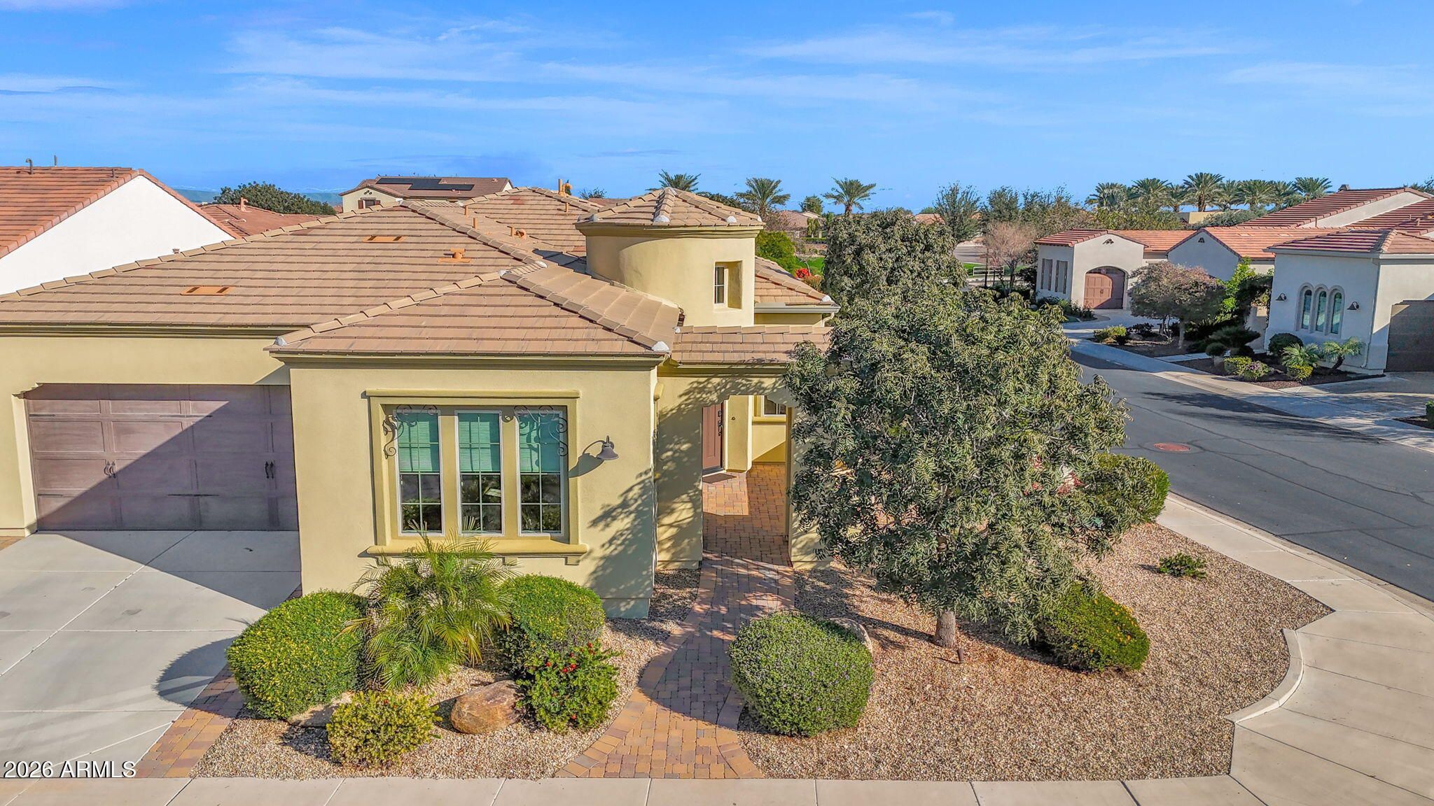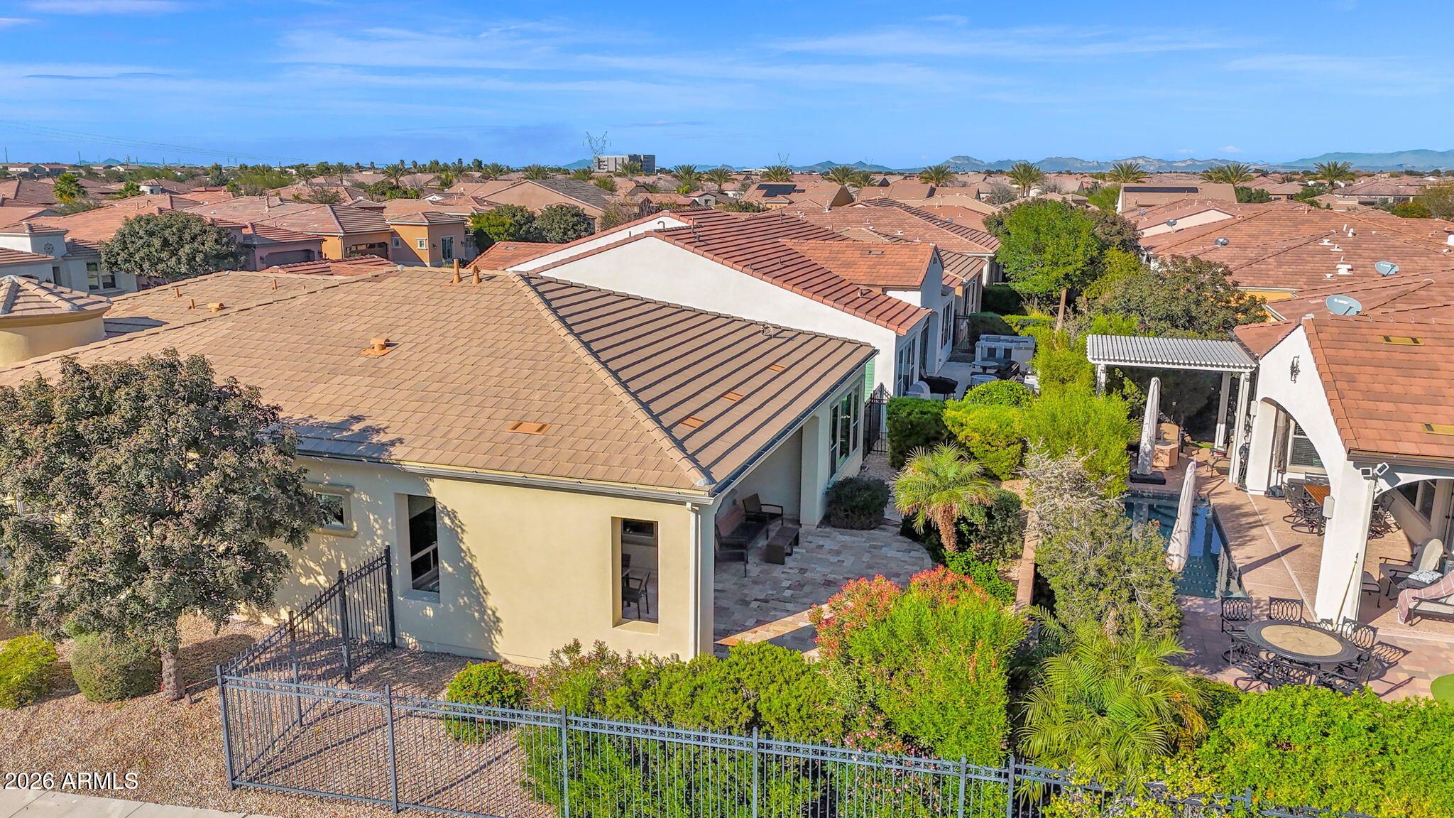 Perfectly positioned on a corner lot near the heart of Encanterra® Country Club, this stunning Shea Genova Model offers an exceptional blend of privacy, walkability, and elevated desert living—just moments from The Algarve, Encanterra's vibrant social epicenter. Designed for comfort and flexibility, the home features two spacious private suites, ideal for hosting guests or multigenerational living, along with a separate den that easily adapts as a home office, media room, or retreat. Throughout the home, no carpet and a neutral, timeless palette create a clean, sophisticated aesthetic that complements the architecture and natural light. The expansive kitchen anchors the living space, offering generous counter space, abundant cabinetry, and seamless flow into the dining and great room, perfect for entertaining or relaxed everyday living. Large windows and thoughtful sight lines enhance the home's open, airy feel. Outdoors, the property truly shines. A covered patio, extended outdoor living space, and fenced backyard provide outstanding privacy, while the fire pit creates an inviting setting for evening gatherings under the Arizona sky. The corner-lot orientation enhances both separation and serenity, making the outdoor spaces feel like a private retreat. With its premier location, versatile floor plan, and refined finishes, this Genova Model presents a rare opportunity to enjoy the best of the Encanterra lifestyle, steps from world-class amenities, yet tucked into a setting designed for comfort, privacy, and connection.