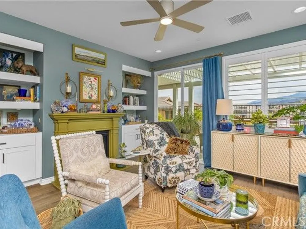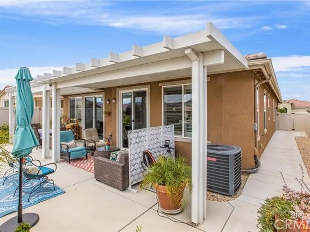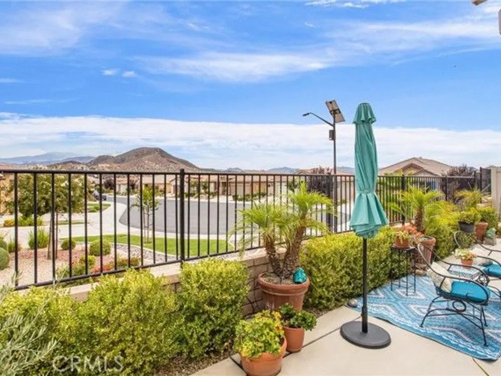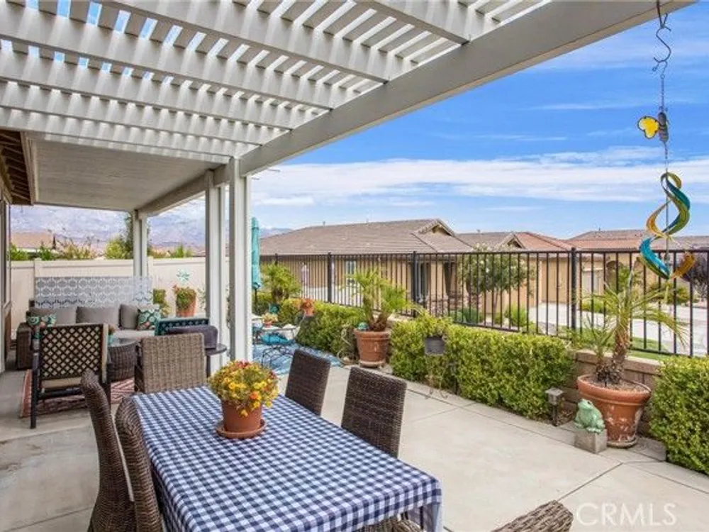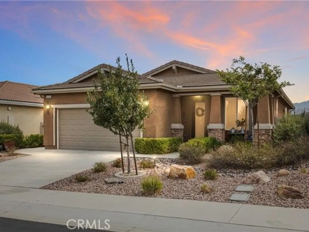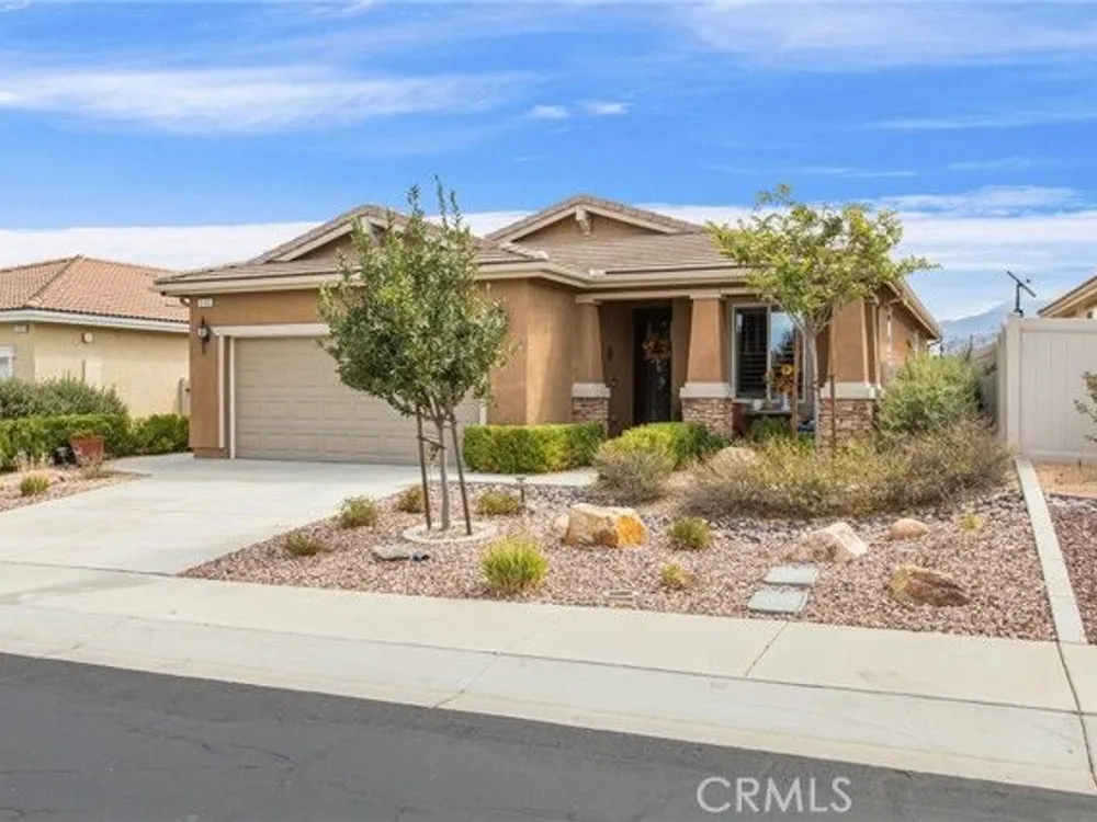 Welcome to this stunningly upgraded home in the sought-after K. Hovnanian Four Seasons community! This beautiful this Professionally designed single story residence offers 2 bedrooms, 2 bathrooms, and a private office with French doors. Perfectly positioned with unobstructed views of the Idyllwild Mountains and no neighbors directly behind, you’ll enjoy both privacy and breathtaking scenery. Step inside to discover an open-concept great room with a custom fireplace mantel and built-in niches, creating the ideal gathering space. The gourmet kitchen features Capistrano Shaker white cabinetry, quartz countertops and backsplash, upgraded GE Café appliances (including refrigerator), under-cabinet lighting, and a beveled glass pantry door. The primary suite is a true retreat with a private door to the ensuite bath, a mirrored walk-in closet, and access to a covered patio. The guest suite offers its own direct bath access, while the office provides flexibility for remote work or hobbies. Notable interior highlights include: Beautiful laminate flooring in main living areas, with upgraded carpet in bedrooms & office Custom paint throughout Four-inch baseboards, beveled mirrored wardrobe doors, and upgraded light fixtures Flat panel/media connections in office, great room, and primary bedroom Home networking package, security system, and Ring doorbell Laundry room with sink and full cabinetry The exterior is equally impressive, featuring: Stone front elevation and upgraded coach lights Concrete back patio with trellis cover & lighting plus additional covered patio off the primary suite Professional landscaping with privacy in mind. This home is move-in ready, thoughtfully upgraded, and designed for both comfort and style—an entertainer’s dream in a vibrant, active-adult community.