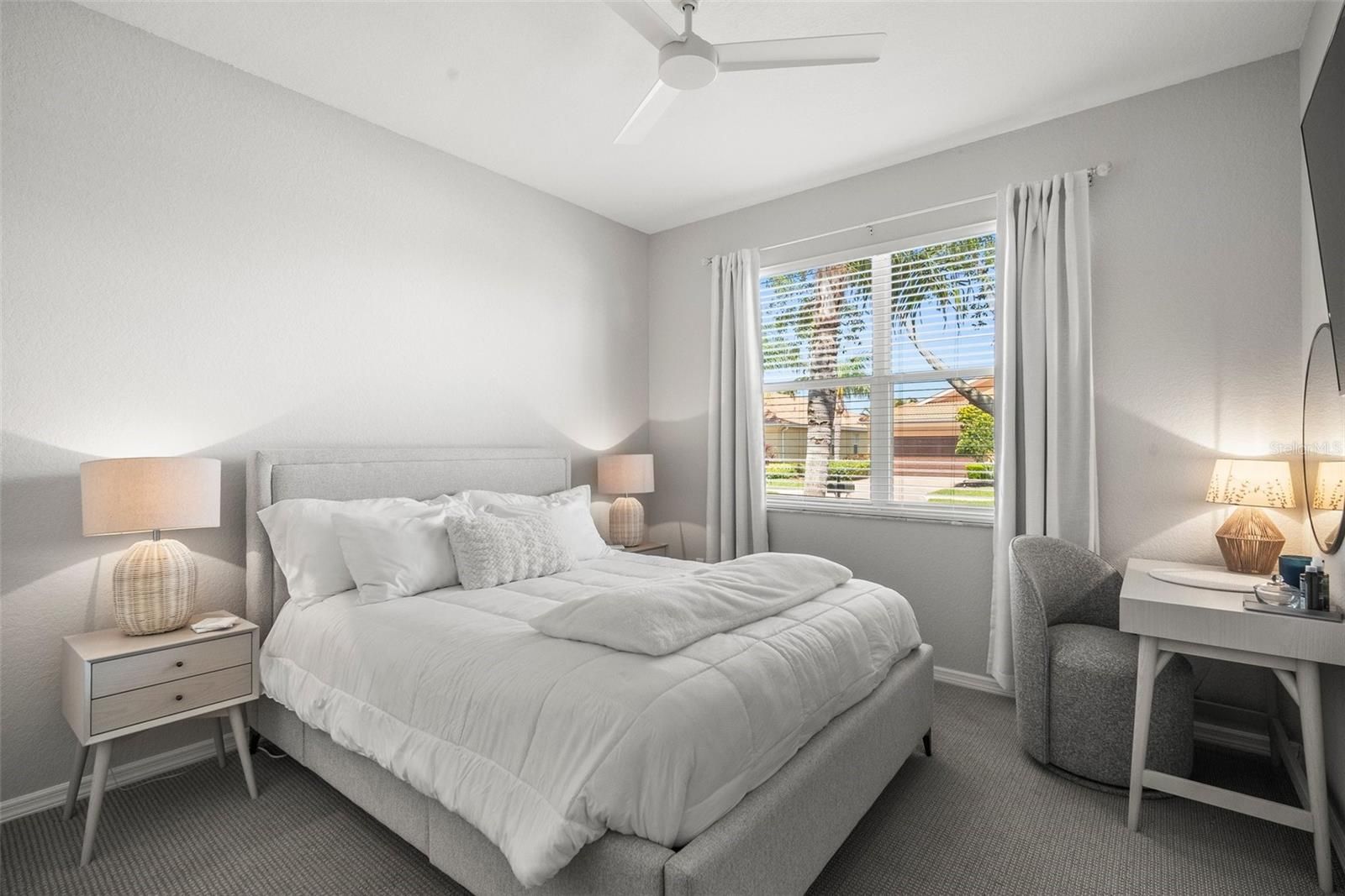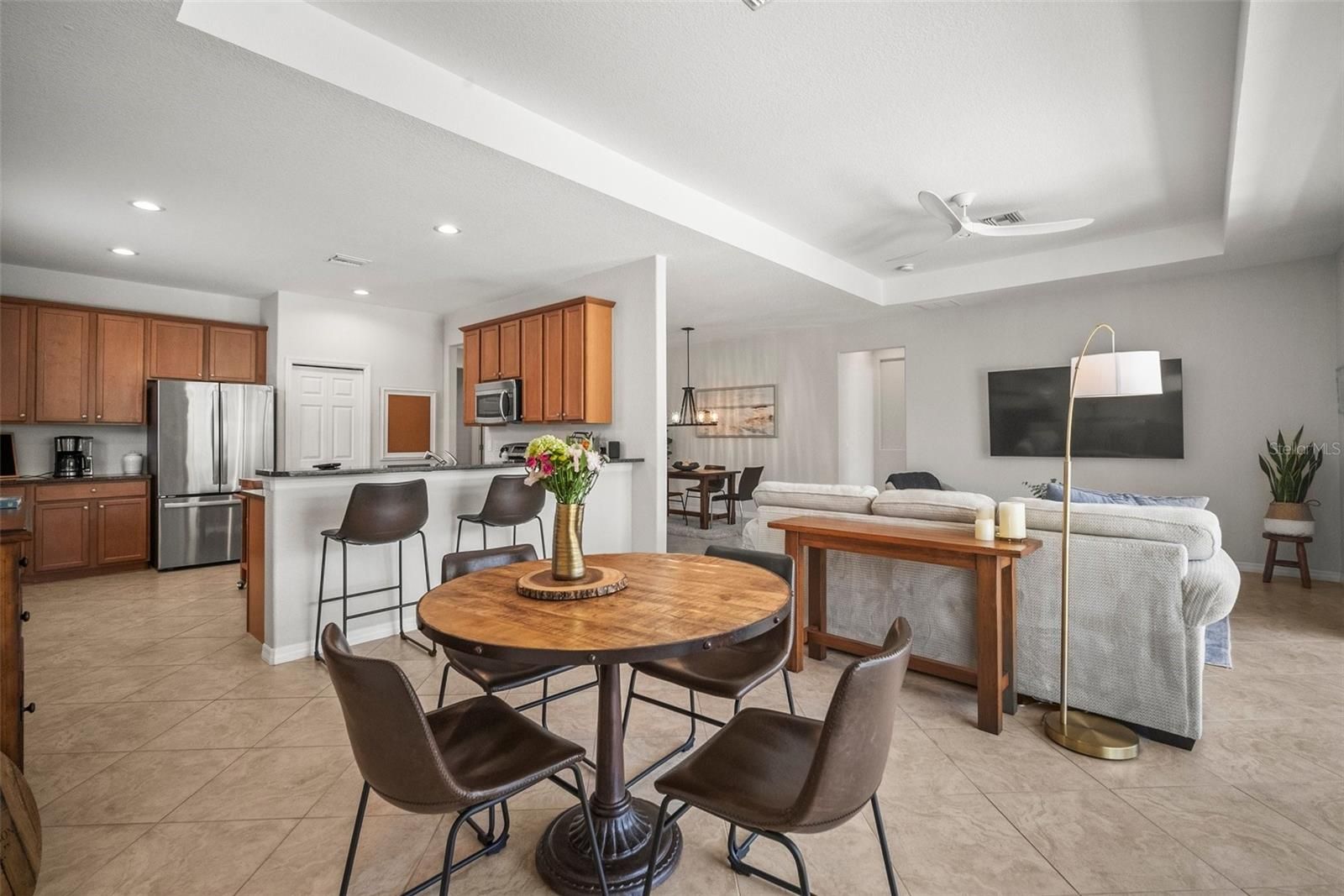 - Ceiling Fan(s), Eat-in Kitchen, High Ceilings, Kitchen/Family Room Combo, L-Shaped Dining Room, Open Floorplan, Main Level Primary, Solid-Wood Cabinets, Stone Counters, Thermostat, Walk-In Closet(s), Window Treatments