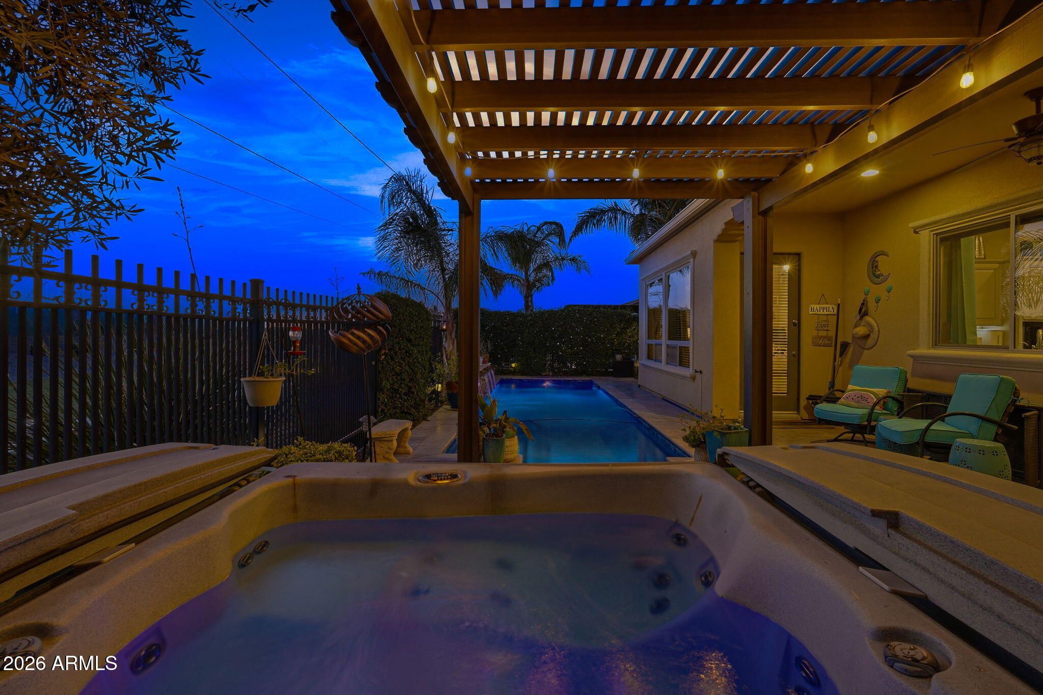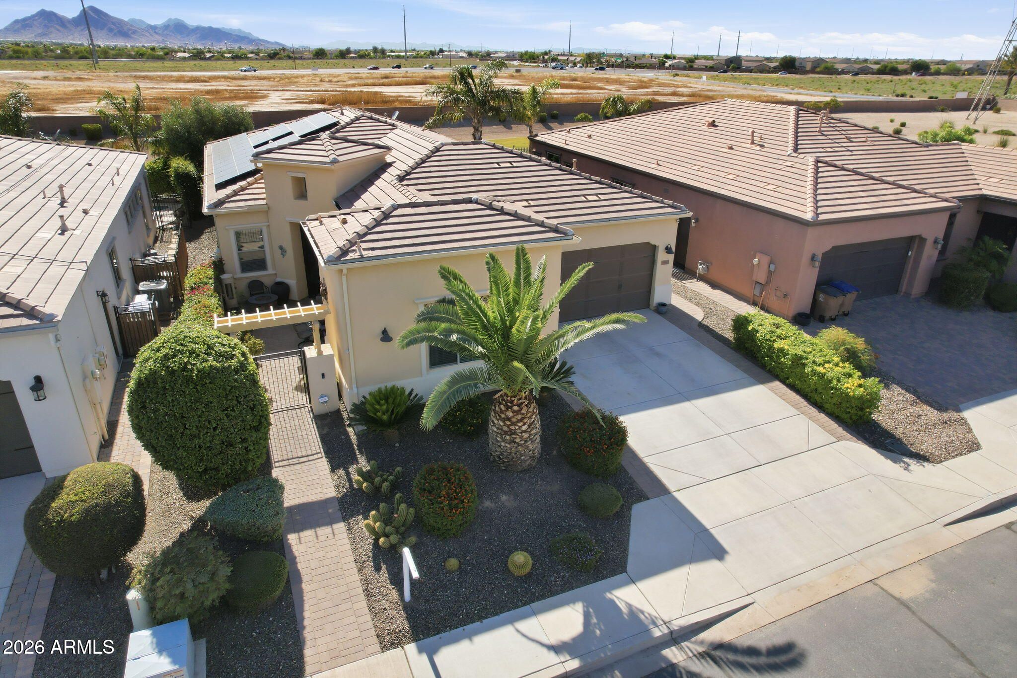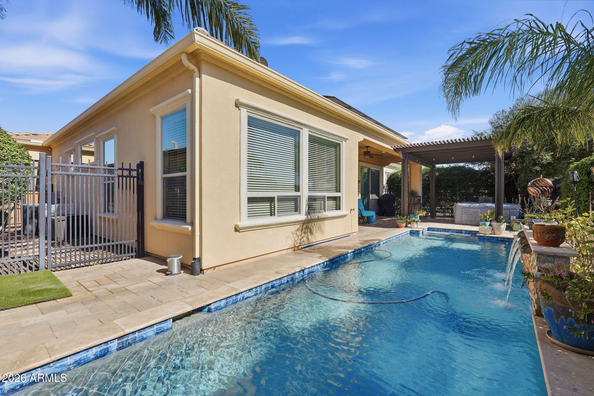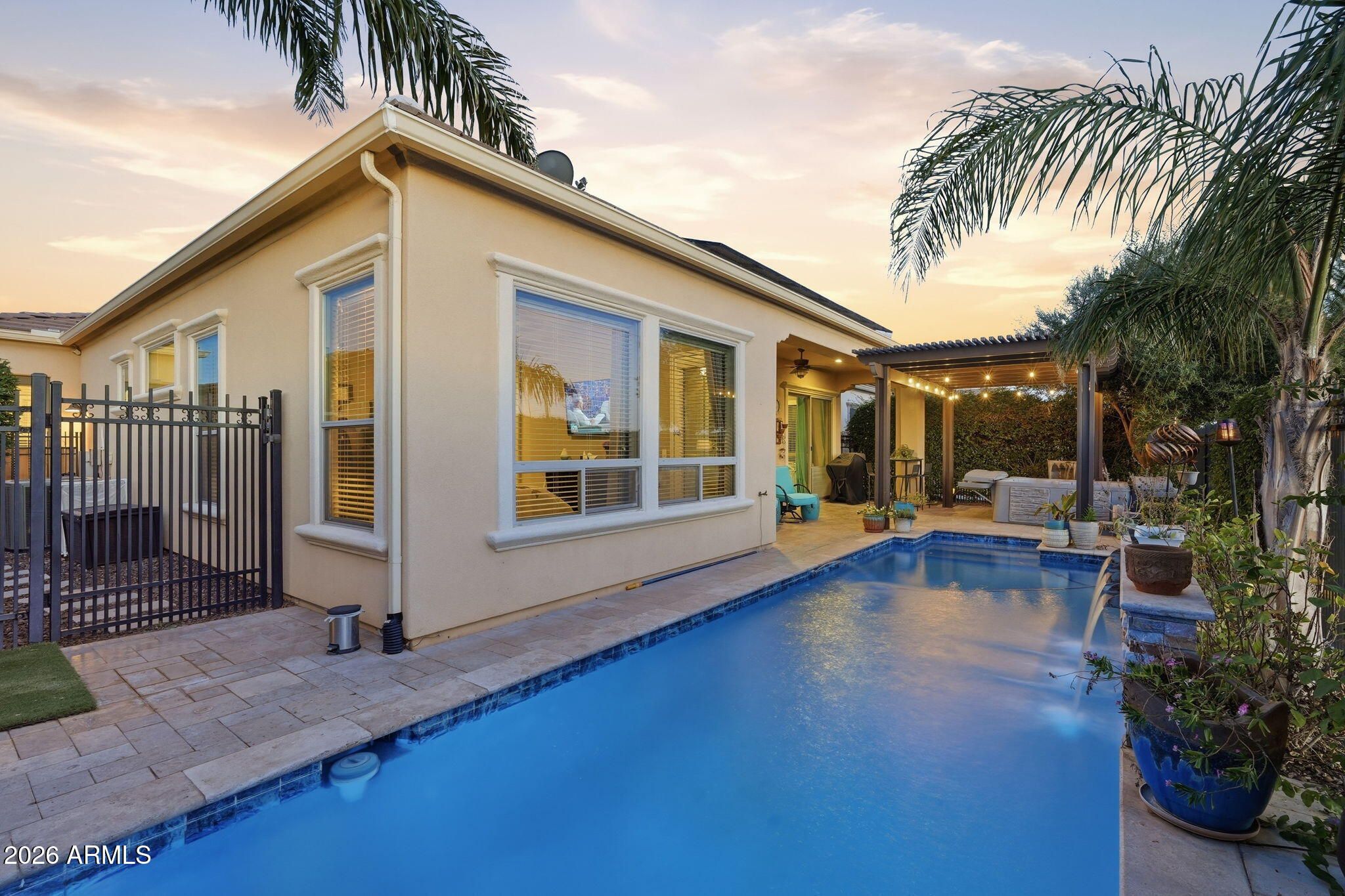 Live the Encanterra lifestyle in this newer Captivate plan near the Algarve Club & pool! This home features a private casita with its own entrance, living/work space, bedroom, bath, and plumbing for a kitchenette--ideal for guests or multigenerational living. Over $150K in upgrades including a stunning backyard all set against breathtaking mountain views for ultimate privacy and relaxation. pool, pergola, travertine patio, and above-ground spa. Chef's kitchen with large island, gas cooktop, and beautiful cabinetry opens to a great room with custom built-ins. Additional features include a library, spacious primary suite with large closet, owned solar, and mountain views!