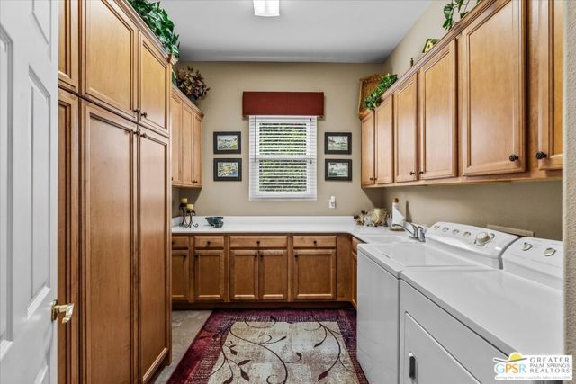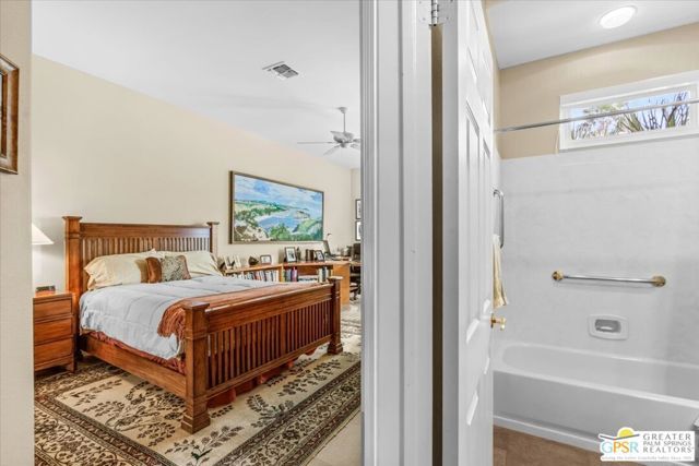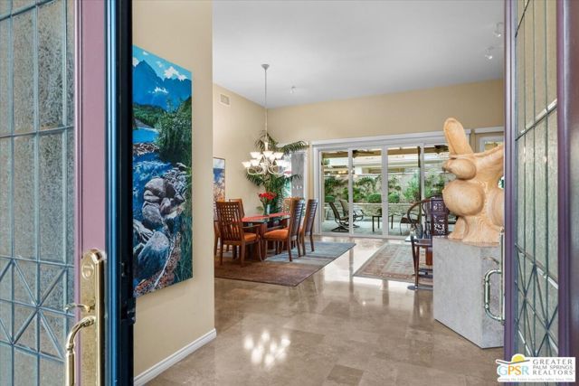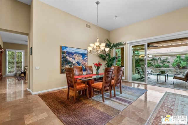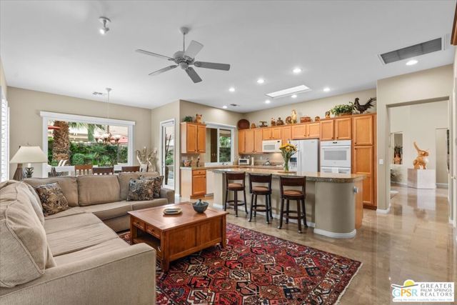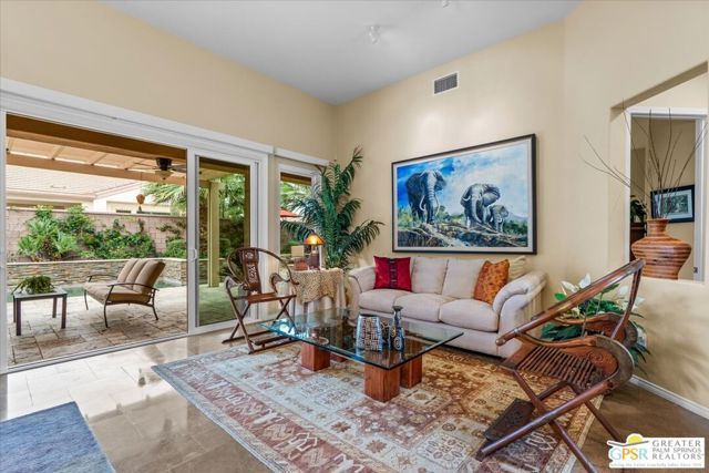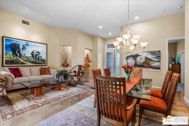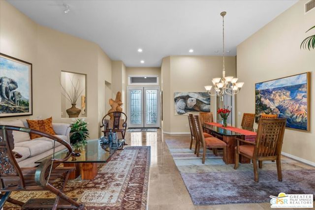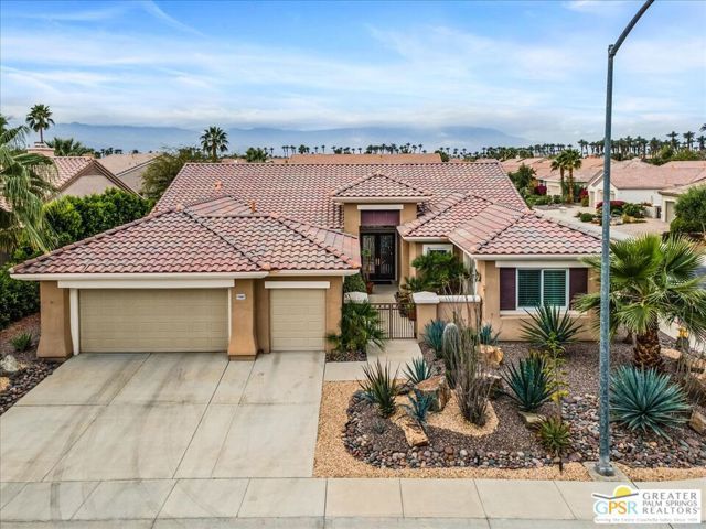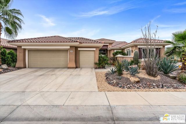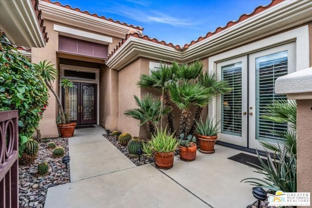 The highly sought-after "Estate Model" Monaco is one of the community's most popular floor plans, offering 3 bedrooms and 3 baths in a thoughtfully designed layout that balances comfort, privacy, and effortless desert living. Ideally situated in one of the most desirable quadrants of the community known for minimal wind and sand intrusion and no freeway noise from the I-10 this move-in-ready residence is just moments from the Lakeview Clubhouse and conveniently close to the dog park, placing premier amenities right at your fingertips. A private attached casita, accessed directly from the front gated courtyard, features its own bedroom, spacious sitting/office area, and bath perfect for guests, extended family, or a private home office. Enter through the charming courtyard and leaded-glass double doors into the elegant great room, where polished Travertine flooring, soaring ceilings, and skylights create a bright, open, and welcoming atmosphere. French sliding doors open to a beautifully designed backyard featuring natural rustic Travertine flooring, an Alumawood pergola with misting system and fans, a sparkling saltwater Pebble Tech pool and spa, outdoor kitchen, and natural gas fire pit creating the ultimate indoor-outdoor lifestyle ideal for both relaxing and entertaining. The well-appointed kitchen showcases granite tile countertops, a large center island, and opens seamlessly to the family room and breakfast nook for easy everyday living and hosting. The spacious primary suite offers a comfortable sitting area with views of the pool and outdoor entertaining spaces, while the generous primary bath features dual vanities, a custom walk-in closet, walk-in shower, and soaking tub for a true retreat experience. Additional highlights include: All-new windows and sliders (2025), Owned and paid-for solar for energy efficiency, 7-year-old HVAC system, impressive laundry room with built-in cabinetry and abundant storage. Extended 2-car garage with mini-split A/C plus dedicated golf cart garage. Kitchen & Garage refrigerator, double oven, dishwasher, microwave, washer/dryer, and outdoor mini refrigerator included to convey with sale. This exceptional home blends comfort, privacy, and resort-style 55+ living in one of the community's premier locations.