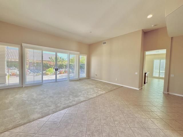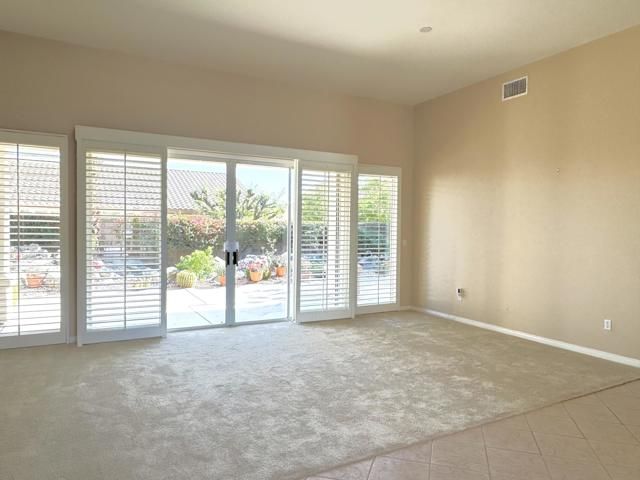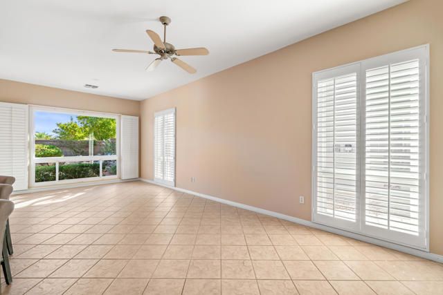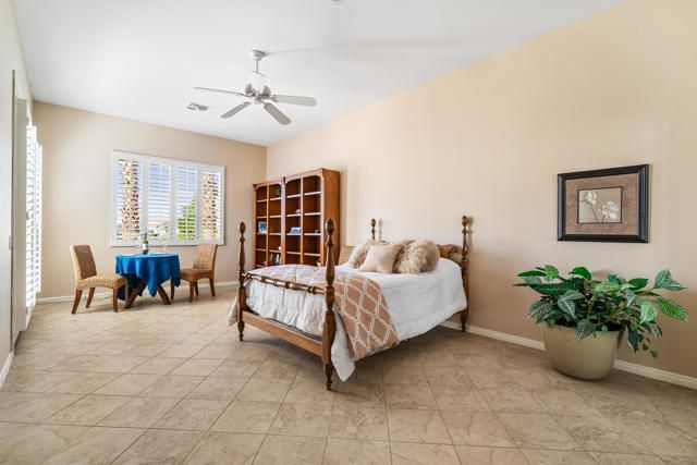 Del Webb - Sun City Palm Desert. Discover the highly sought-after Monaco floor plan, featuring two primary suites and two-and-a-half bathrooms--ideal for embracing the relaxed desert resort lifestyle. Enter through a gated courtyard and decorative glass double doors into the expansive living room, where wall-to-wall windows and sliding doors showcase serene views and provide seamless access to the back patio and yard. With the exception of the living room, the home is tiled throughout. A formal dining room adjoins the main living space, while the kitchen impresses with granite counters, a large prep island with breakfast bar, gas cooktop, double ovens, and ample cabinetry--all framed by a picture window overlooking the tranquil backyard. The kitchen flows effortlessly into the family room and breakfast nook, both offering direct patio access. The primary suite serves as a spacious private retreat, complete with a bay-window sitting area with sliding door, soaking tub, separate shower, walk-in closet, and dual sinks with a convenient sit-down vanity. The extended guest en-suite features its own full bathroom and private entrance from the gated courtyard--perfect for visitors or extended stays or a second primary bedroom suite. A well-equipped laundry room includes a utility sink, folding counter, and ample storage cabinetry. The two-car plus golf cart garage offers additional storage options. Enjoy the lushly landscaped backyard, thoughtfully designed for privacy and low maintenance. Special highlights include an extended patio with alumawood overhang, a babbling brook water feature, and shutters on nearly all windows and sliders. A/C unit replaced approximately two years ago.
