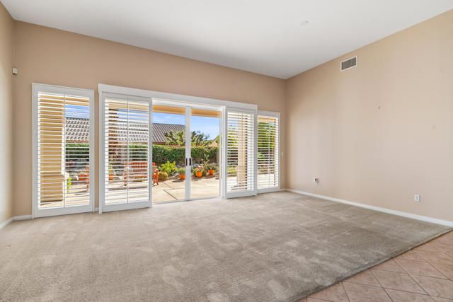 Del Webb - Sun City Palm Desert. Discover the highly sought-after Monaco floor plan, featuring two primary suites and two-and-a-half bathrooms--ideal for embracing the relaxed desert resort lifestyle. Enter through a gated courtyard and decorative glass double doors into the expansive living room, where wall-to-wall windows and sliding doors showcase serene views and provide seamless access to the back patio and yard. With the exception of the living room, the home is tiled throughout. A formal dining room adjoins the main living space, while the kitchen impresses with granite counters, a large prep island with breakfast bar, gas cooktop, double ovens, and ample cabinetry--all framed by a picture window overlooking the tranquil backyard. The kitchen flows effortlessly into the family room and breakfast nook, both offering direct patio access. The primary suite serves as a spacious private retreat, complete with a bay-window sitting area with sliding door, soaking tub, separate shower, walk-in closet, and dual sinks with a convenient sit-down vanity. The extended guest en-suite features its own full bathroom and private entrance from the gated courtyard--perfect for visitors or extended stays or a second primary bedroom suite. A well-equipped laundry room includes a utility sink, folding counter, and ample storage cabinetry. The two-car plus golf cart garage offers additional storage options. Enjoy the lushly landscaped backyard, thoughtfully designed for privacy and low maintenance. Special highlights include an extended patio with alumawood overhang, a babbling brook water feature, and shutters on nearly all windows and sliders. One A/C unit was replaced approximately two years ago.