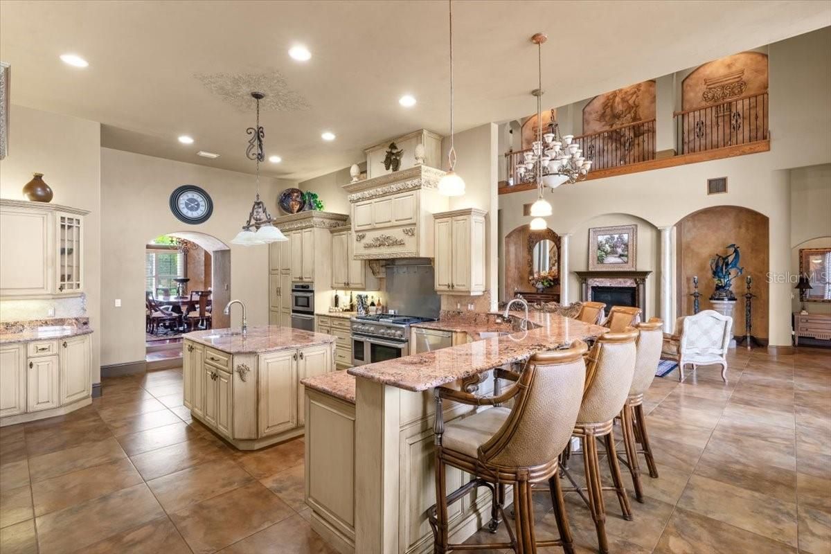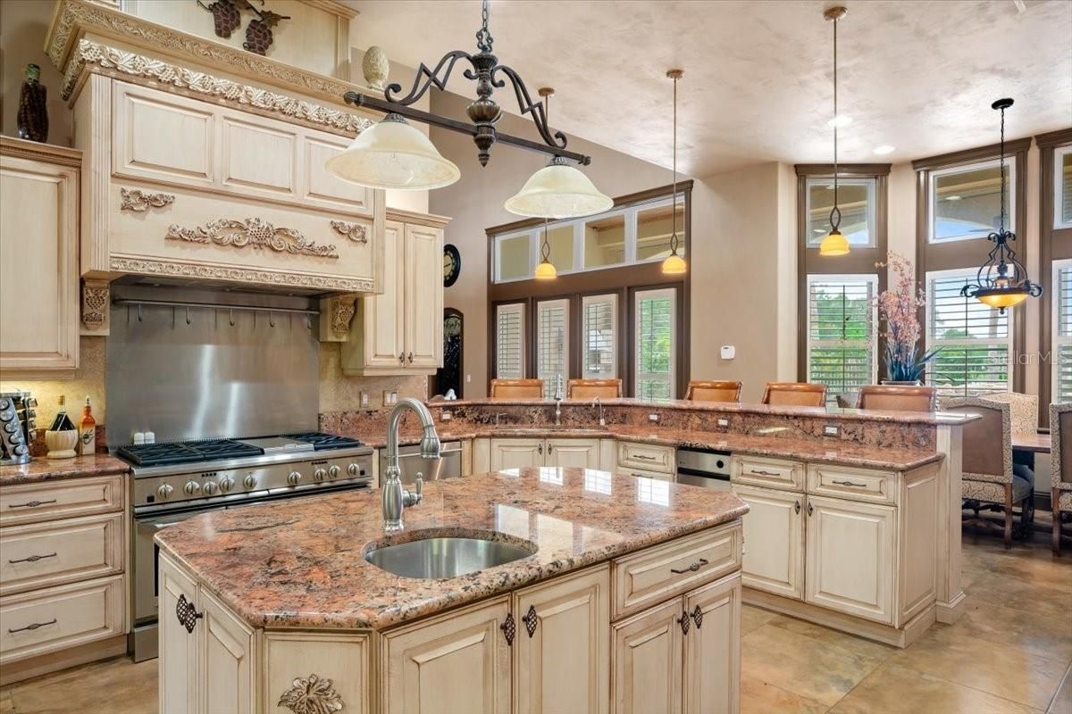 - Built-in Features, Ceiling Fan(s), Central Vacuum, Coffered Ceiling(s), Crown Molding, Eat-in Kitchen, High Ceilings, L-Shaped Dining Room, Open Floorplan, Main Level Primary, Solid-Wood Cabinets, Split Bedrooms, Stone Counters, Thermostat, Vaulted Ceiling(s), Walk-In Closet(s), Wet Bar, Window Treatments