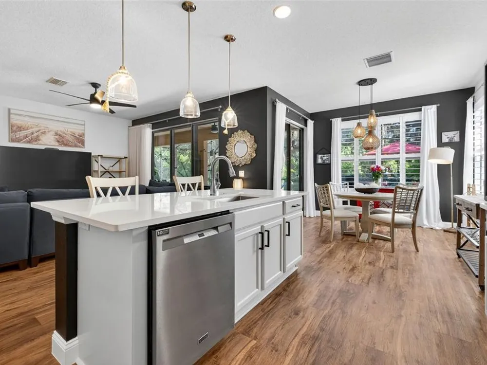 - Ceiling Fan(s), Eat-in Kitchen, High Ceilings, Kitchen/Family Room Combo, Open Floorplan, Solid-Wood Cabinets, Split Bedrooms, Stone Counters, Thermostat, Walk-In Closet(s)