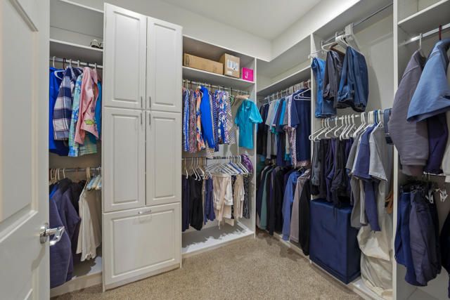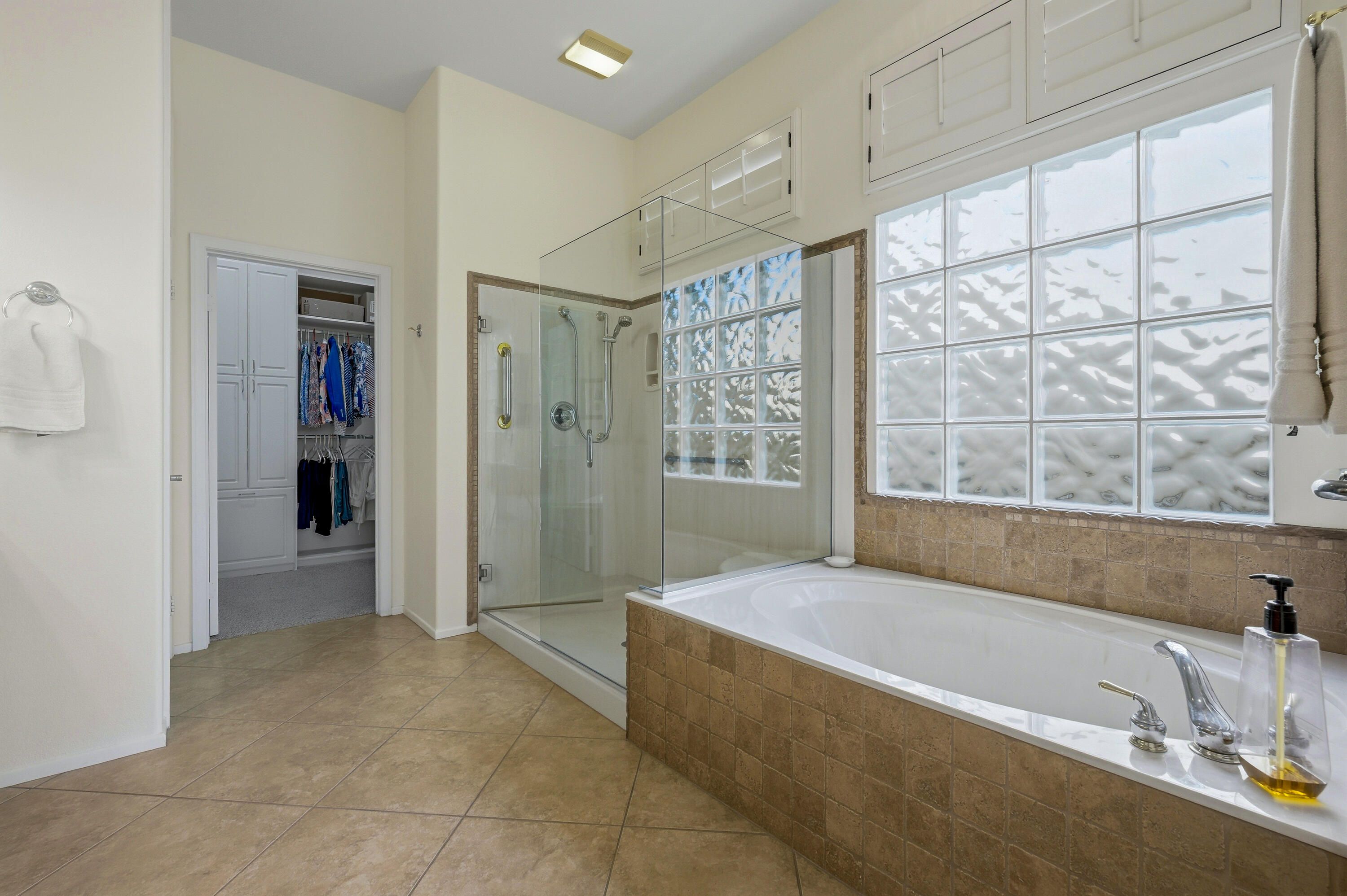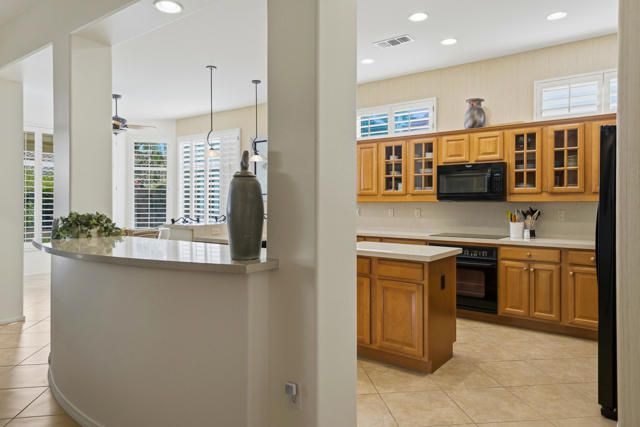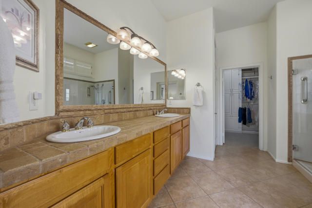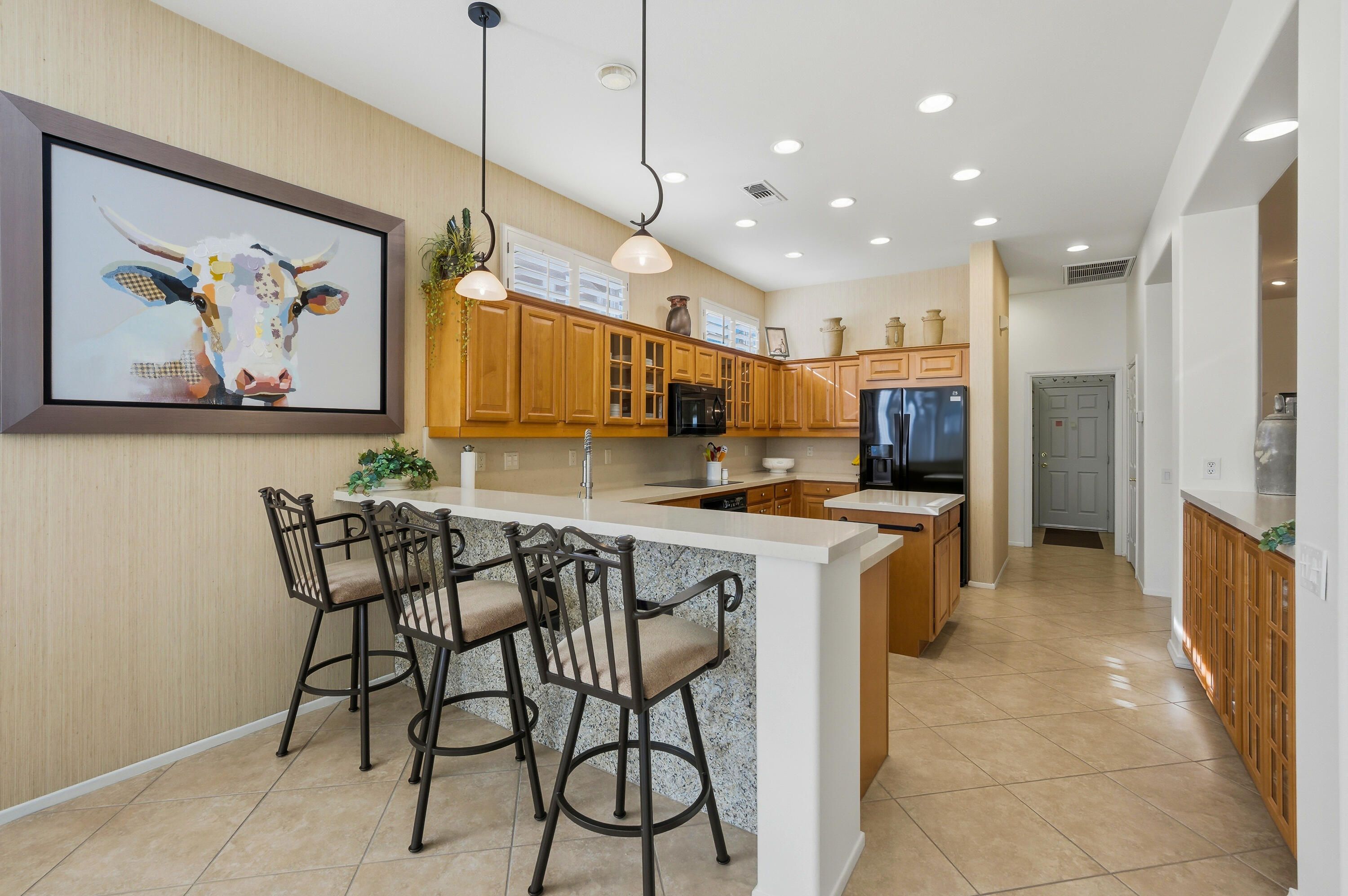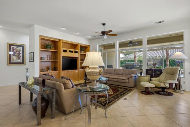 Sun City Palm Desert - Monterey. This highly sought-after great room home is ideally situated between the Lake View and Sunset View Clubhouses and just around the corner from the 18-hole putting course. The spacious east-facing rear yard is designed for outdoor living, featuring an extended decorative concrete patio with sitting wall, a large BBQ island with bar seating, a tranquil fountain, and lush desert landscaping accented by palm trees. Inside, 10-foot ceilings with transom windows create a bright, open atmosphere. Diagonally laid 18-inch tile flooring extends throughout the home, excluding the bedrooms, and plantation shutters are featured throughout. The great room offers a custom built-in media center with surround sound, perfect for entertaining or relaxing. The kitchen is both stylish and functional, showcasing quartz countertops, a breakfast bar with pendant lighting, upgraded single-basin sink and fixtures, smooth glass cooktop (also plumbed for gas), and raised-panel cabinetry with inset glass doors and pull-out shelves. Matching raised-panel maple cabinetry continues into the laundry room and bathrooms. Off the great room, rain-glass French doors lead to a spacious den or office. The generous primary suite includes a sliding door to the rear patio, a large walk-in closet with custom built-in storage, and an en suite bath with dual sinks, a stall shower with rimless glass enclosure, and an oversized soaking tub with stone tile backsplash and counters, complemented by upgraded mirrors and lighting. A pedestal sink highlights the powder room, while the spacious guest suite features mirrored wardrobe doors and an en suite bath with tub/shower combination and upgraded counters, mirror, and lighting. Additional features include a 2+ car garage with dedicated golf cart space, its own air conditioning unit, hanging rack, and built-in storage. The water heater was replaced in 2017.