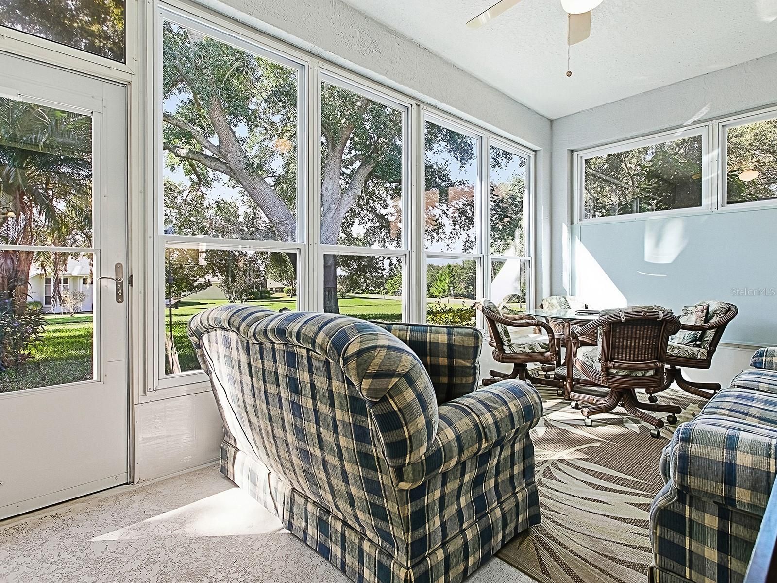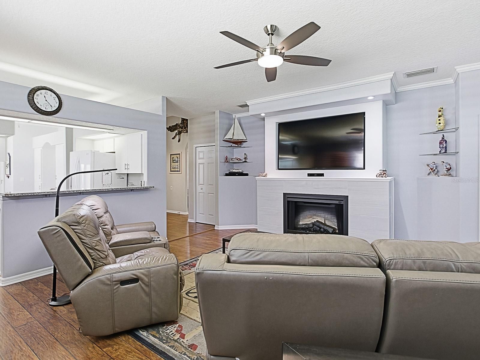 Move in ready! You’re going to love this charming home with a wonderful open floor plan with crown molding in living room and beautiful dental molding in the Foyer. Custom-built fireplace with electric heat for those chilly nights or cool mornings! TV will be conveyed with sale if buyer chooses. Solid surface counters in the spacious kitchen overlooking the living room and the breakfast nook, built in desk & closet pantry, no carpet Laminate floors look like wood, tile in bathrooms. This split bedroom floor plan is great when you have guests. Guest bathroom has double sinks. Large master bathroom with double sinks. Enclosed Florida room with full pocket sliding glass doors, great when entertaining, privacy window tint on the windows this gives you an extra 180 Sq ft of living space and a fantastic view of green space with no rear neighbors. Open 8 x 10 patio great space for grilling your favorite foods. Screen doors on oversized garage 20 x 25 Fresh paint inside and out in 2025. Concrete landscape curbing is great for nicepolished look. Don’t wait this charming house won’t last long!