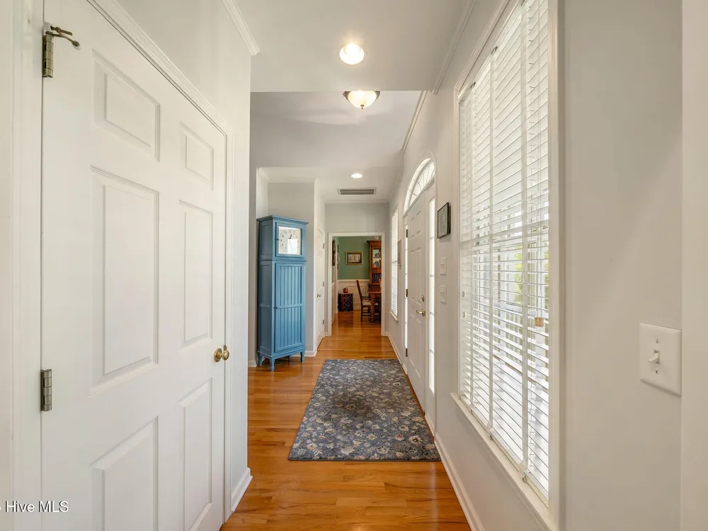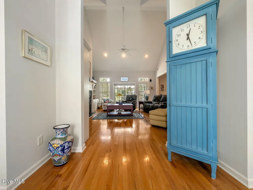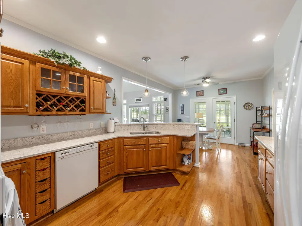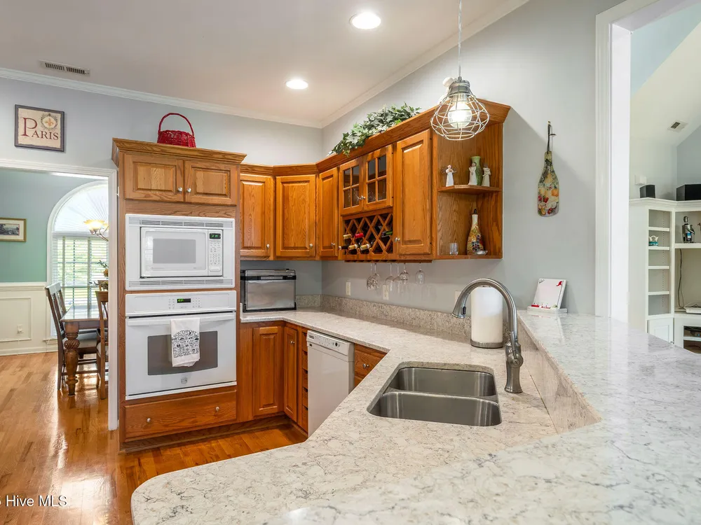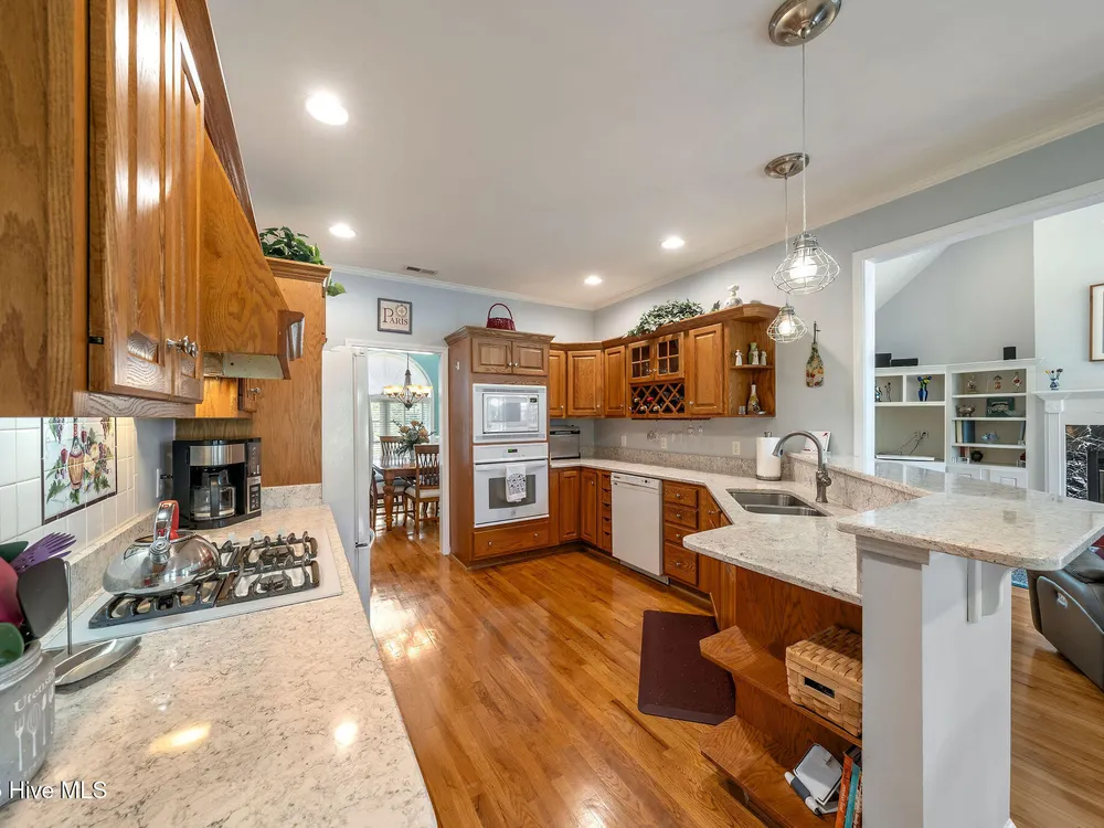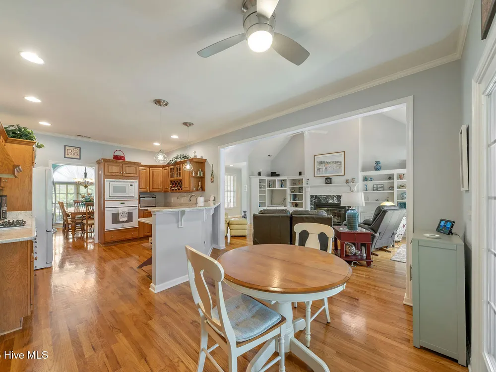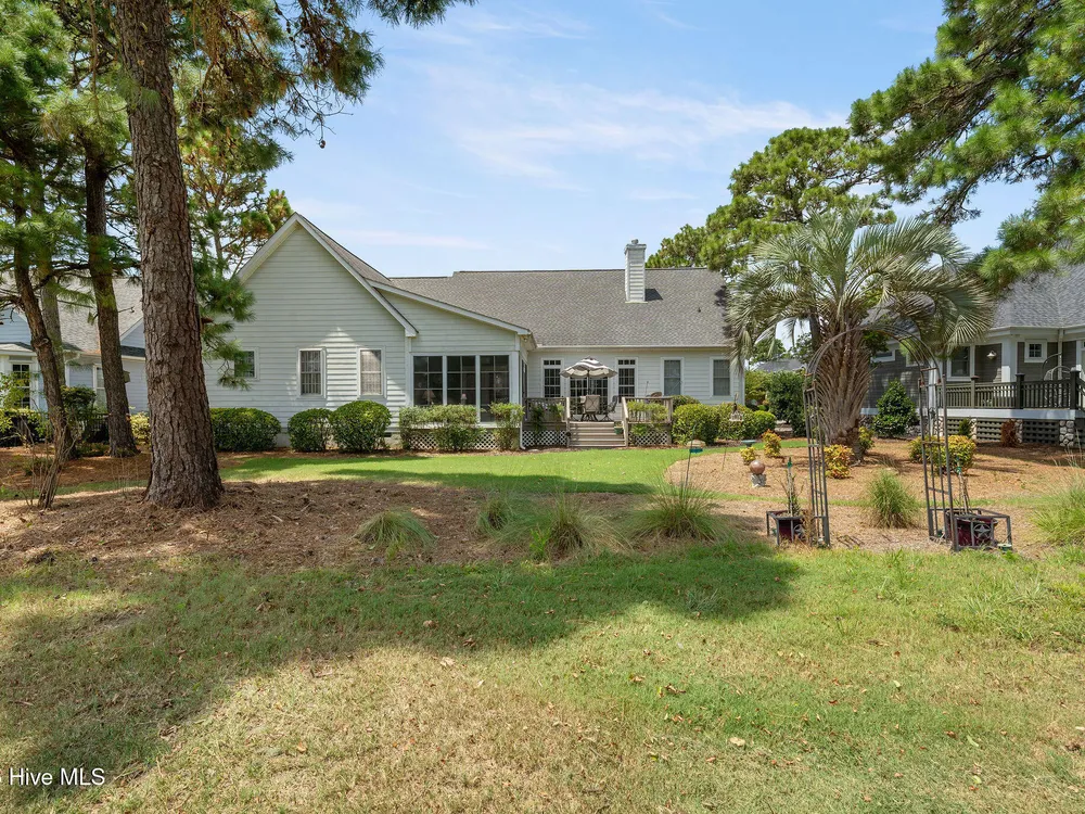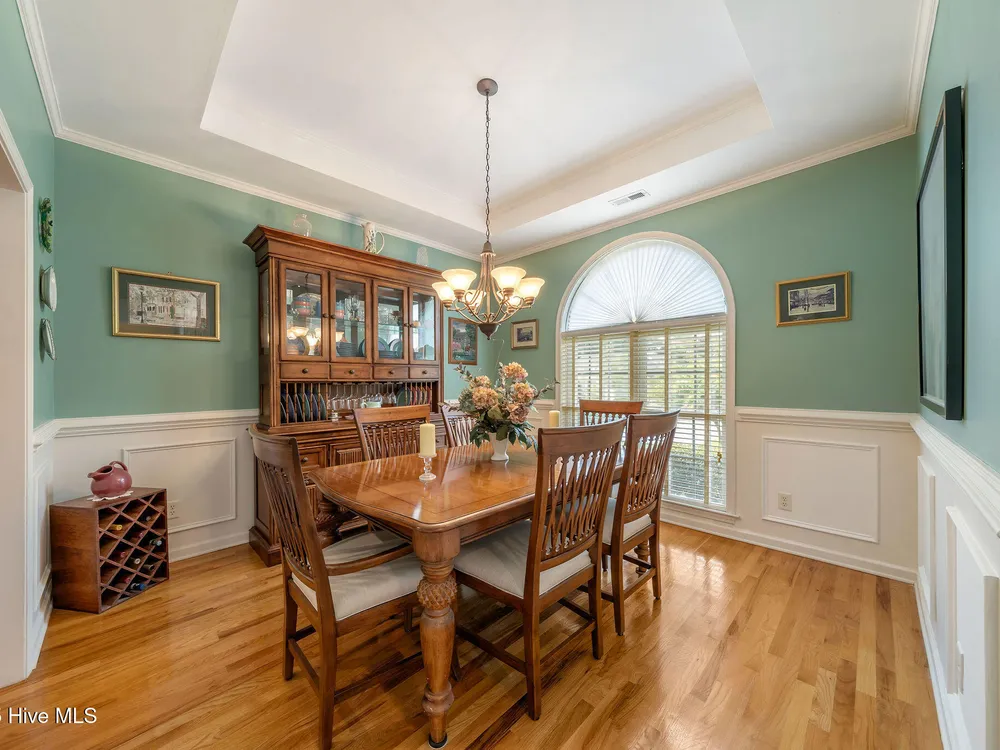 This beautifully maintained 3-bedroom, 2.5-bathroom home offers 2,486 square feet of living space on the Members Club golf course in St. James Plantation. The roof was replaced in 2019, and the heating/cooling system was replaced in 2021. A manicured front lawn and paved driveway with attractive brick pillar walls sets the stage for this low country style home. The welcoming front porch invites you to relax, while the front door elegantly framed by an arched transom and sidelights sets a warm and timeless tone as you step inside. The dramatic and bright foyer features a beautiful dormer window and real three-quarter inch oak flooring that flows seamlessly through the common areas. Just off the entry, the formal dining room exudes elegance with its tray ceiling, custom wainscoting, and a striking arched window. This inviting space connects effortlessly to the kitchen, where granite counters, abundant cabinetry, a built-in wine rack, wall-mounted oven and microwave, gas cooktop, raised bar peninsula, and cozy breakfast nook create the perfect blend of style and function for both everyday living and entertaining. The kitchen opens to a spacious great room highlighted by a soaring cathedral ceiling and a cozy gas fireplace flanked by custom built in cabinetry perfect for your media center or storage. Enjoy amazing views of the 6th golf hole of the Members club golf course from the convenient and spacious 3-season room. This versatile area can be used as a screened porch or cozy room in the fall and winter. Sliding glass doors invite you out to the back deck, an ideal spot to soak up the sun and enjoy the mild Carolina weather. The thoughtfully designed floor plan offers maximum privacy with the owner's suite tucked away from the guest bedrooms. This serene retreat features cozy carpeting, a tray ceiling, and a spacious en-suite bathroom. The bathroom boasts a dual sink vanity, jetted tub, walk-in shower, and direct access to a well-organized walk-in closet.