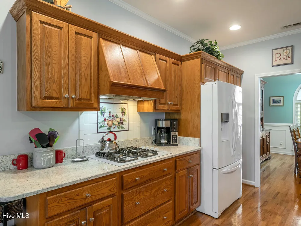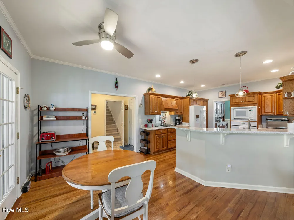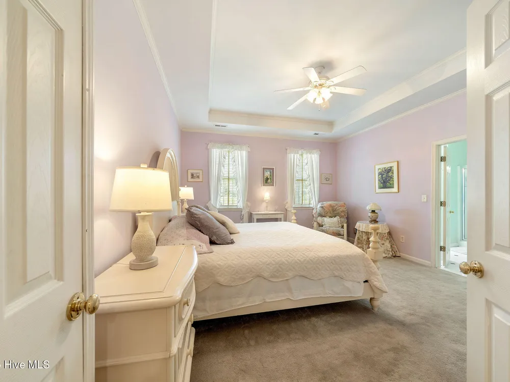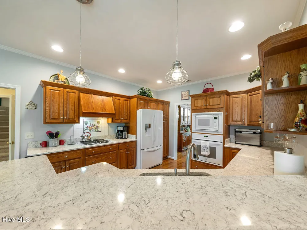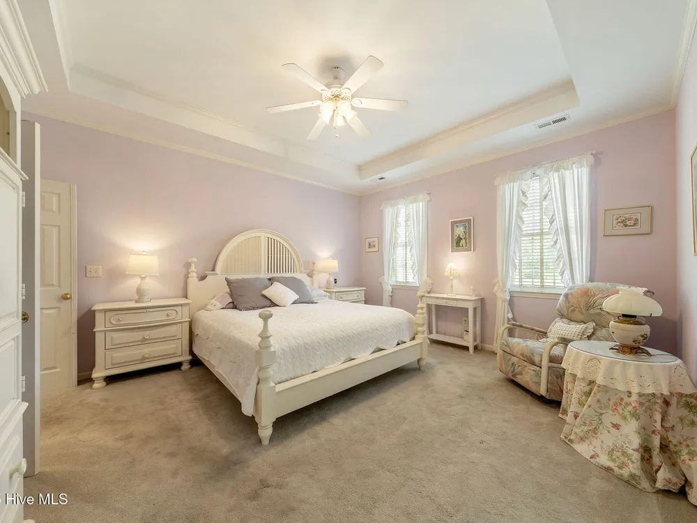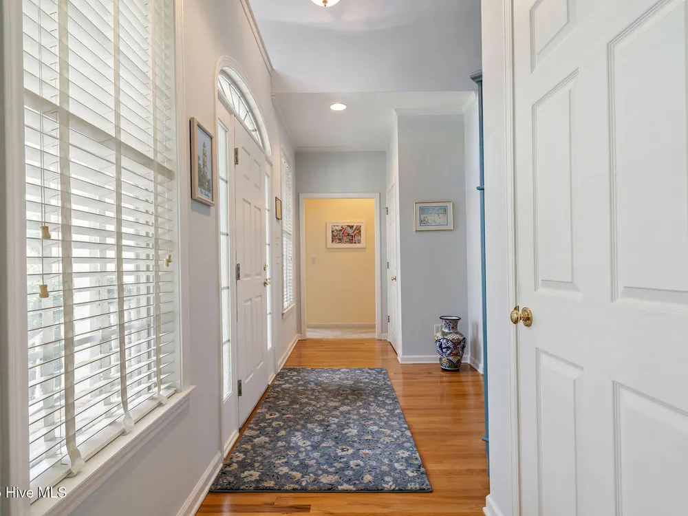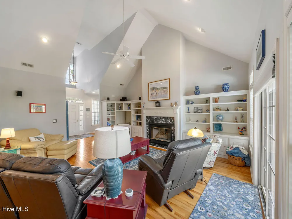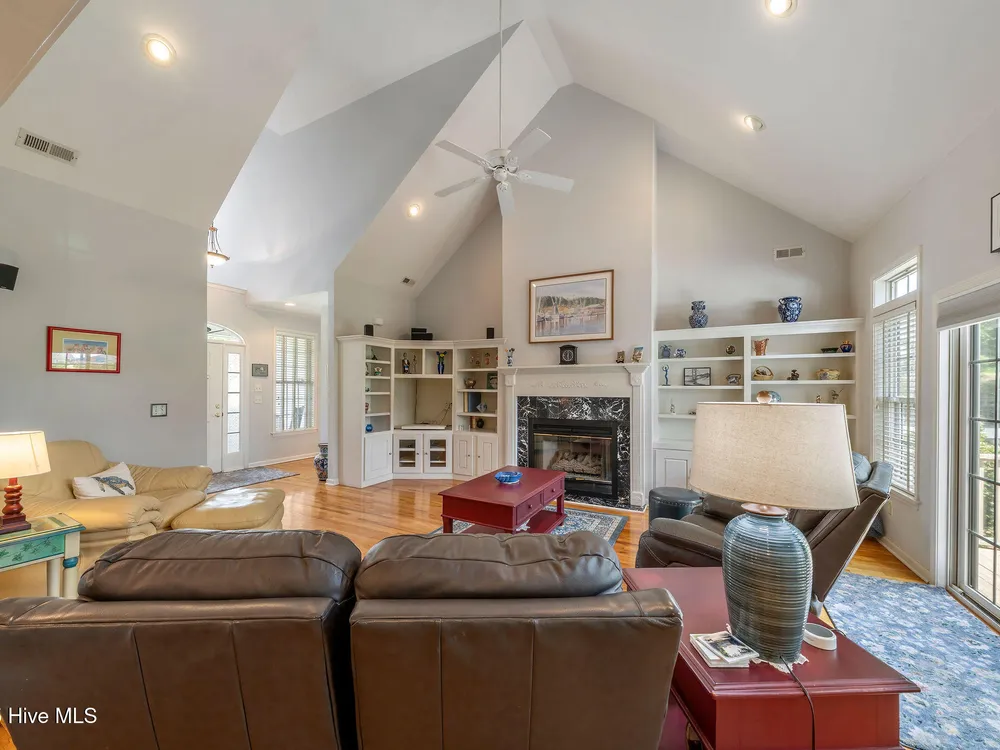 This beautifully maintained 3-bedroom, 2.5-bathroom home offers 2,486 square feet of living space on the Members Club golf course in St. James Plantation. The roof was replaced in 2019, and the heating/cooling system was replaced in 2021. A manicured front lawn and paved driveway with attractive brick pillar walls sets the stage for this low country style home. The welcoming front porch invites you to relax, while the front door elegantly framed by an arched transom and sidelights sets a warm and timeless tone as you step inside. The dramatic and bright foyer features a beautiful dormer window and real three-quarter inch oak flooring that flows seamlessly through the common areas. Just off the entry, the formal dining room exudes elegance with its tray ceiling, custom wainscoting, and a striking arched window. This inviting space connects effortlessly to the kitchen, where granite counters, abundant cabinetry, a built-in wine rack, wall-mounted oven and microwave, gas cooktop, raised bar peninsula, and cozy breakfast nook create the perfect blend of style and function for both everyday living and entertaining. The kitchen opens to a spacious great room highlighted by a soaring cathedral ceiling and a cozy gas fireplace flanked by custom built in cabinetry perfect for your media center or storage. Enjoy amazing views of the 6th golf hole of the Members club golf course from the convenient and spacious 3-season room. This versatile area can be used as a screened porch or cozy room in the fall and winter. Sliding glass doors invite you out to the back deck, an ideal spot to soak up the sun and enjoy the mild Carolina weather. The thoughtfully designed floor plan offers maximum privacy with the owner's suite tucked away from the guest bedrooms. This serene retreat features cozy carpeting, a tray ceiling, and a spacious en-suite bathroom. The bathroom boasts a dual sink vanity, jetted tub, walk-in shower, and direct access to a well-organized walk-in closet.