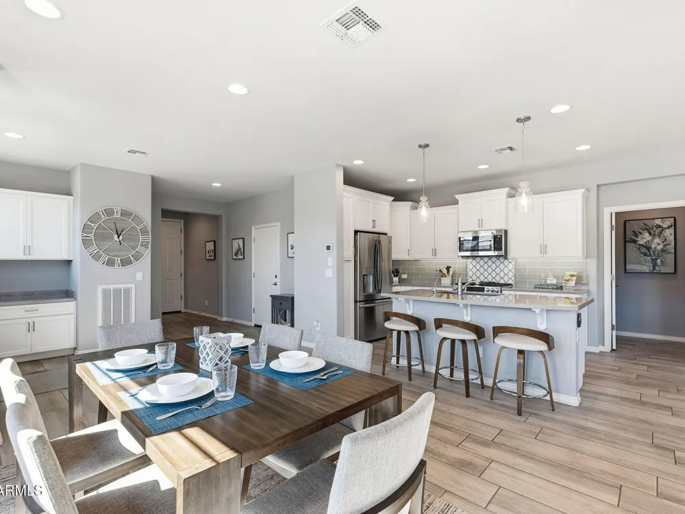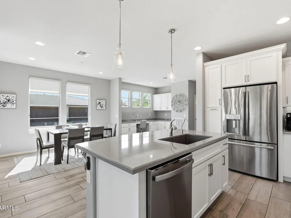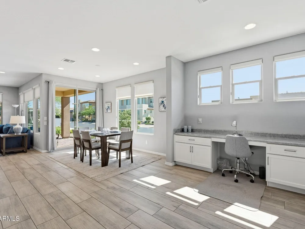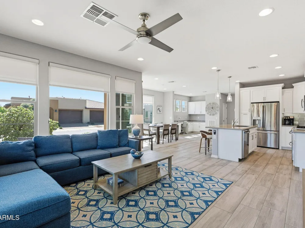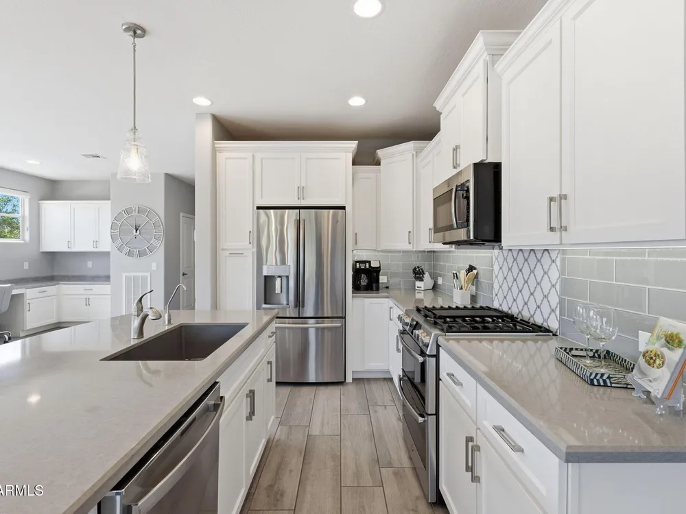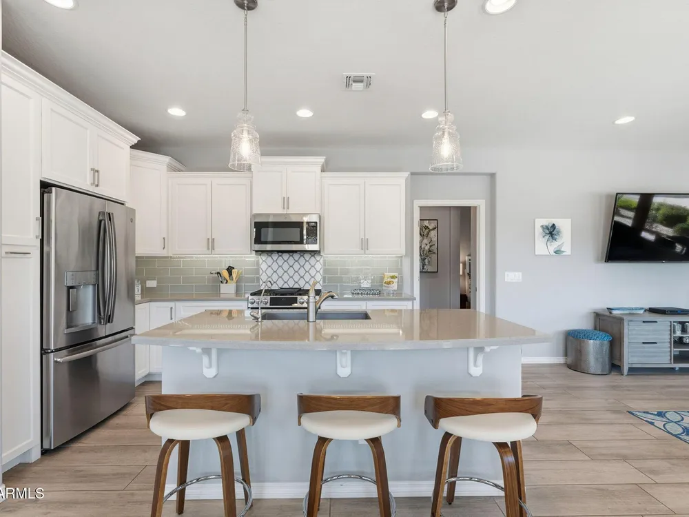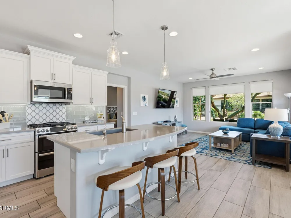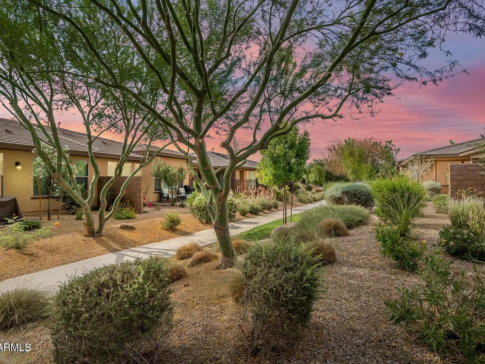 Discover this beautifully FULLY FURNISHED Muros plan in the sought-after Resort Collection at Encanterra. Nestled on a premium corner homesite, this popular model is filled with natural light and features a thoughtfully designed layout. The kitchen offers elegant white cabinetry, upgraded lighting, and a custom backsplash that ties the space together perfectly. Both bathrooms showcase stylish tile-surround showers and upgraded fixtures. The office alcove provides an ideal workspace with ample additional storage. Whether you're a seasonal visitor or a full-time resident, this home offers the perfect blend of comfort and convenience. Just steps from both clubhouses, the Resort Collection ensures a low-maintenance lifestyle, allowing you to fully enjoy Encanterra's incredible lifestyle.