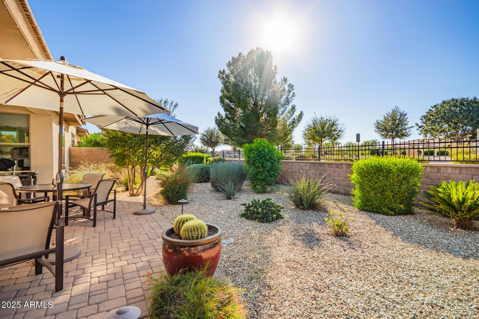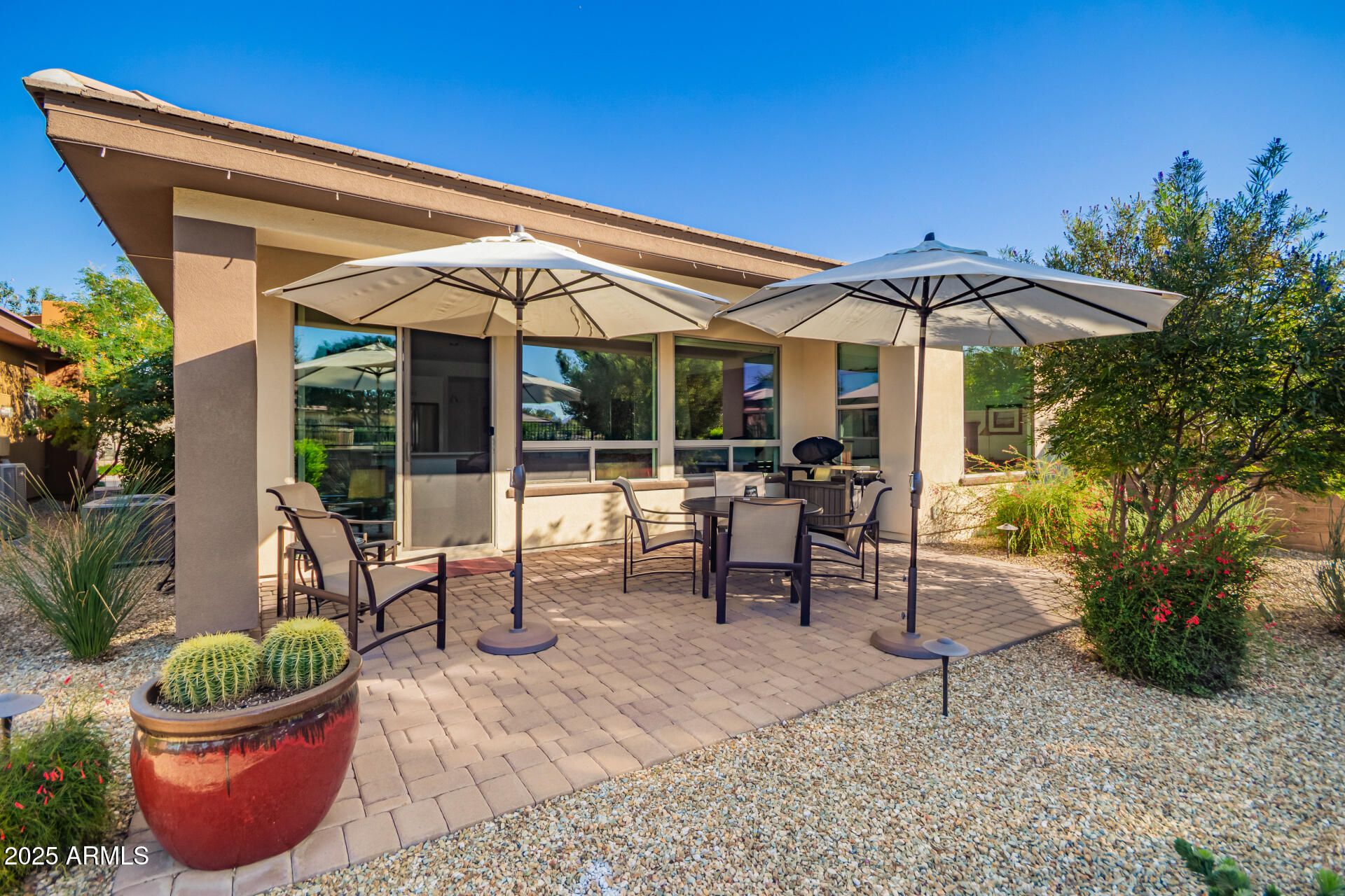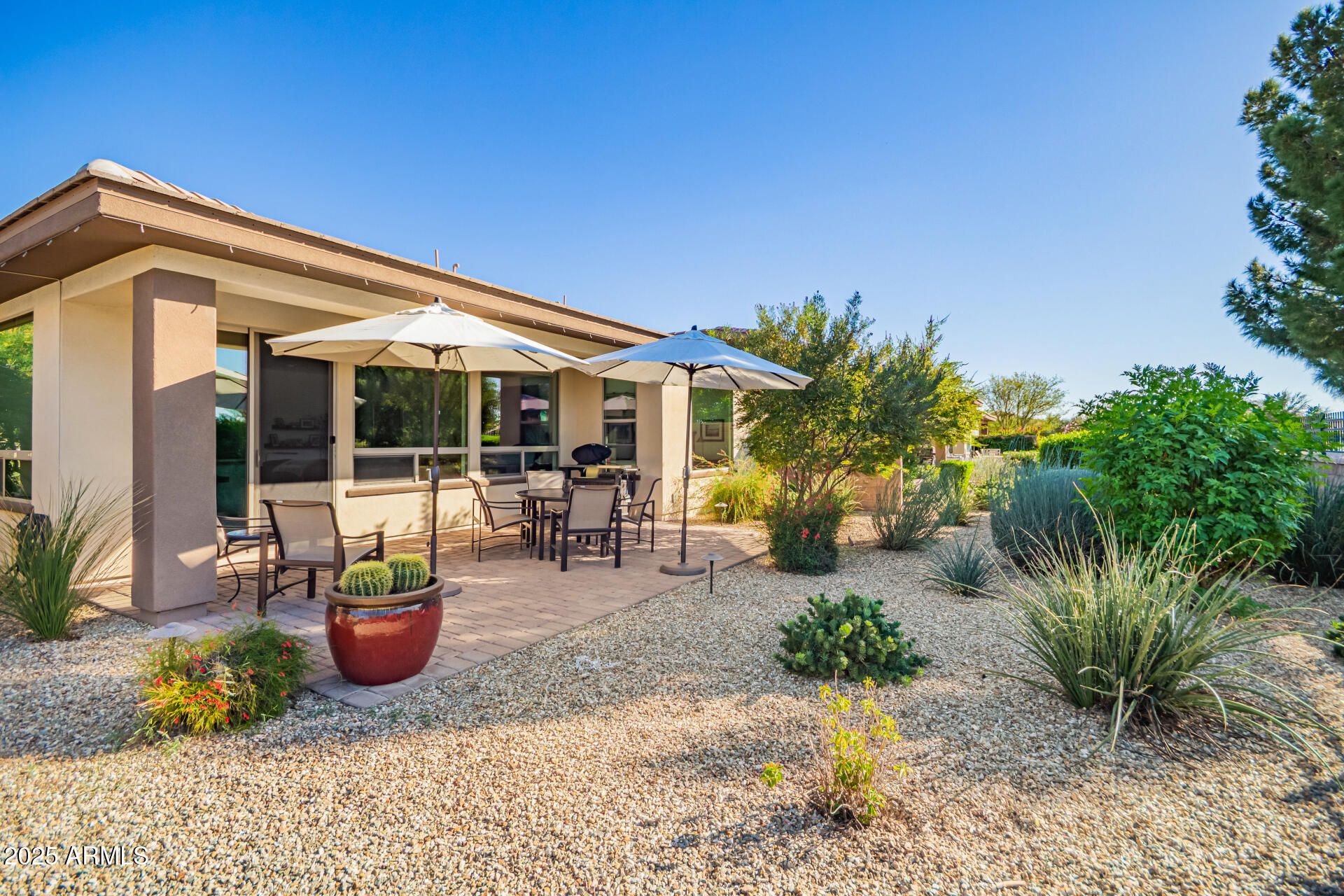 This 2-bedroom residence features plenty of space for entertaining with a captivating open layout w/high ceilings, a soothing palette, 2'' recessed LED lighting w/dimmers inside & out, attractive wood plank flooring & custom window sills . The gourmet kitchen has quartz counters & matching backsplash, crisp white shaker cabinets w/crown molding, chic pendant lighting, stainless steel appliances, composite sink & an island w/a breakfast bar. The primary bedroom ensuite has double vanities & a generous walk-in closet. Office space & a spacious guest room complete the inside. The backyard offers a covered patio perfect for dining w/high-powered misters to keep you cool. Encanterra boasts a true country club lifestyle with tennis courts, award-winning golf course & more. Furniture available.