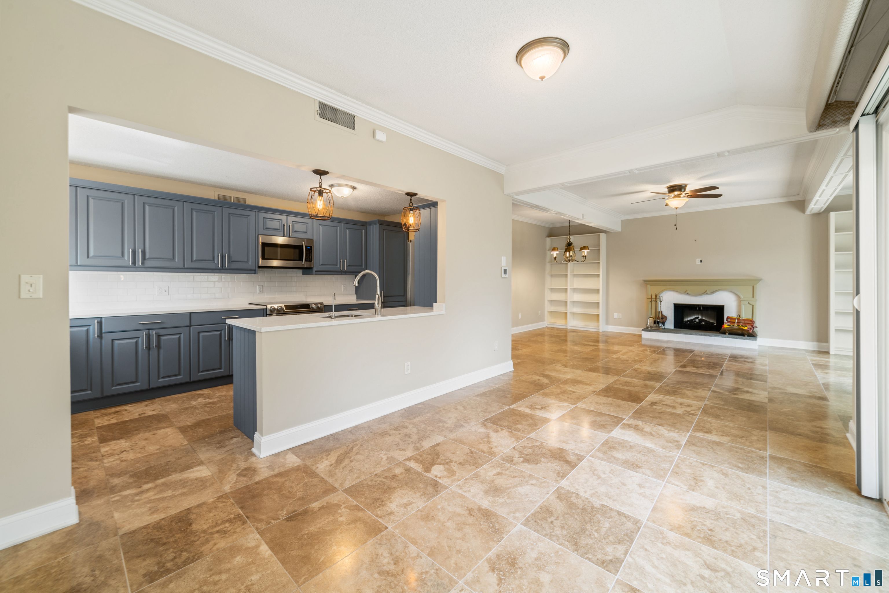 This three-bedroom, two-full-bathroom Berkshire model condo in Heritage Circle, Southbury, offers a private setting on a cul-de-sac. The Heritage Circle community features 89 condominiums and provides residents with access to a pool and tennis courts. Inside, the home boasts an open floor plan with oversized tile flooring. The kitchen is equipped with blue cabinets, pull-out drawers, a pantry, stainless steel appliances, quartz countertops, and white subway tile. It opens directly to the dining room, which features new sliders leading to a spacious patio and scenic views. The living room, connected to the dining area, includes built-ins, new sliders, an electric fireplace, and a ceiling fan. The sliders are fitted with sliding shades for light control. The primary bedroom offers built-ins, a walk-in closet, and a full bath with two sinks and a shower stall. Two additional bedrooms are also equipped with automatic darkening shades. The property includes attic insulation and a two-car garage with storage and workspace. Further enhancing the home's functionality are a whole-house generator, operated by propane, and an ambulance strobe locator. A one-time buy-in fee to Heritage Circle is required at closing, which is four times the monthly HOA fee. The HOA fee for Heritage Circle typically ranges from approximately $414 to $642 per month and covers amenities such as grounds maintenance, trash removal, snow removal, and pool service.