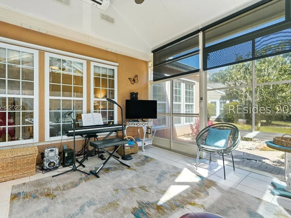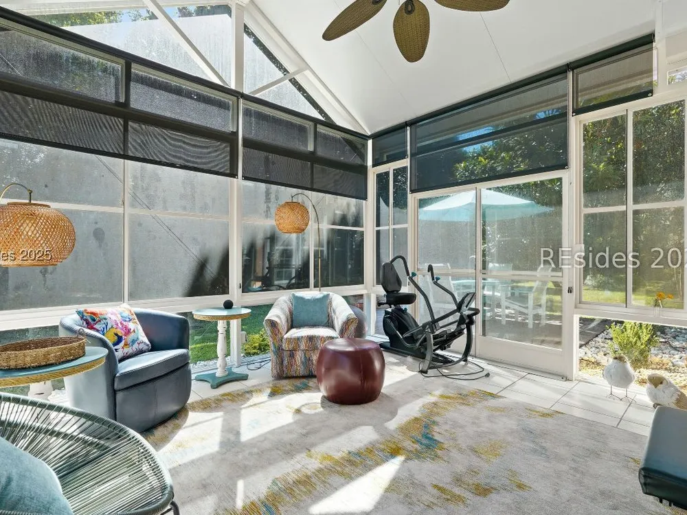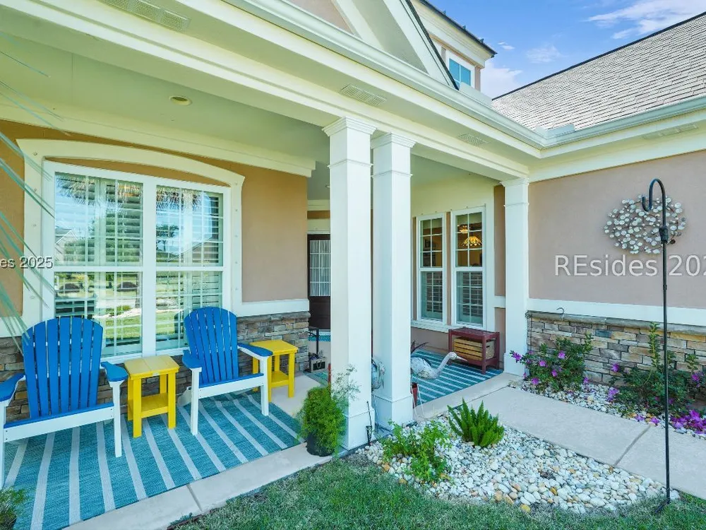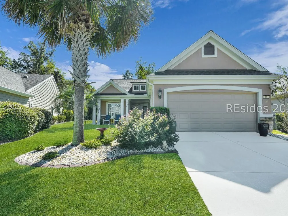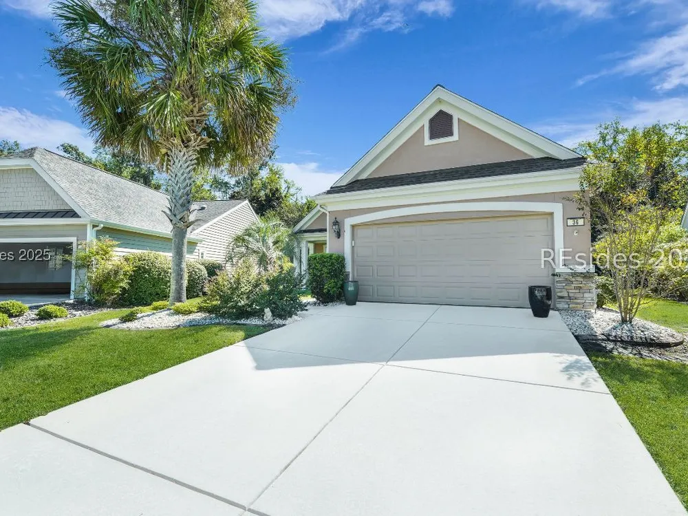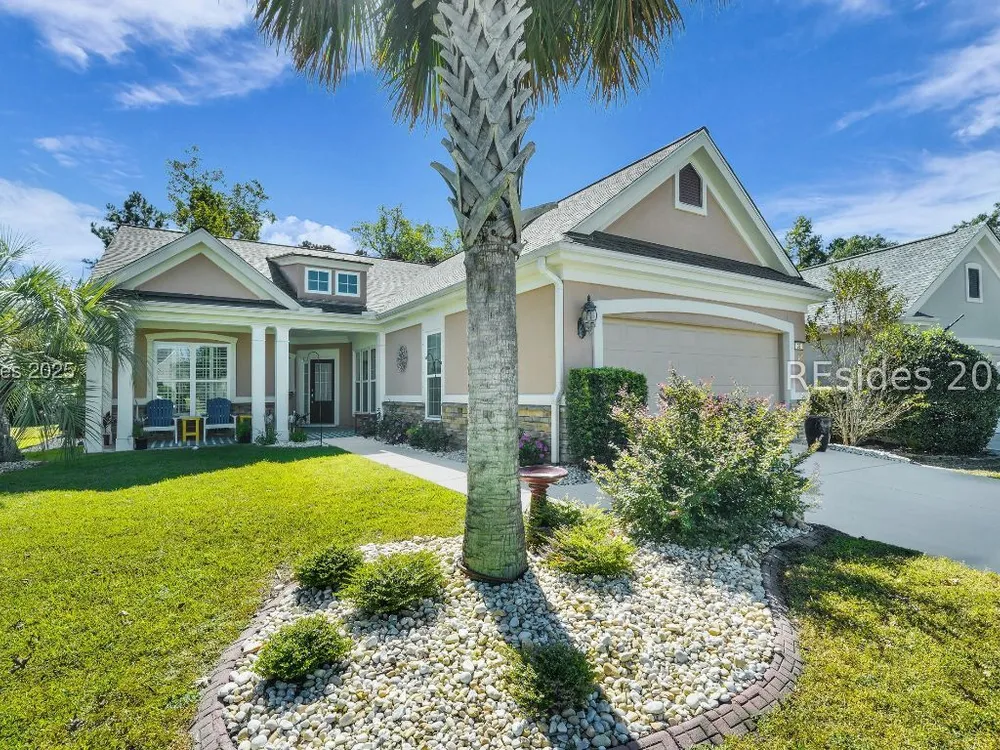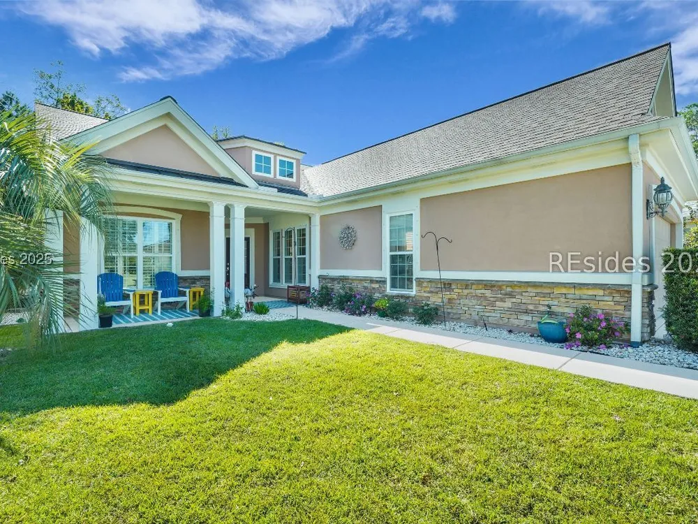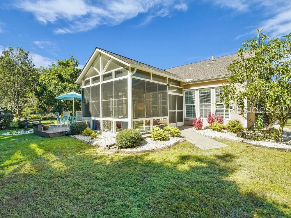 Live your best life in the premier Active Adult 55+ Lowcountry community at 36 Reedy Place in Sun City Hilton Head South! This beautifully maintained Surrey Crest model that sits on a quiet street near the Rear Bull Hill Gate, offering a private wooded view and convenient access to Hwy 170. The home features 2 bedrooms + den and 2 full baths, designed for comfortable Lowcountry living. The spacious kitchen boasts a large island, abundant cabinetry with pull-outs, and an eat-in breakfast nook area. A bright great room flows into the Carolina Room and out to a lovely covered and enclosed 3 Season Lanai with an extended paver patio perfect for relaxing or entertaining.The primary suite offers a generous walk-in closet with custom shelving and a renovated bath with dual sinks, a large tiled zero entry shower, and water closet. Additional highlights include plantation shutters, custom wood valances, laundry area with office station, and an extended garage with built-in storage. Recent updates include a new roof (2020) and new & newer stainless-steel appliances-refigerator, stove, microwave, washer, and dryer. A wonderful combination of comfort, quality, and privacy in one of Sun City's most desirable locations.