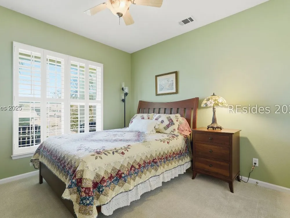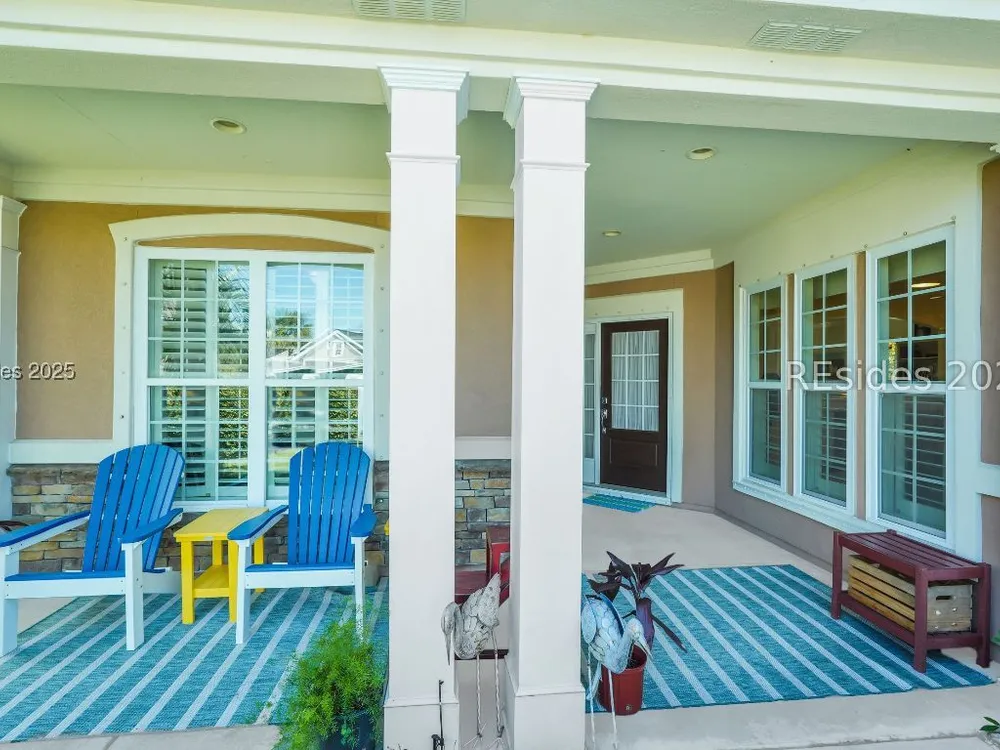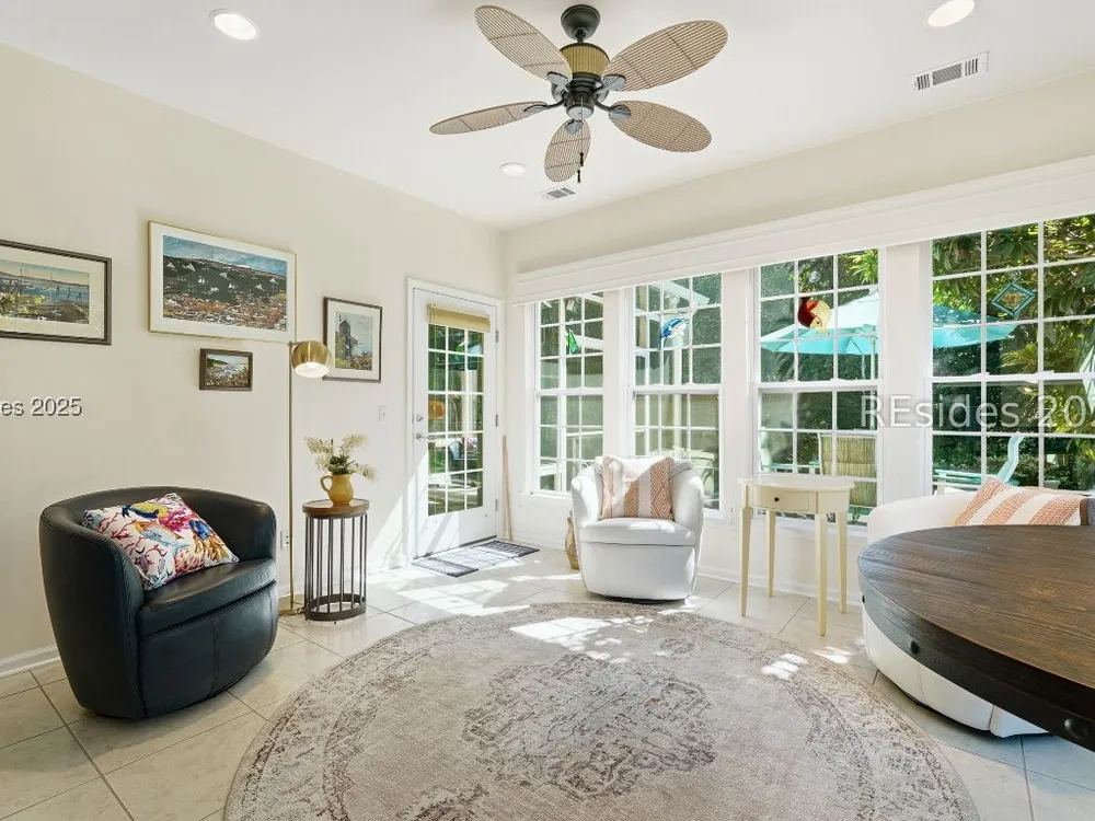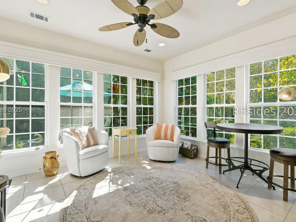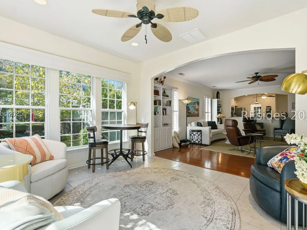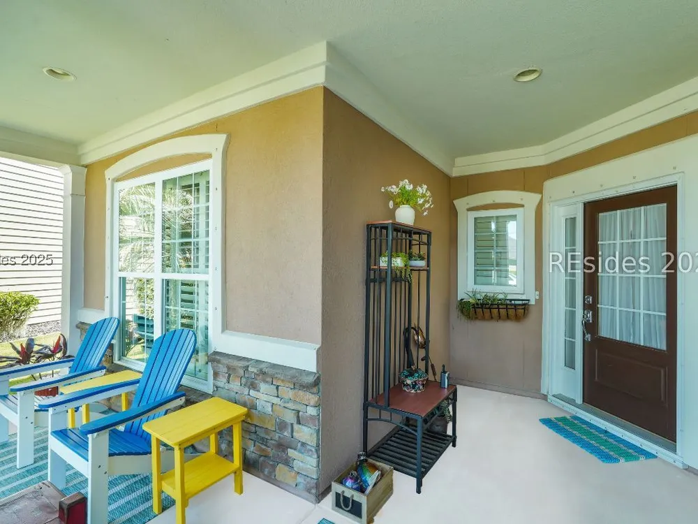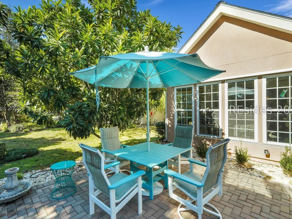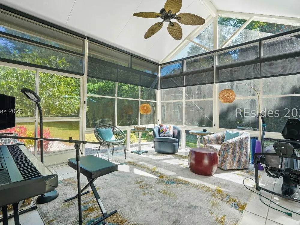 Live your best life in the premier Active Adult 55+ Lowcountry community at 36 Reedy Place in Sun City Hilton Head South! This beautifully maintained Surrey Crest model that sits on a quiet street near the Rear Bull Hill Gate, offering a private wooded view and convenient access to Hwy 170. The home features 2 bedrooms + den and 2 full baths, designed for comfortable Lowcountry living. The spacious kitchen boasts a large island, abundant cabinetry with pull-outs, and an eat-in breakfast nook area. A bright great room flows into the Carolina Room and out to a lovely covered and enclosed 3 Season Lanai with an extended paver patio perfect for relaxing or entertaining.The primary suite offers a generous walk-in closet with custom shelving and a renovated bath with dual sinks, a large tiled zero entry shower, and water closet. Additional highlights include plantation shutters, custom wood valances, laundry area with office station, and an extended garage with built-in storage. Recent updates include a new roof (2020) and new & newer stainless-steel appliances-refigerator, stove, microwave, washer, and dryer. A wonderful combination of comfort, quality, and privacy in one of Sun City's most desirable locations.