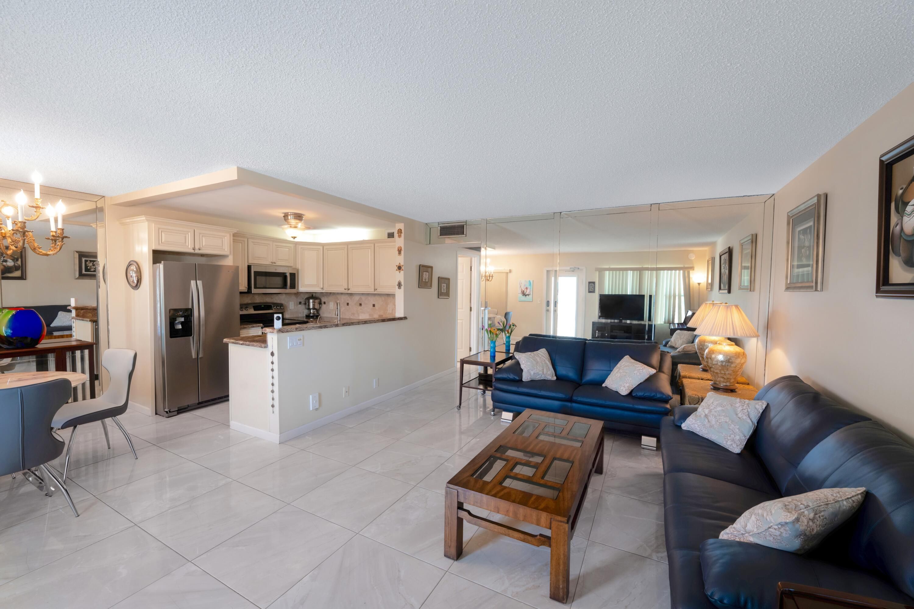 Welcome to resort style living with this Beautiful turnkey 2BR/2BA condo in Grantham E, a friendly 55+ community in Century Village. The kitchen boasts granite counters, tile backsplash, and stainless appliances that flow into the dining and living areas. Both bathrooms feature granite vanities and step-in showers.(water incl) Spacious bedrooms offer great storage, and the enclosed Florida room featuring a custom california closet for added storage space overlooks peaceful gardens. Tile flooring throughout, impact front door, and roll-down shutters add convenience and peace of mind. Steps from the elevator, laundry, and storage. Century Village provides 24-hour security plus pools, clubhouse, theater, fitness center, tennis, pickleball, and more—minutes from shopping, dining, & the beach!
