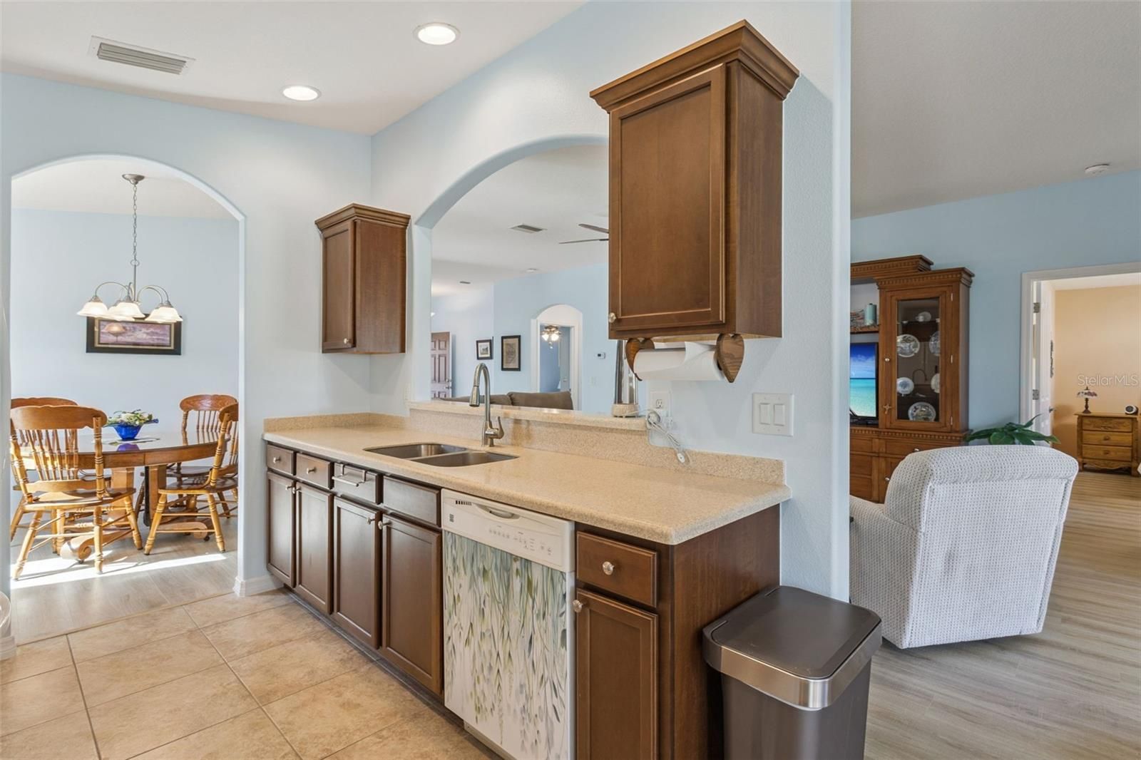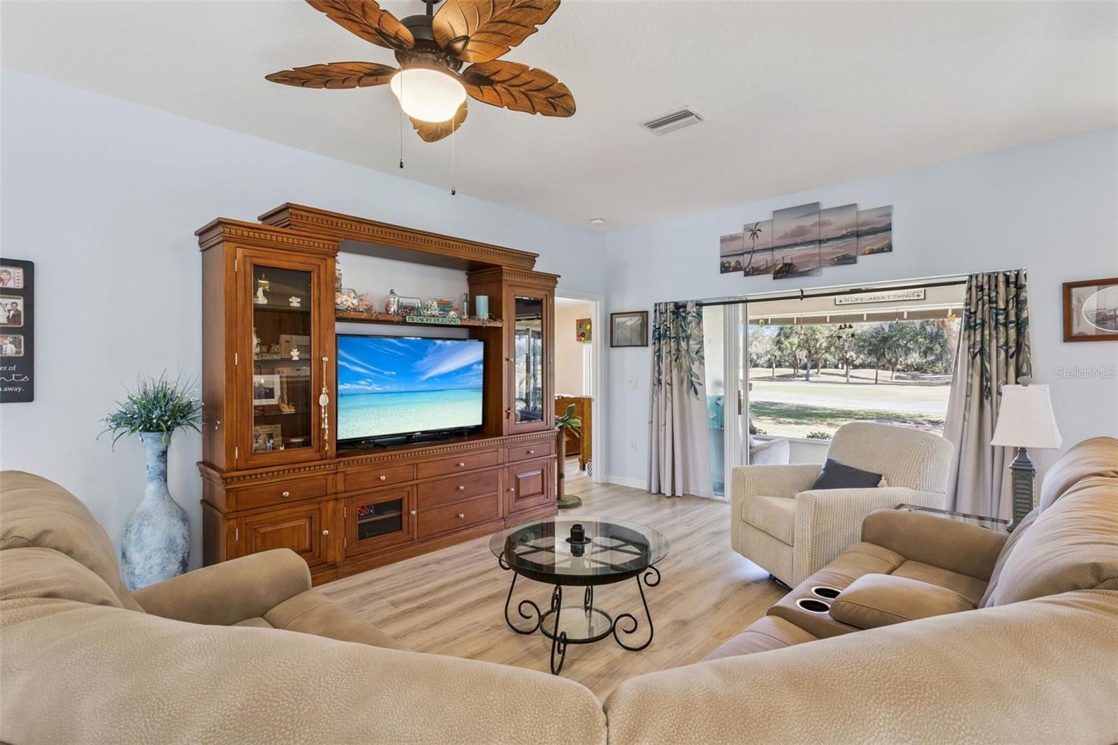 One or more photo(s) has been virtually staged. Welcome to this beautifully maintained Dogwood Builder Model, ideally situated on the golf course in one of Central Florida’s most sought-after 55+ communities! This spacious three-bedroom, two-bathroom home offers a split floor plan and is surrounded by lush, manicured landscaping. Enjoy Anderson Replacement Windows throughout, fresh interior paint, and sliders that open to a bright Florida Room—perfect for unwinding or entertaining. The versatile third bedroom is currently used as a crafting room, adding flexibility to your living space. The heart of the home is the chef's kitchen, featuring white appliances, a pantry, Corian countertops, wood cabinets with convenient pull-outs, and a charming dinette nook that overlooks the picturesque surroundings. For dining, you’ll love having both casual and formal eating areas to suit any occasion. Laminate flooring flows seamlessly throughout the residence, combining easy maintenance with elegant style. Additional highlights include a garage with a utility sink, new smart door opener, pull-down attic stairs for extra storage, and a sliding screen garage door. The guest suite features a tub/shower combination, while the primary suite boasts a spacious walk-in closet, dual vanities, a private commode, and a tiled shower for a true retreat experience. There is no bond on this home! Enjoy resort-style amenities right outside your door—this vibrant community offers a movie theater, Grand Hall, full-service restaurant and pub, zero-entry pool, hot tub, state-of-the-art fitness center, and sidewalk-lined streets perfect for evening strolls. Conveniently located near Village Squares, MCO, Disney, world-class medical facilities, and shopping. Experience the best of Central Florida retirement living in this exceptional home. Schedule your private tour today and see all the wonderful features for yourself!