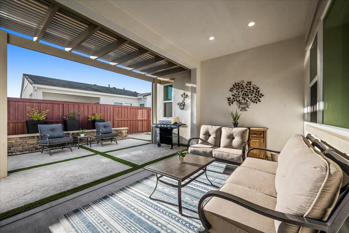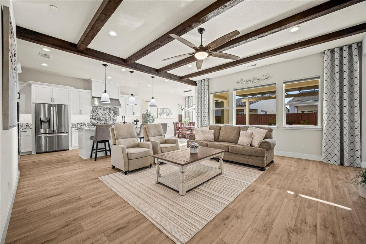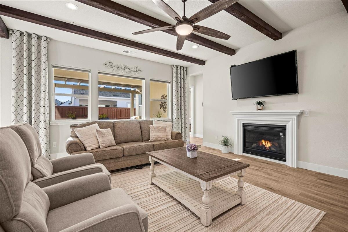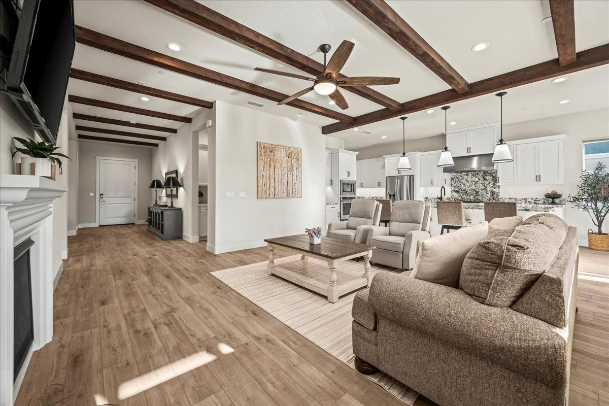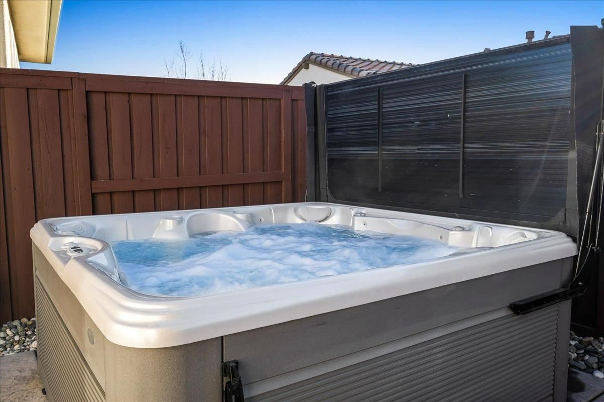 Welcome to refined living in this luxury single-story home located within Folsom's premier 55+ active adult community. Thoughtfully designed with 2 bedrooms plus a versatile flex room, 3 baths, and 2,148 square feet of beautifully finished living space, this residence offers the perfect blend of comfort, elegance, and ease. The flex room is ideal for a home office, hobby space, or guest retreat, adapting effortlessly to your lifestyle. Luxury vinyl plank flooring flows seamlessly throughout the home, complemented by custom faux wood ceiling beams that add warmth and architectural character. The chef's kitchen serves as the heart of the home, showcasing expansive granite countertops, stainless steel appliances, abundant cabinetry, and a spacious walk-in pantryperfect for both entertaining and everyday living. The open, airy layout creates a welcoming atmosphere filled with natural light and timeless finishes. Over $150,000 in premium upgrades elevate this home well beyond standard offerings, while owned solar provides energy efficiency and long-term savings. Step outside to a beautifully landscaped backyard designed for relaxation and privacy, complete with your own personal hot tuban ideal space to unwind, entertain, or enjoy peaceful evenings year-round. The location is equally impressive, just moments from the community's resort-style amenities. Residents enjoy access to a stunning clubhouse featuring indoor and outdoor pools, a soothing spa, fitness center, and a vibrant social calendar with weekly events. Outdoor amenities include pickleball courts, bocce ball, cornhole, inviting firepits, and multiple gathering areas that foster connection and an active lifestyle. This exceptional Folsom home delivers luxury, low-maintenance living, and a true sense of community - an outstanding opportunity to enjoy the very best of active adult living.