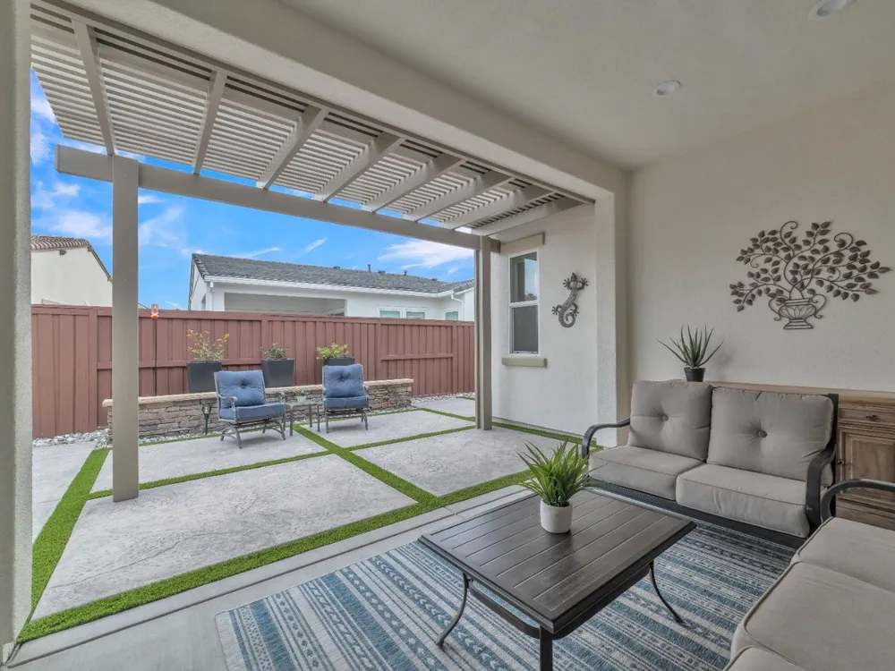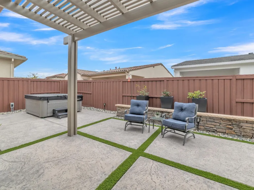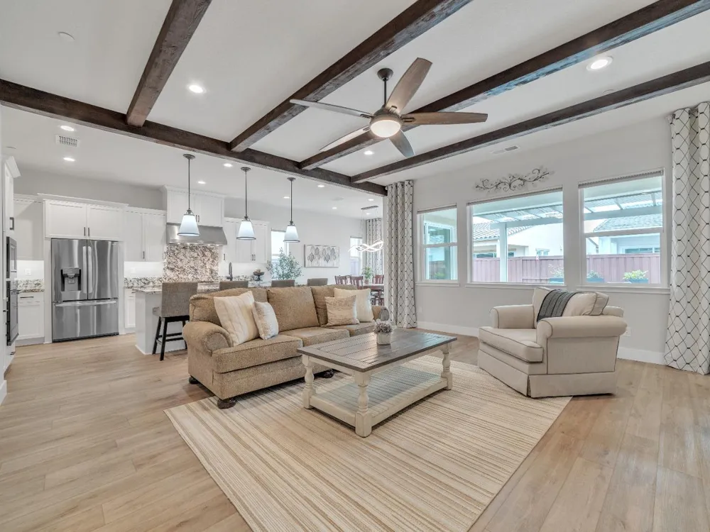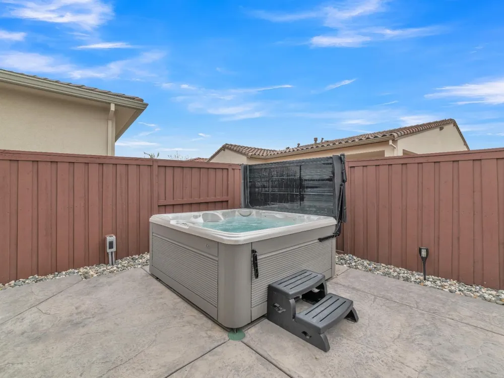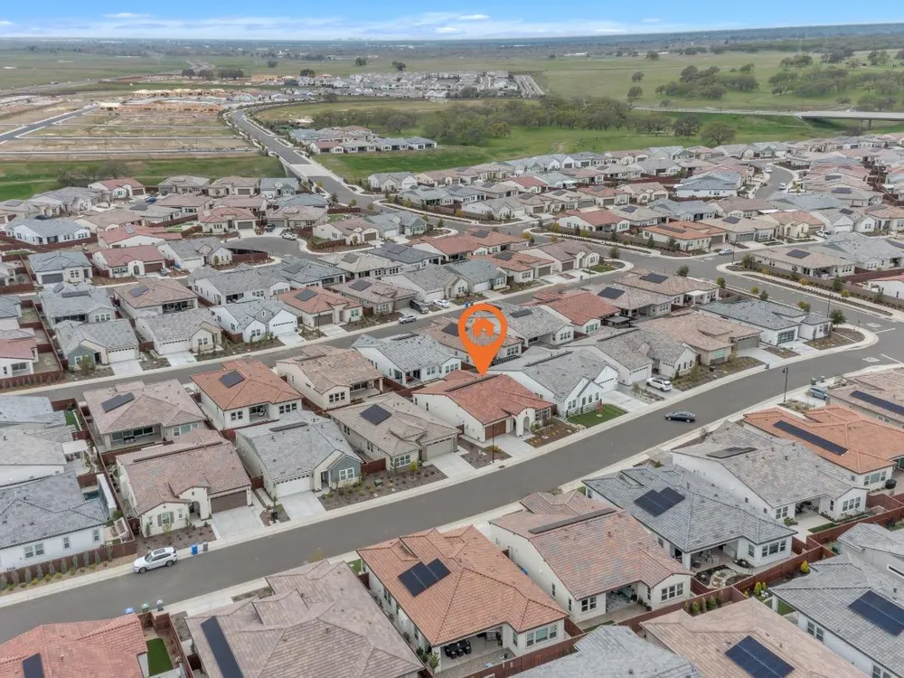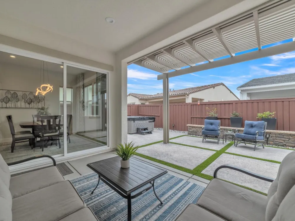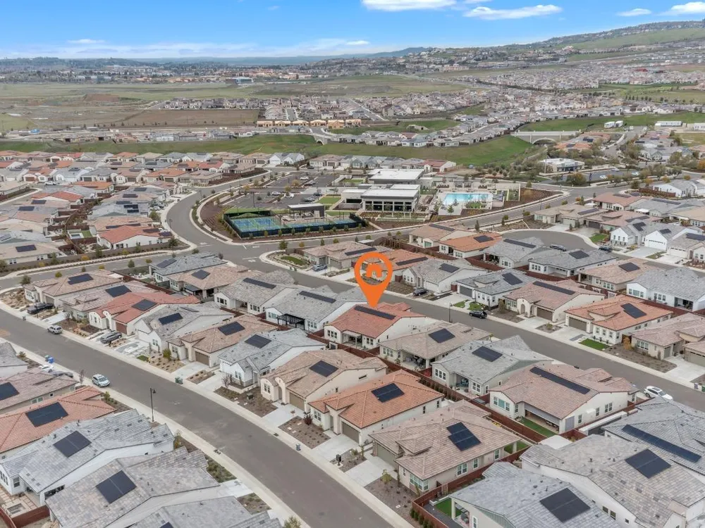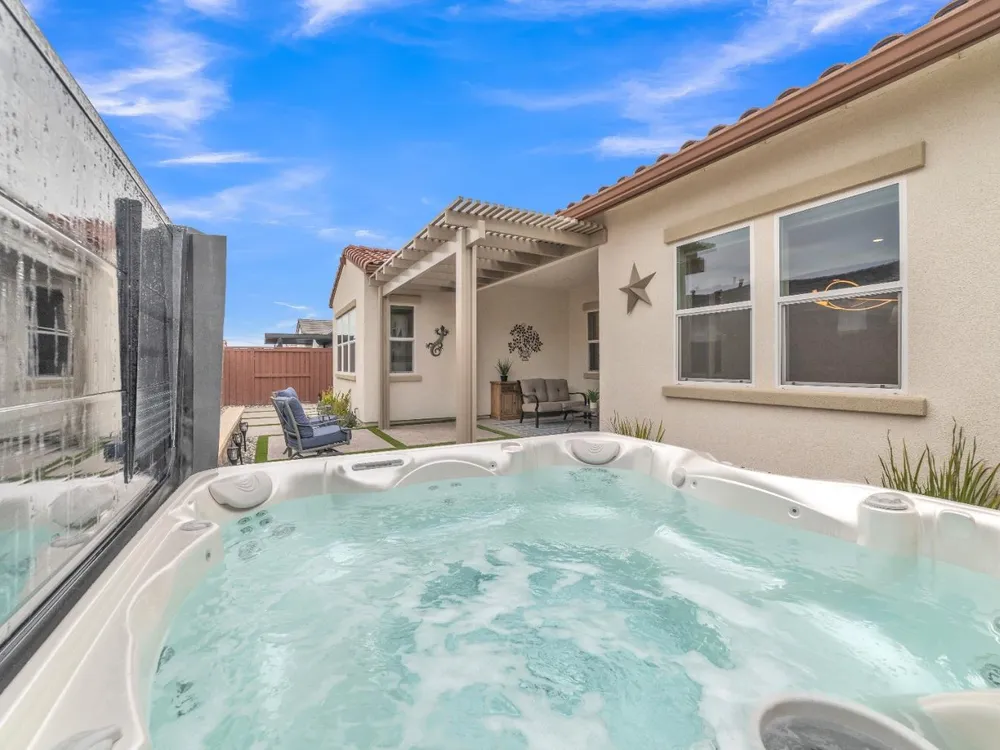 Welcome to luxury living in the highly desired 55+ community of Regency at Folsom Ranch by Toll Brotherswhere resort-style amenities meet elevated design. Located just walking distance to the clubhouse, this single-story stunner stands out with over $150K in premium upgrades, owned solar, and a layout designed for comfort and style. Step inside to wide-plank luxury vinyl plank flooring throughout and custom faux wood ceiling beams that add warmth to the expansive open-concept design. The chef's kitchen features a mix of KitchenAid and upgraded Jennair appliances, striking modern pendant lights, granite countertops, and a spacious walk-in pantrycrafted for both function and beauty. The great room flows seamlessly into a low-maintenance backyard featuring a custom patio cover and private hot tubperfect for morning coffee or unwinding at night. The primary suite is your sanctuary, with a fully upgraded bath that includes an oversized shower, dual vanities, granite counters, and a generous walk-in closet. Every detail has been thoughtfully curatedfrom energy efficiency with owned solar to timeless designer finishes throughout. While other homes may share the same layout, none match the style, quality, or location of this one.