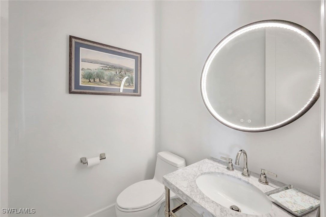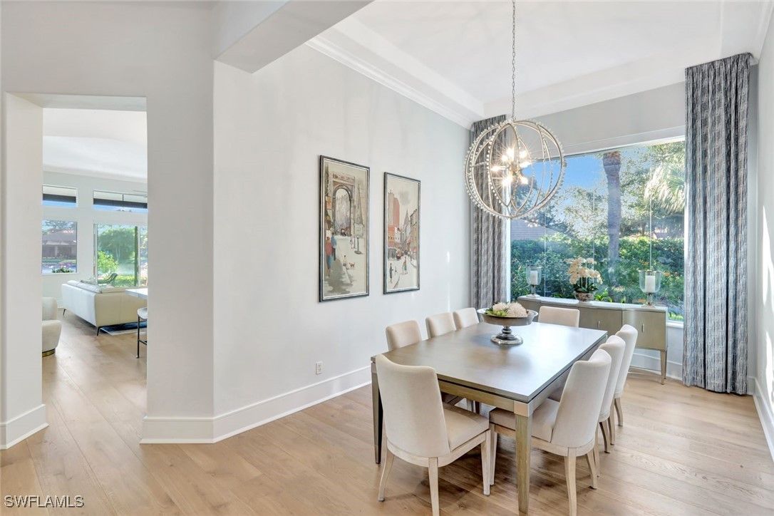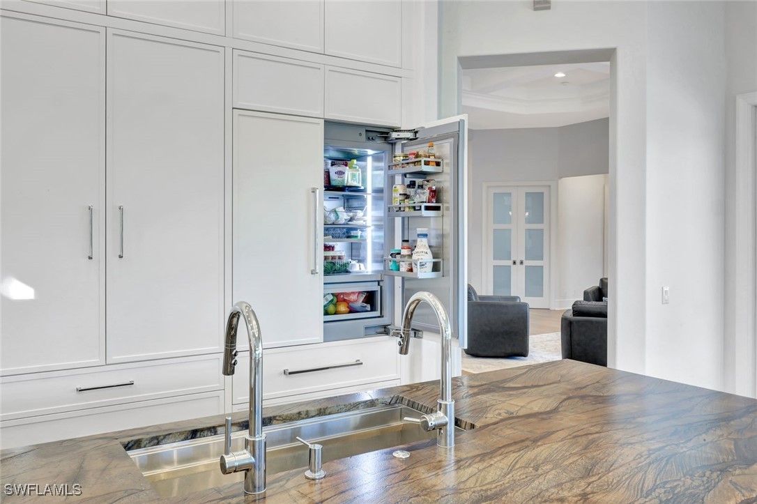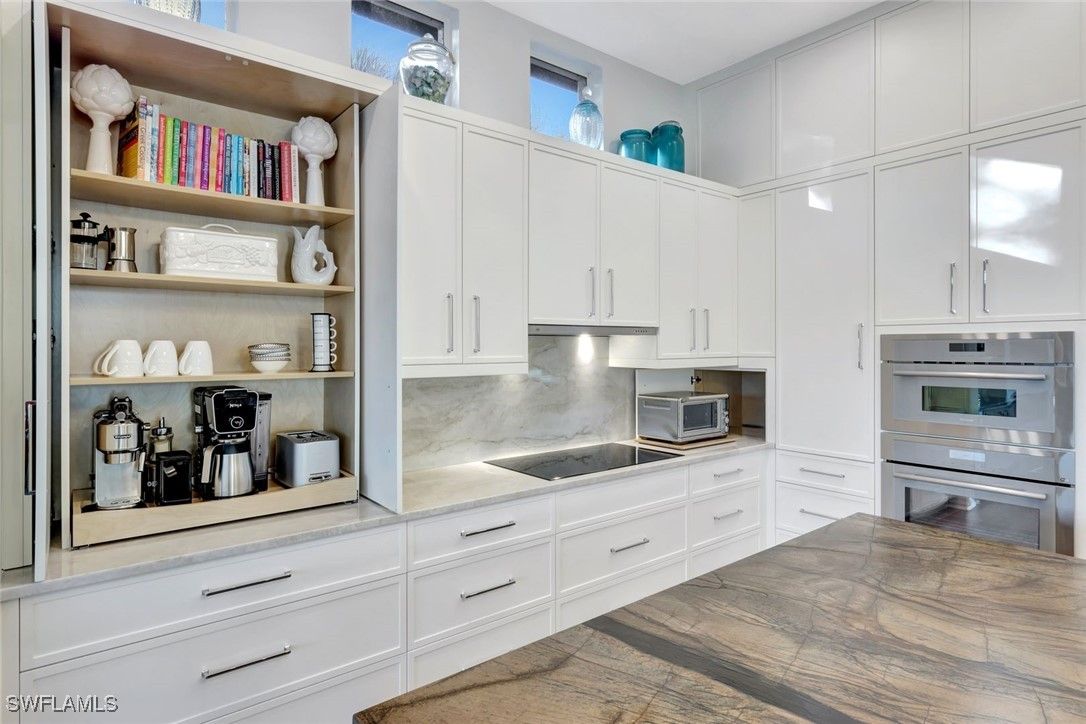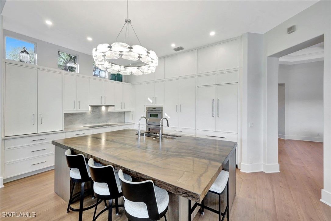 Welcome to completely REIMAGINED residence fully renovated in 2024, ideally located in the heart of Pelican Landing. Offering southern exposure, lake views, and indoor-outdoor living, this home is designed for lock-and-go ease. Upon entry, expansive sliding glass doors span the entire back of the residence, inviting natural light and showcasing your beautiful lake views. The open-concept kitchen and great room were planned so the view stays with you—whether cooking, dining, relaxing, or hosting. The chef’s kitchen is the centerpiece, anchored by a substantial center island with storage beneath. Custom Willow House cabinetry extends to the ceiling and includes a built-in coffee bar, rollout drawers, and a spacious pantry. Premium appliances include a Thermador built-in refrigerator, induction cooktop, and double ovens. Taj Mahal granite with a leathered finish completes the counters. In the great room, a linear electric fireplace pairs with custom wood-grain cabinetry and illuminated glass shelving, creating a focal wall. The bar area features quartz countertops, an ice maker, wine refrigerator, and beverage refrigerator. Automatic electric shades enhance both the great room and dining area. The primary suite bath is a spa-inspired retreat with oversized porcelain tile, a fully tiled walk-in shower to the ceiling with rain head and custom fixtures, a frosted-glass panel, and a freestanding soaking tub. Two separate vanities offer rollouts, Taj Mahal countertops, lighted mirrors, and signature hardware. A renovated coastal pool bath features tile to the ceiling, floating vanity, soft lighting, and a lighted mirror. The guest bath includes an oversized shower and floating vanity, while the powder room offers a polished nickel console sink, mosaic marble floor, and lighted mirror. The laundry room includes a separate entry, quartz countertops, sink and cabinets. Step outside to your private resort oasis.The pool was refinished in 2025 with a sun shelf, ceramic glass tile, and a Pebble finish, surrounded by a marble-tiled pool deck. Lanai screening opens views, and the covered outdoor living and dining area features a summer kitchen with built-in Blaze gas grill, two gas side burners ,and generous counter space-perfect for year-round entertaining and enjoying abundant bird and sanctuary life. Additional highlights include a 24kW whole-house Generac generator served by a 1,000-gallon propane tank, whole-house water filtration, new gutters (2023), and a new tile roof (2023). All electrical and plumbing were replaced during the renovation. Enjoy smart-home lighting, thermostat control, a central alarm system, outdoor up-lighting, electric hurricane protection on the sliding doors and heated and air conditioned garage. Circular drive, side drive, and a three-car garage complete this exceptional offering. Just a short walk or bike ride to the community center, tennis, plus Pelican Landing’s beach shuttle and 2 world class golf courses.