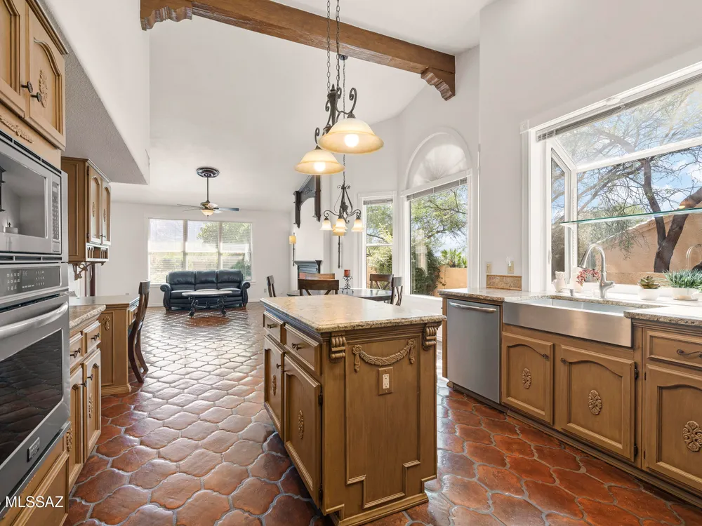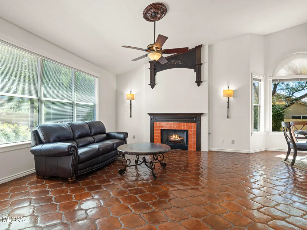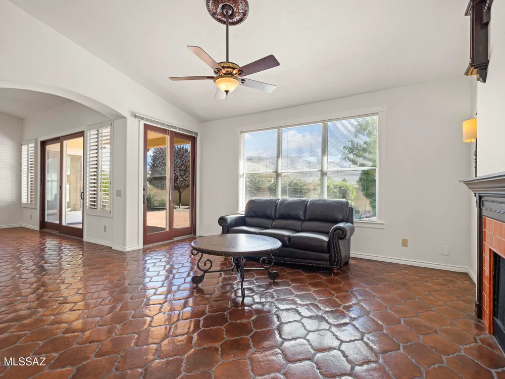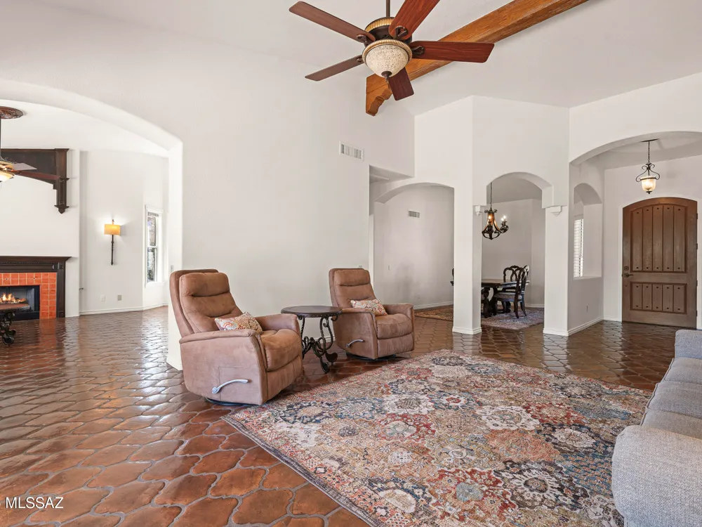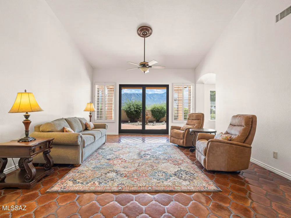 Welcome to your dream home. Freshly painted inside and new roof underlayment and HVAC system installed in 2023. Unobstructed mountain views from this highly upgraded and remodeled Spanish style home. Home features San Felipe Satillo tile throughout living areas and wood beam accents. This home is perfect for entertaining -kitchen opens to the dining nook and family room. Kitchen has remarkable lofty ceilings with recessed lights and leathered granite countertops and tumbled travertine backsplashes. The chef in the family will enjoy the 5 burner gas cooktop and stainless steel appliances. The family room boasts a beautifully crafted fireplace with a rich wood mantle. The nearby living room serves as the heart of the home and offers easy access to other key living areas through its archways