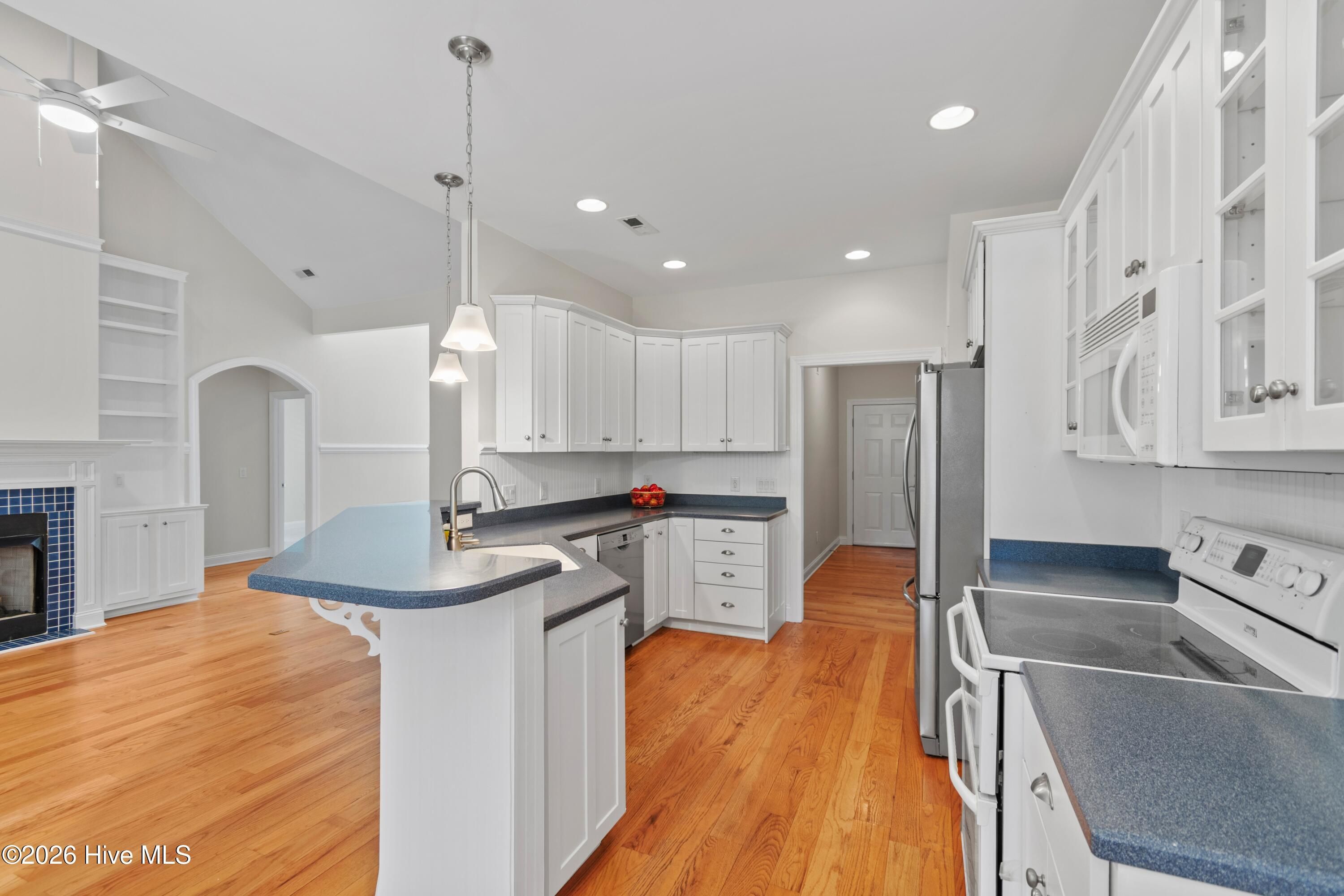 - Master Downstairs, Walk-in Closet(s), Vaulted Ceiling(s), High Ceilings, Solid Surface, Bookcases, Kitchen Island, Ceiling Fan(s), Pantry, Walk-in Shower