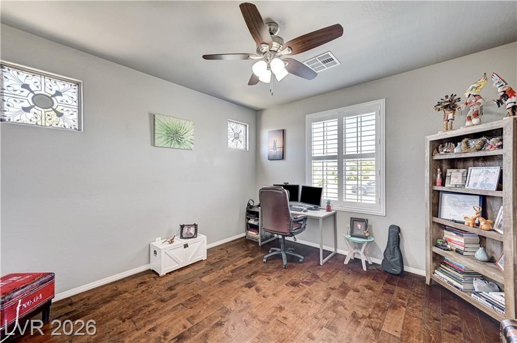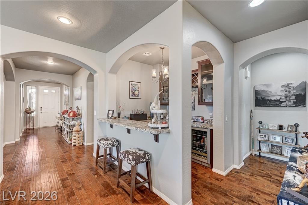 Welcome to this stunning and highly upgraded single-story home nestled on a beautifully landscaped corner lot in a vibrant 55+ active community.When you enter you'll notice the warmth of rich wood floors flowing throughout the living spaces creating an inviting and elegant atmosphere.The kitchen features sleek granite countertops perfect for entertaining or enjoying everyday meals.The wet bar area includes both wine and beverage refrigerators ideal for hosting guests or relaxing in style.The home also boasts custom built-ins in the laundry room that doubles as an office, and a spacious primary closet, offering organization and luxury. The meticulously maintained yard designed for both beauty and low maintenance. Located in a resort-style community that offers exceptional amenities, including two sparkling pools, a clubhouse, fitness center, pool tables, pickleball courts, walking paths, and a full calendar of community activities.