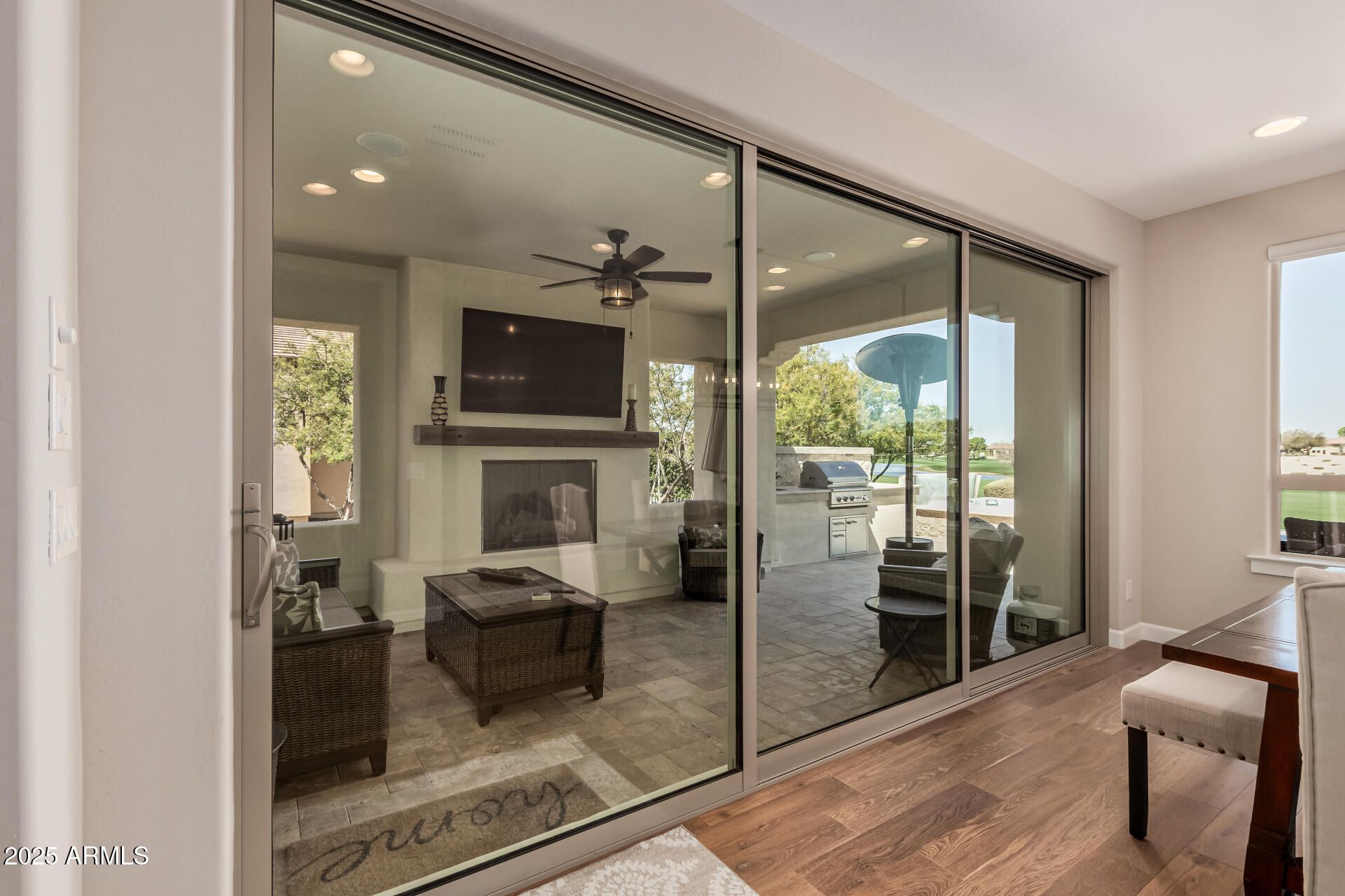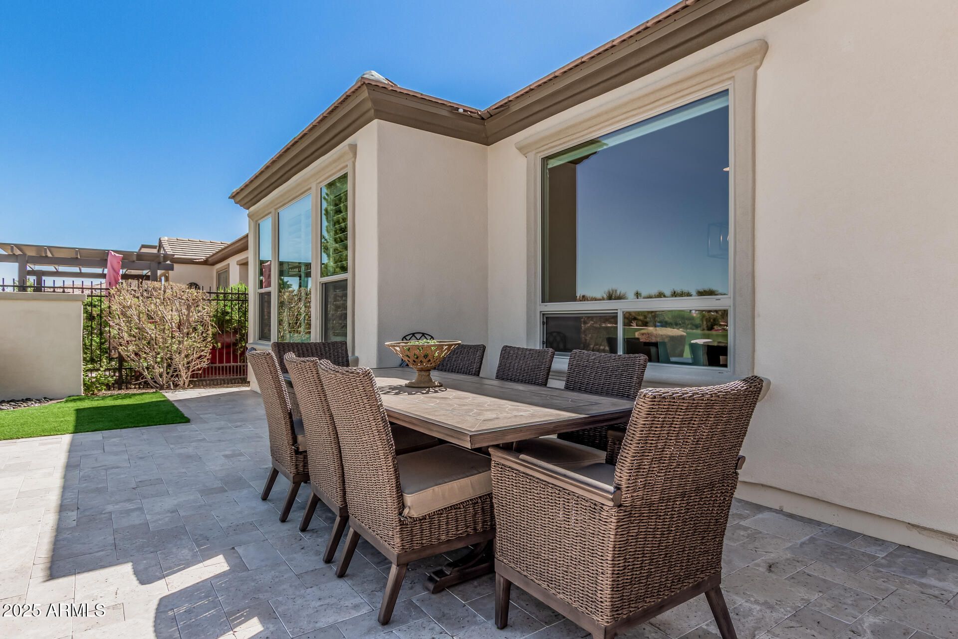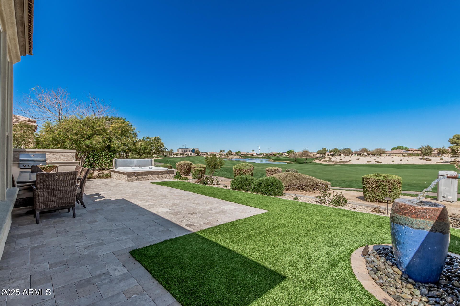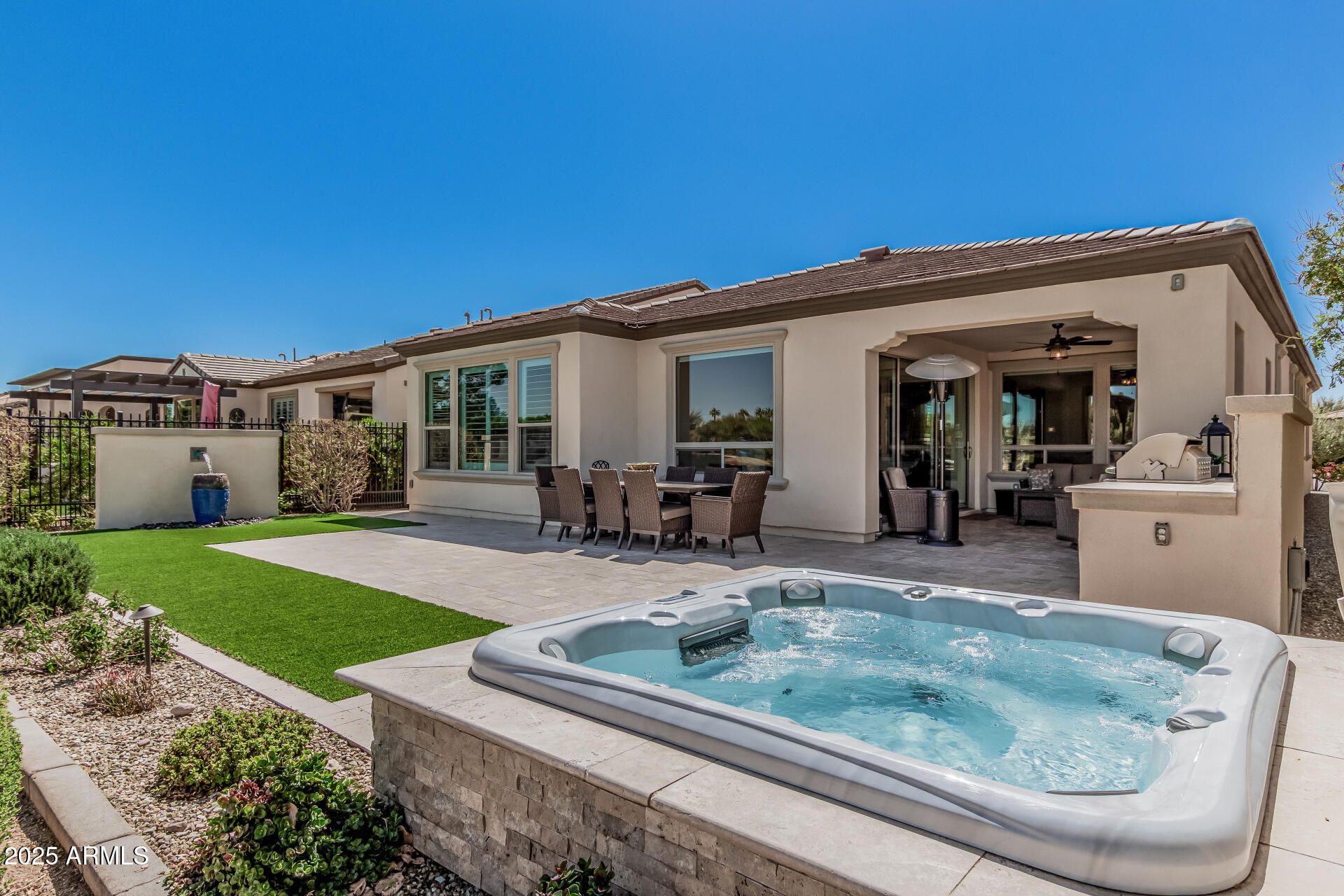 Stunning premium golf course lot home in Encanterra. Nestled in the prestigious resort-style community of Encanterra, this gorgeous home sits on a prime golf course lot, offering an unparalleled lifestyle, breathtaking views. Inside, experience open-concept luxury living with a massive island, a spacious dining area, and a great room. A versatile den can serve as an additional dining room or office. Step outside to the entertainer's dream backyard, featuring a covered patio, gas fireplace, beautiful fountain, relaxing hot tub-all with breathtaking golf course views. The split floor plan ensures privacy, while elegant details like plantation shutters and hardwood floors offer a custom touch throughout. Two-car garage provides ample storage, complete with epoxy flooring and built-in garage cabinets for optimal organization. This home is filled with thoughtful details, come see it for yourself!