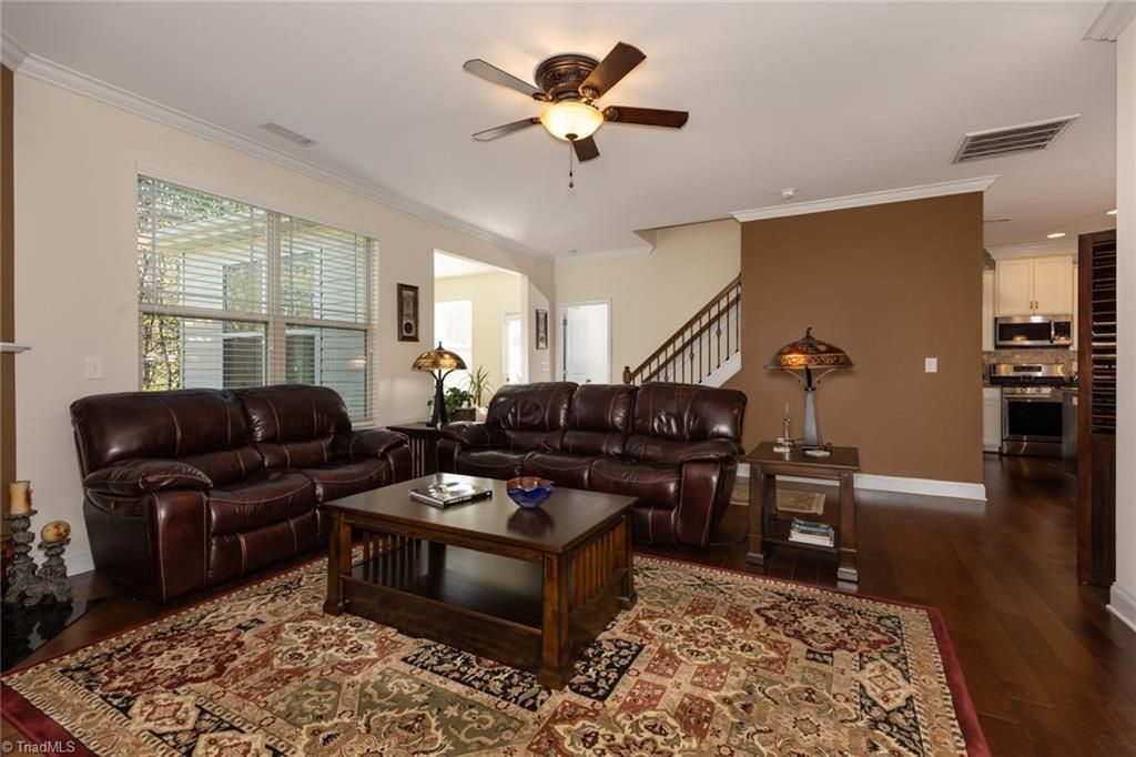 Enjoy refined, low-maintenance living in this beautifully finished 3BR/3BA townhome that backs up to the Bicentennial Greenway. The inviting covered front porch opens to an elegant, light-filled interior with rich hardwood floors, crown molding, and an open concept layout perfect for entertaining. The chef’s kitchen features granite countertops, gas range, stainless appliances, tile backsplash, and a large island overlooking the living room with a gas log fireplace. A sunny flex/sunroom frames private wooded views and leads to the fenced back patio — an ideal spot for morning coffee or evening grilling. Main-level primary suite offers a spacious en suite bath and walk-in closet. Upstairs you’ll find a generous bonus/guest space plus a large walk-in storage room for easy access. Mudroom/laundry off the 2-car garage. Residents enjoy private neighborhood access to miles of paved trails, with shopping, dining, and everyday conveniences just minutes away.
