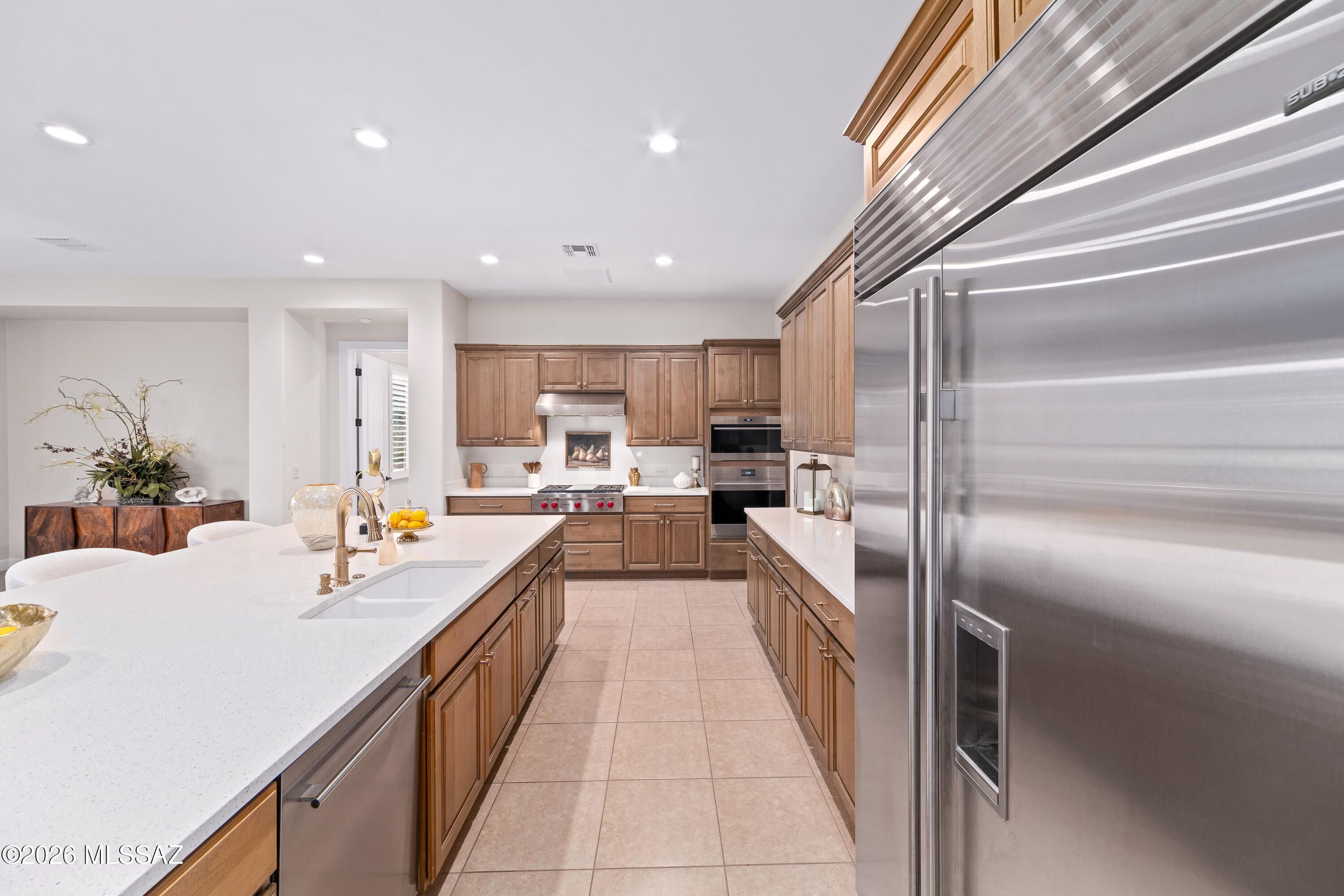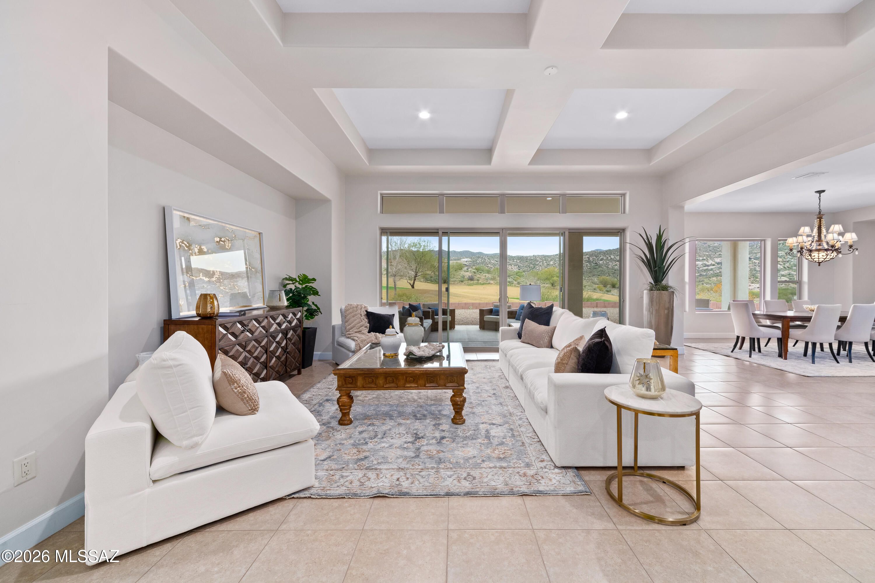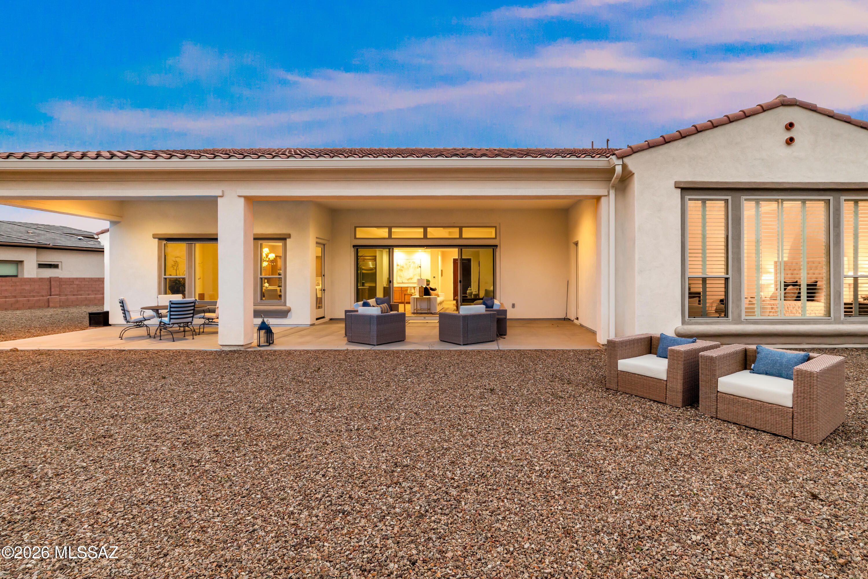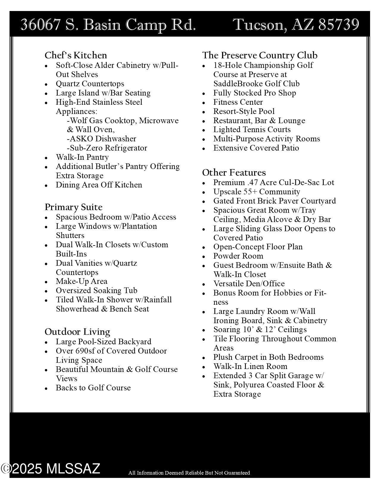 Discover the ultimate blend of elegance, comfort, and breathtaking views in this 3,484sf 2BR/2BA Sonrisa model w/den & bonus room, perfectly situated on a premium .47-acre cul-de-sac pool-sized lot in The Preserve at SaddleBrooke. Built in 2021, this one-story stunner offers sweeping golf course and mountain vistas, a gated front courtyard, features timeless Travertine stone, adding a touch of elegance and sophistication to the home's entrance. Step inside to a grand open-concept floor plan with soaring 10' and 12' ceilings, tile flooring throughout. The spacious Great Room features a tray ceiling, media alcove, walk-up dry bar, and a large sliding glass door that opens to over 690sf of covered outdoor living space, perfect for entertaining or relaxing with a view. The chef's kitchen is