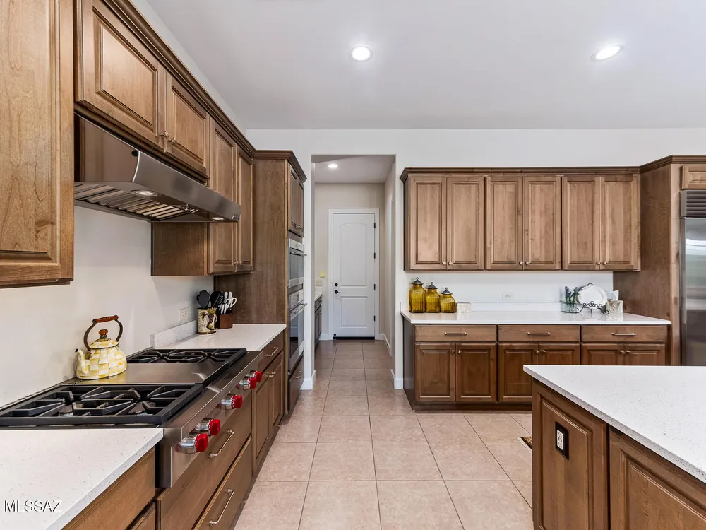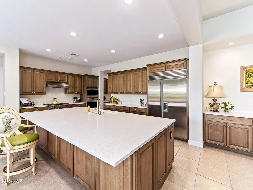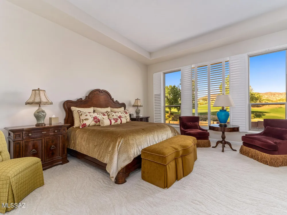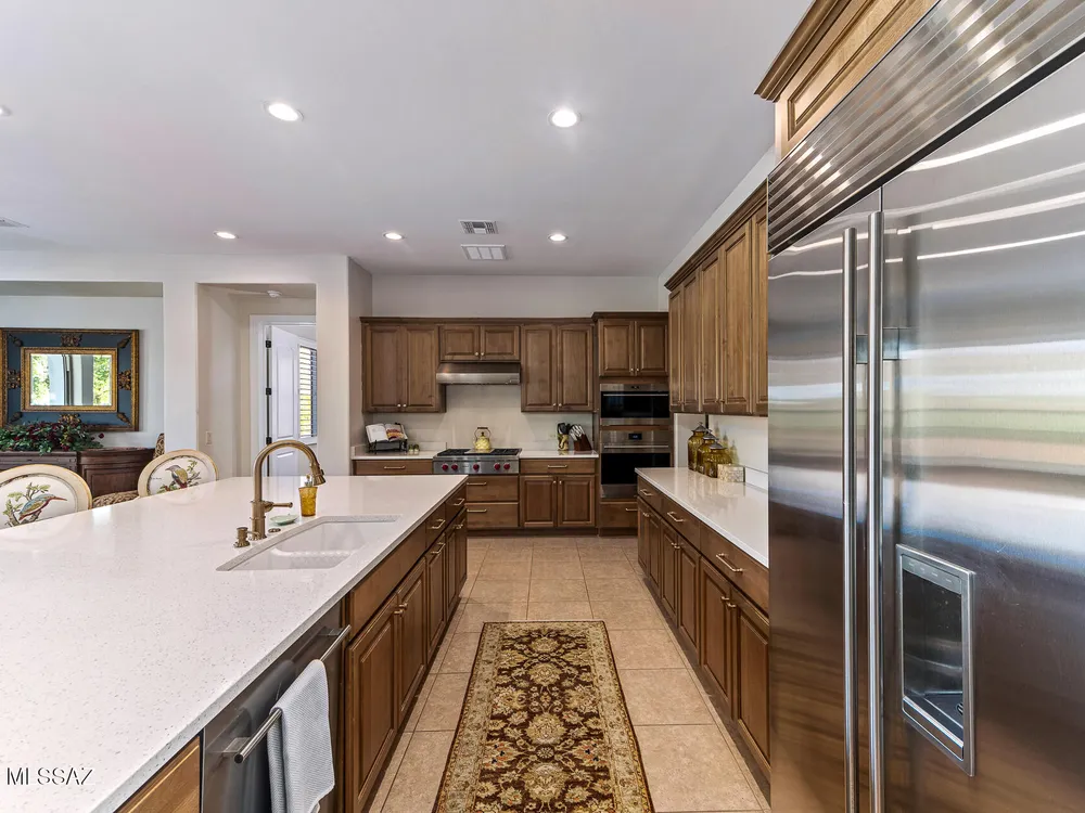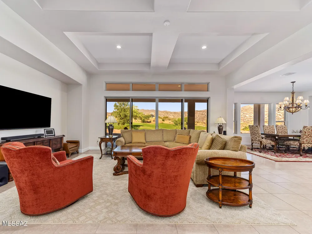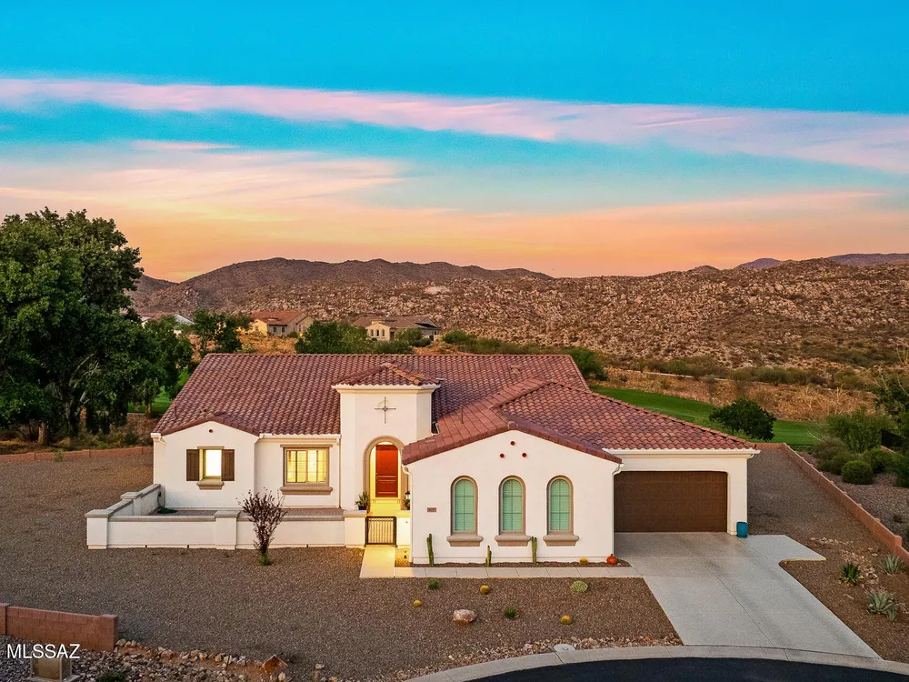 Discover the ultimate blend of elegance, comfort, and breathtaking views in this 3,484sf 2BR/2BA Sonrisa model w/den & bonus room, perfectly situated on a premium .47-acre cul-de-sac pool-sized lot in The Preserve at SaddleBrooke. Built in 2021, this one-story stunner offers sweeping golf course and mountain vistas, a gated front courtyard, features timeless Travertine stone, adding a touch of elegance and sophistication to the home's entrance. Step inside to a grand open-concept floor plan with soaring 10' and 12' ceilings, tile flooring throughout. The spacious Great Room features a tray ceiling, media alcove, walk-up dry bar, and a large sliding glass door that opens to over 690sf of covered outdoor living space, perfect for entertaining or relaxing with a view. The chef's kitchen is