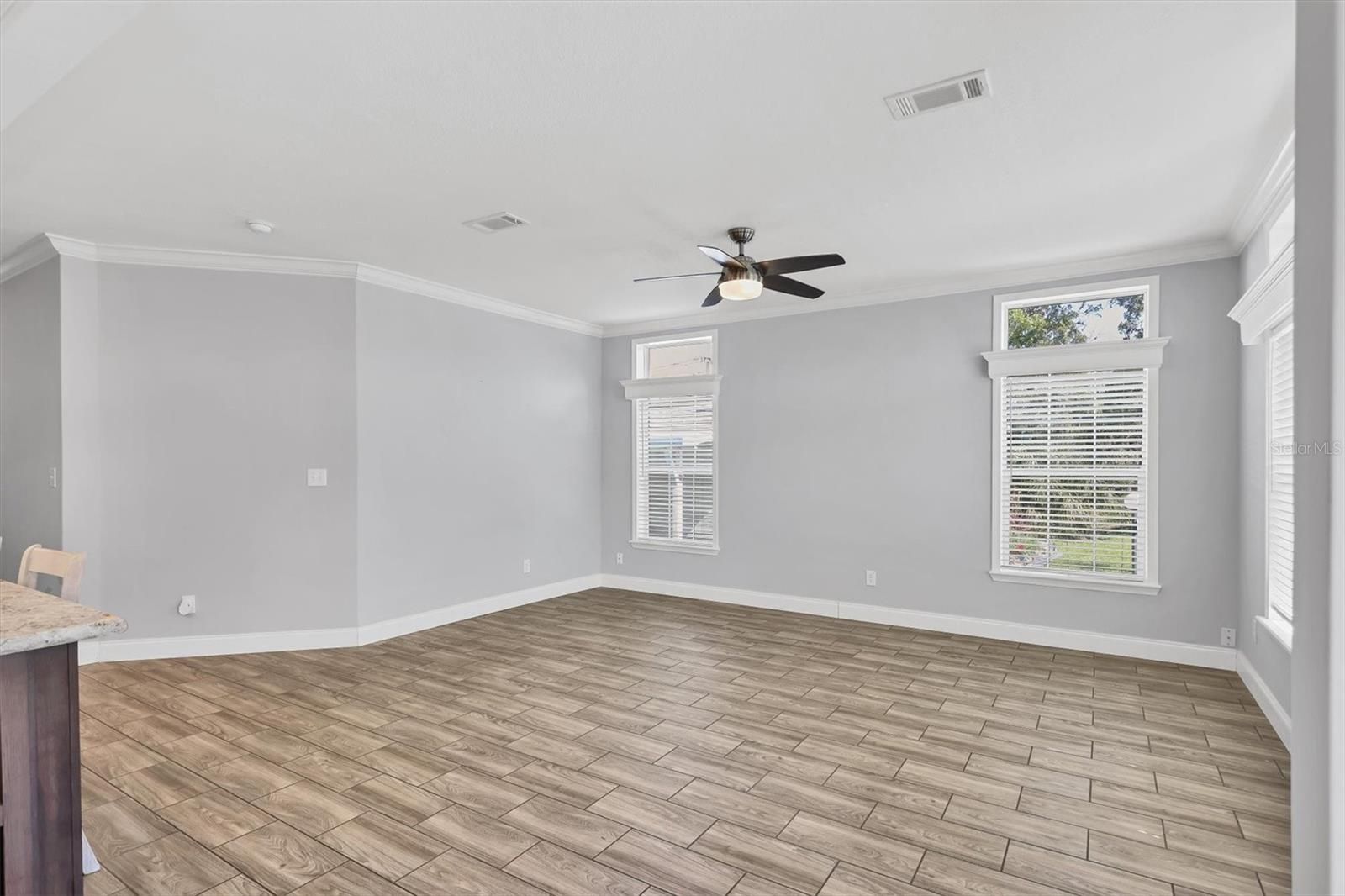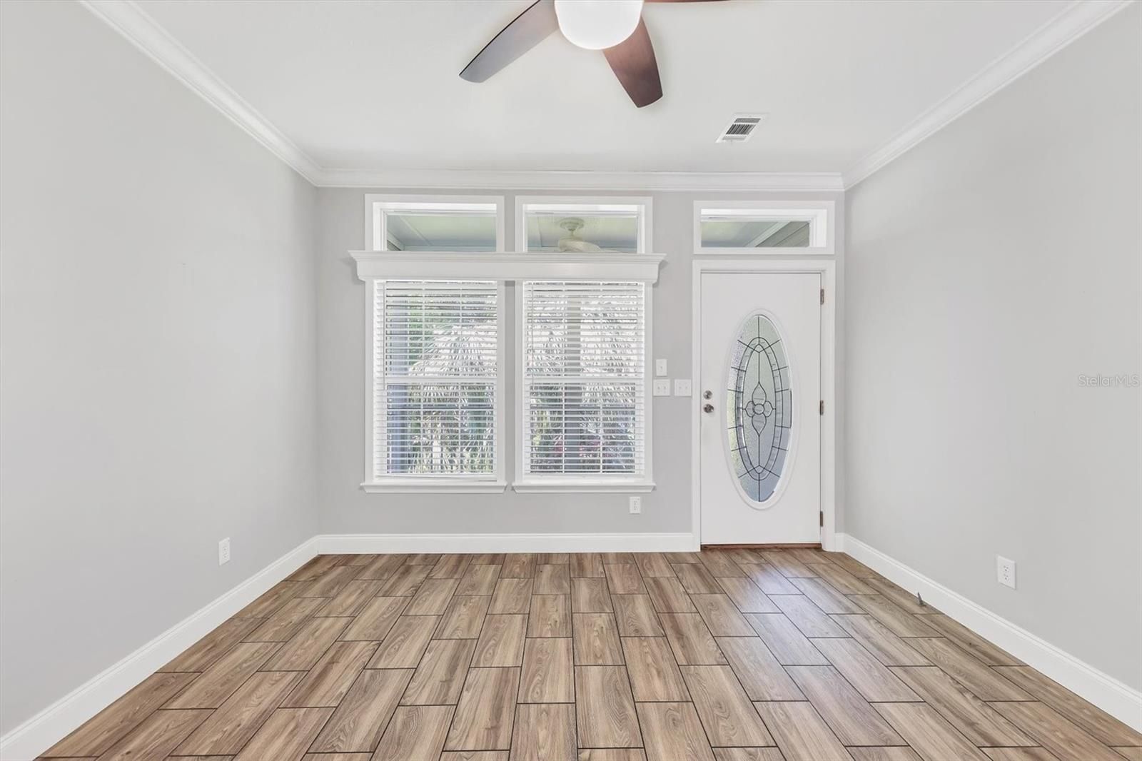 - Built-in Features, Ceiling Fan(s), Crown Molding, Eat-in Kitchen, High Ceilings, Living/Dining Room, Open Floorplan, Main Level Primary, Thermostat, Tray Ceiling(s), Window Treatments