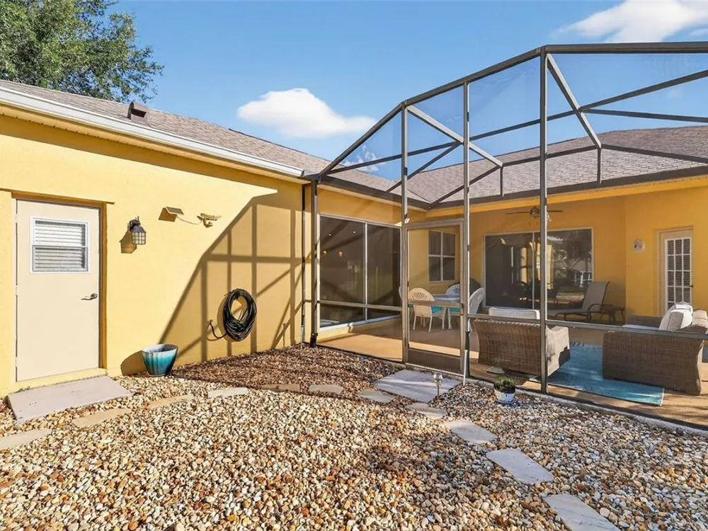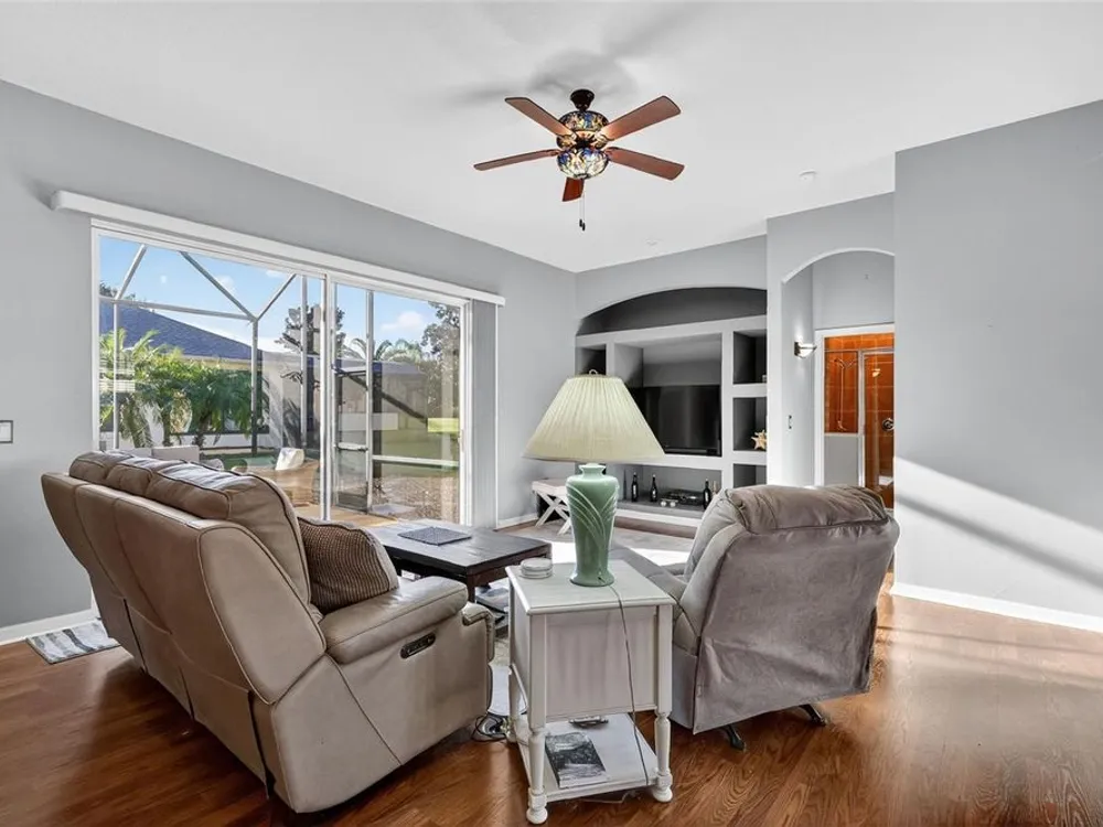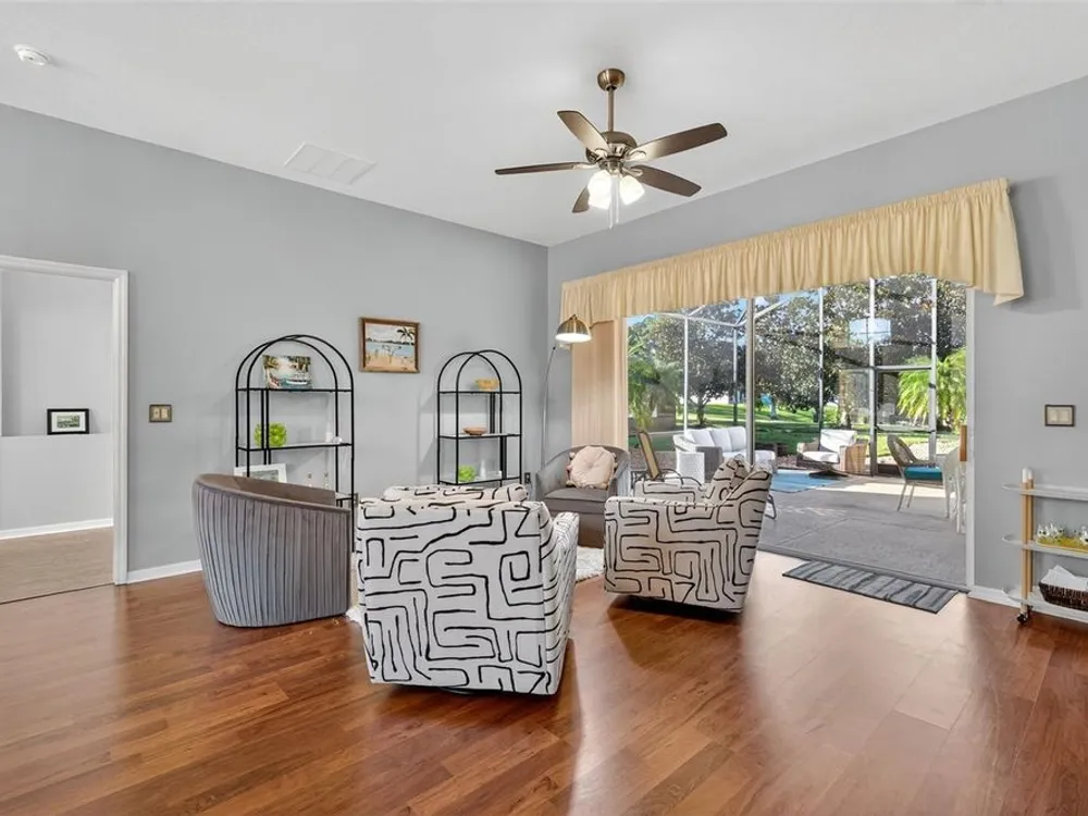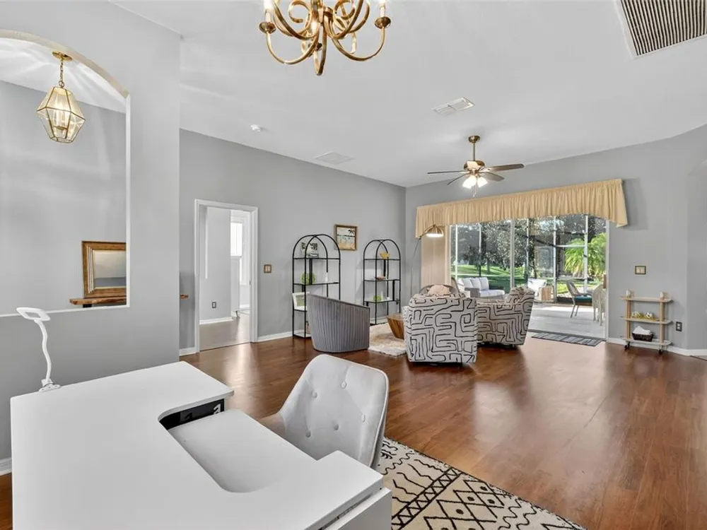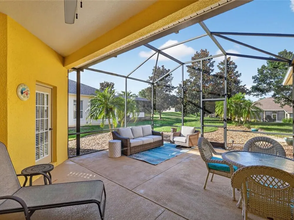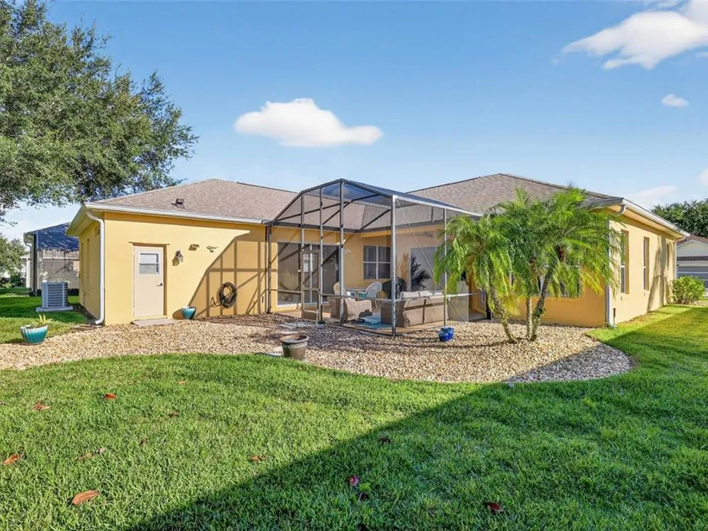 Welcome to this beautifully maintained Bird of Paradise model located in the desirable Ashland Village of Plantation at Leesburg. This spacious 2-bedroom, 2-bathroom home plus private study/den offers an impressive 2,399 square feet of comfortable living space and is being sold TURNKEY (completely furnished with newer furniture), allowing you to move right in and start enjoying the Florida lifestyle. Designed for both elegance and ease, the open floor plan features high ceilings, abundant natural light, and formal living and dining rooms that flow seamlessly into the heart of the home. The kitchen is a true highlight, complete with a window above the sink, extensive counter space, plentiful cabinetry, a large pantry, and upgraded pendant lighting above the breakfast bar. Enjoy the Florida lifestyle year-round from the covered and screened 20x19 lanai, overlooking a serene green space. The sought-after 2-bay plus golf cart garage (25x21) provides ample parking and storage. The primary suite is bright and spacious, offering a walk-in closet and an en suite bath with a double vanity, soaking tub, and large walk-in shower. The guest suite, thoughtfully designed for privacy, features its own full bath with a walk-in shower and upgraded lighting. Throughout the home, you’ll find white plantation shutters and high-quality laminate flooring, no carpet anywhere. Additional highlights include a large indoor laundry room with a utility sink and storage cabinets, HVAC replaced in 2020, updated irrigation (2023), and an updated roof (2024) for peace of mind. Plantation at Leesburg is a scenic, guard-gated 55+ community offering resort-style living with two 18-hole championship golf courses, a restaurant, three activity centers, three heated pools, fitness centers, tennis and pickleball courts, walking trails, and optional RV and boat storage. Experience comfort, style, and active living, all in one of Central Florida’s most sought-after retirement communities.