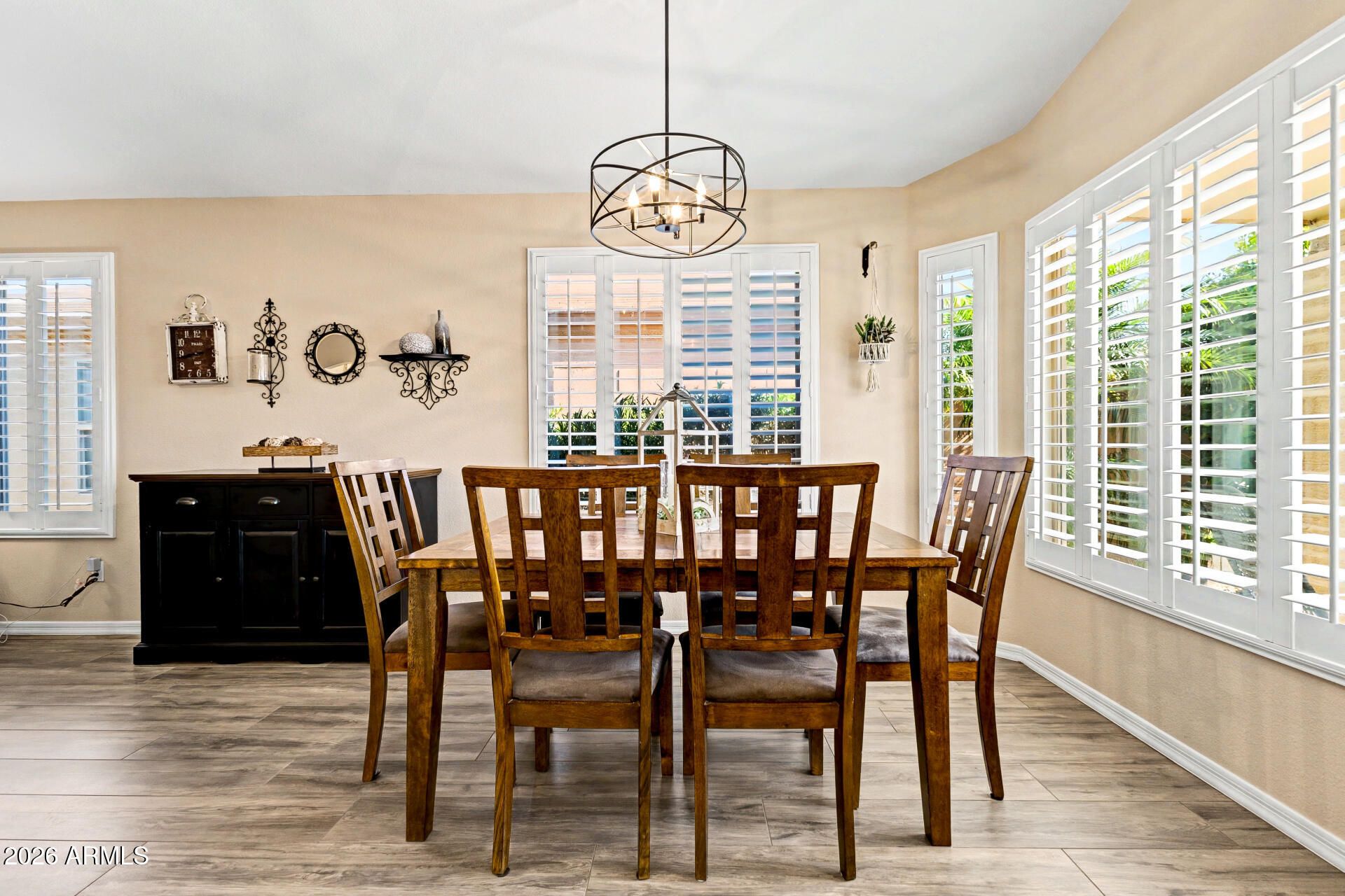 Welcome to Solera, South Chandler's Premier 55+ Community! Surrounded by serene views of the San Tan Mountains, Solera offers an exceptional active-adult lifestyle with world-class amenities including a fitness center, game room, pickleball and tennis courts, heated pools and spa, plus an 18-hole golf course -- offering an ideal blend of recreation and relaxation. This stunning, move-in ready Oasis model blends warmth and modern comfort with new plank tile flooring, plantation shutters, refreshed neutral interior paint, newer carpet in the bedrooms, soaring ceilings, and abundant natural light throughout. The kitchen features light cabinetry, gorgeous granite countertops, and ample storage. The spacious primary suite serves as a private retreat with a generous ensuite bath, while the guest bedroom provides an inviting space for visiting family and friends. A versatile den/office showcases a custom built-in wall and desk unit, ideal for working from home or pursuing hobbies. Step outside to your covered patio complete with a firepit and extended seating areas -- perfect for relaxing or entertaining year-round under Arizona skies. Whether you're a full-time resident or seeking the ideal lock-and-leave winter escape, this home delivers style, ease, and effortless desert living. Conveniently located near shopping, dining, and freeway access, it's all here!