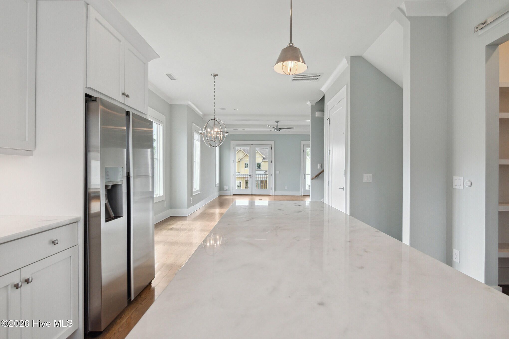What a view! One of the few townhomes with a water view of the Cape Fear River and an adjacent lawn. This custom home, built by award-winning PBC Design, is a coveted end-unit that includes a floor plan that was lengthened by 2 feet on each level, enlarging each of the living areas and primary bedroom. Also unique are the 2 covered decks that were extended to span the entire width of the home (20 feet), providing ample space to enjoy the river view and spectacular sunsets from the top 2 levels. Luxury features in this fine home include hardwood floors (re-finished 3/26) throughout the living areas and bedrooms, abundant moldings, 10 ft and 9 ft ceilings, 8ft doors, an elevator accessible to all levels, high-end custom blinds on the windows and doors (some remote controlled). Miele appliances, 2 car garage, 3.5 bathrooms. Whole home generator. Freshly painted! First floor can also be used as 3rd Bedroom. Marina village is a community with restaurants, walking trails, shopping, community pool and fitness center.